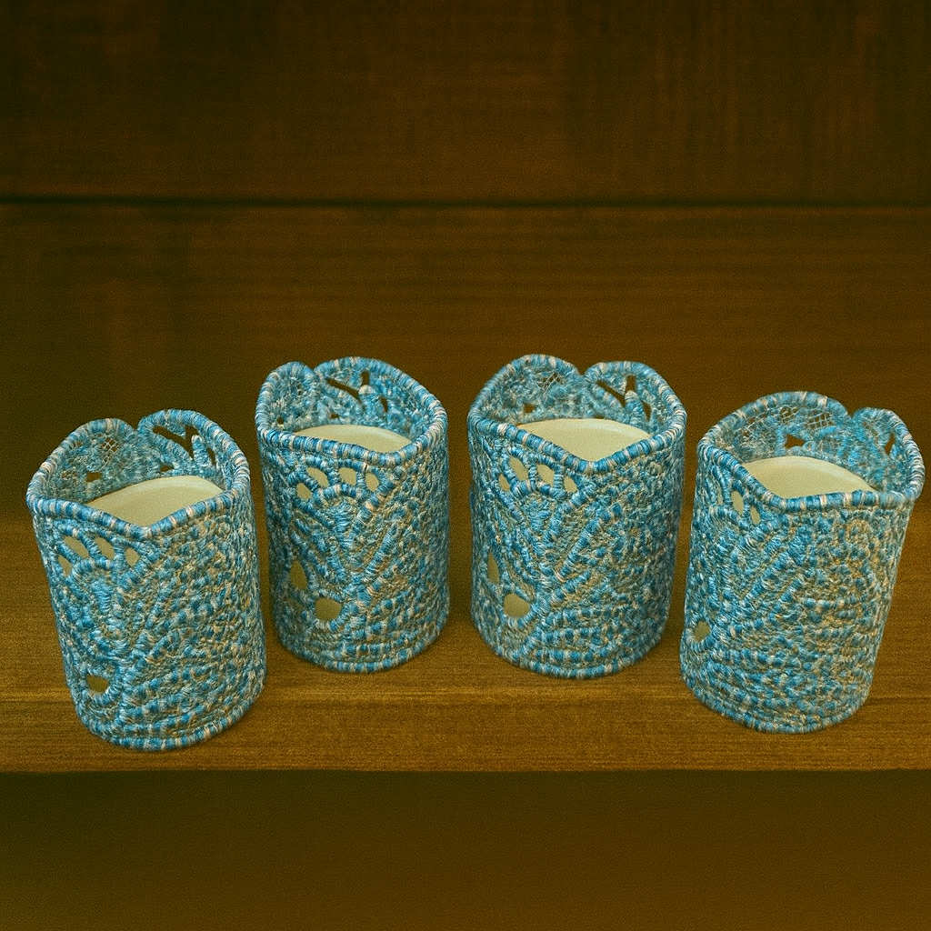 Bring cozy charm and soft glow to your home with these embroidered flameless candle wraps, made with a variegated blue and white embroidery thread, the perfect touch of warmth without the worry of open flames.