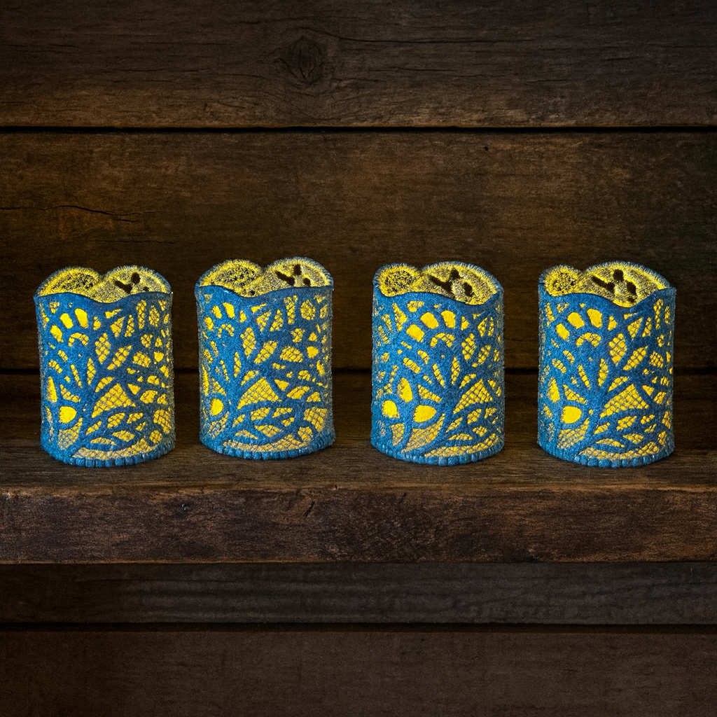 Each wrap is crafted from sturdy, freestanding lace embroidery featuring floral and leaf patterns. The design allows the candlelight to shine through beautifully. Candle included!