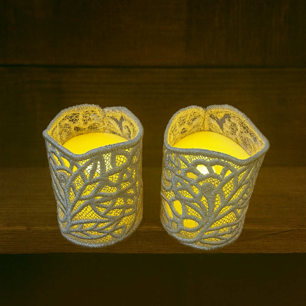 Bring cozy charm and soft glow to your home with these embroidered flameless candle wraps, made with a silver embroidery thread— the perfect touch of warmth without the worry of open flames.