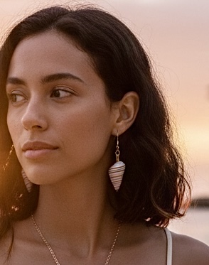 These earrings are made of lightweight “candy cane” shells with a white background and thin stripes of yellow, brown, gray, black, and tan, which go with just about any outfit. A matching pendant is available in another listing in the Pendants section, and a matching set can be found in the Sets section.