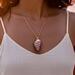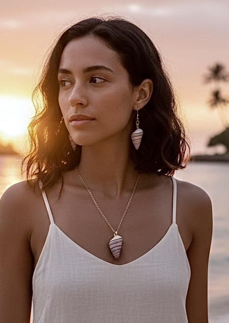 The centerpiece is a naturally striped shell pendant which is paired with matching genuine shell drop earrings that offer a lightweight, organic feel. Each shell is carefully cleaned and polished to reveal its natural luster while maintaining its authentic seaside character.