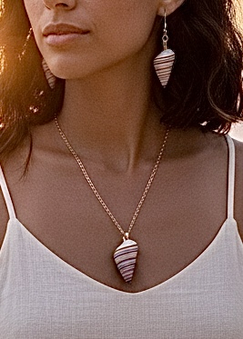 This pendant and earrings set is made with lightweight “candy cane” shells that have a white background and thin stripes of yellow, brown, gray, black, and tan, which go with just about any outfit. The pendant comes with a stainless steel and rose gold plated chain and clasp, and is 20” long.