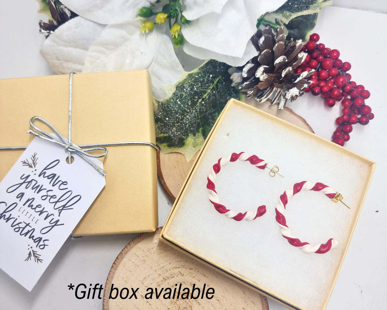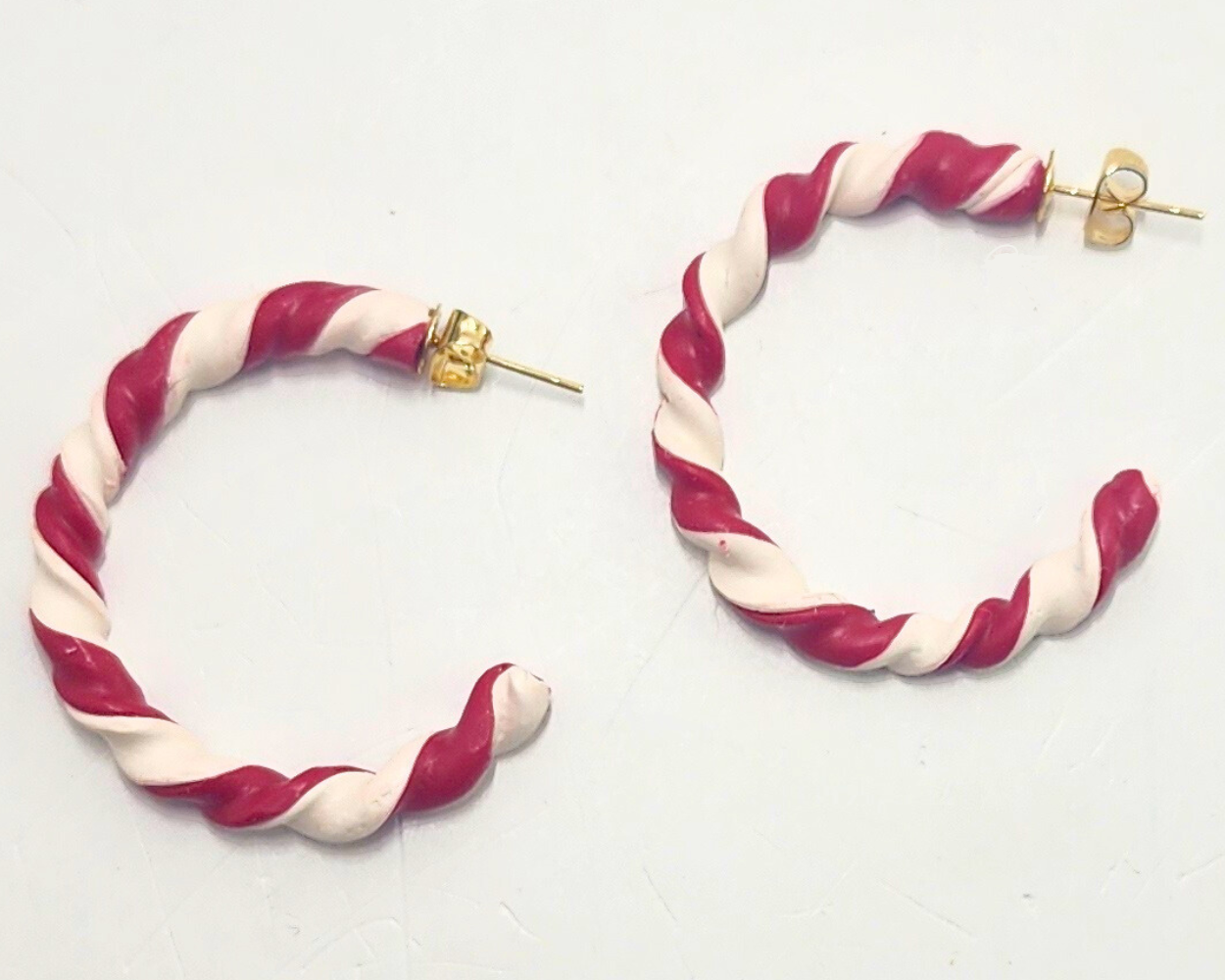 Add a festive pop of cheer to your holiday wardrobe with these handmade candy-cane twist hoop earrings! Each pair is crafted from high-quality polymer clay in classic red and white swirls, shaped into playful hoops that feel both fun and stylish. Lightweight and comfortable for all-day wear, they’re perfect for holiday parties, winter outfits, or gifting to someone special.