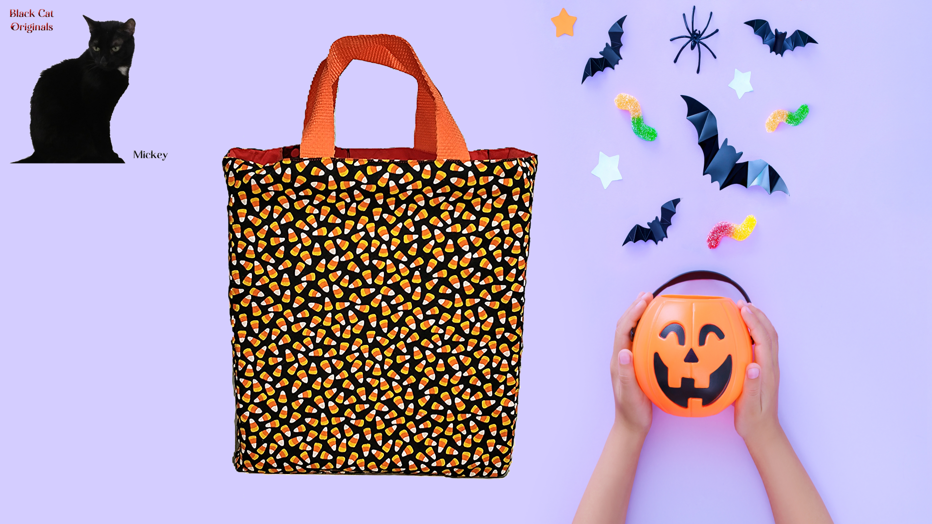 This is a small tote with a fun Halloween theme! It is 100% cotton except for the nylon handle and measures 11 inches tall by 9 inches wide and 4 inches deep. Just the right size for a night's worth of trick or treating. It's reusable, too! Machine wash/dry. Linings and handles vary.