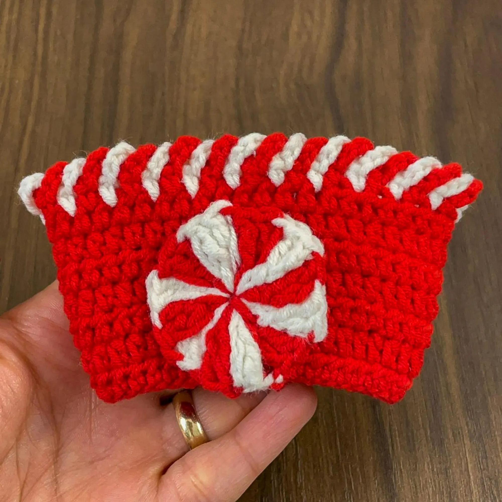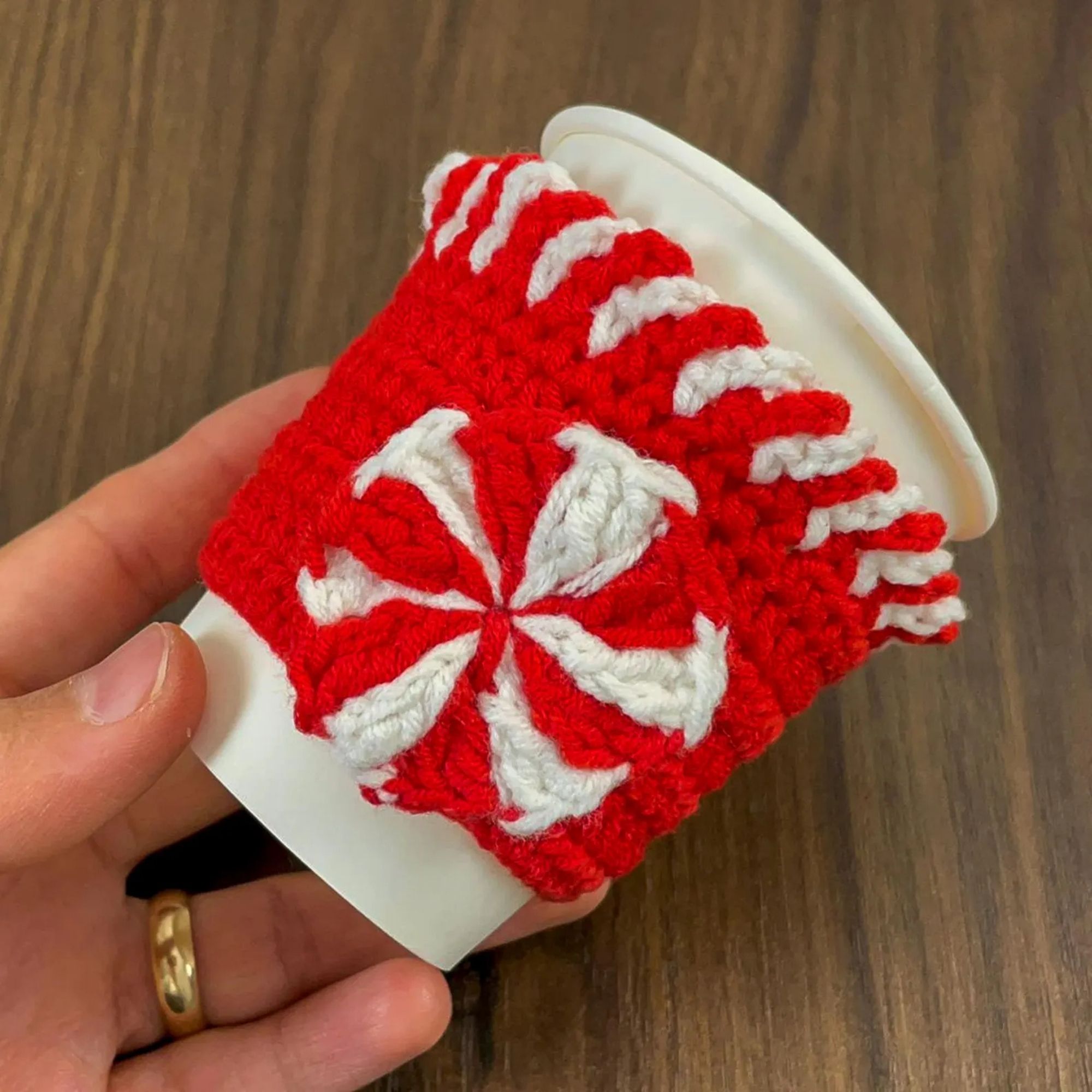Create a festive holiday cup cozy featuring a classic peppermint swirl motif and a beautiful two-color loop detail. This cozy design adds a warm handmade touch to your winter drinks and makes a wonderful seasonal gift idea for friends, family, or holiday gatherings.