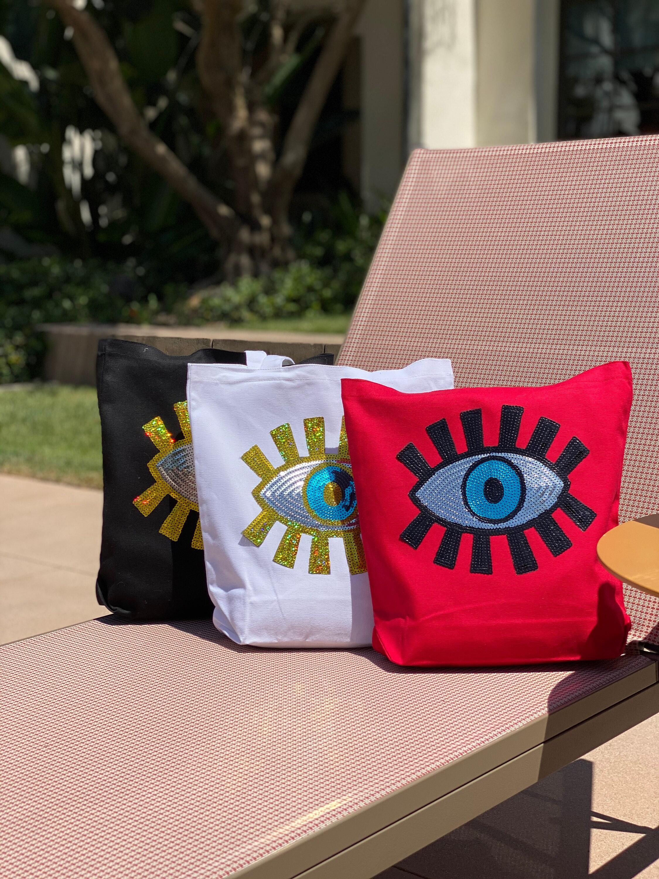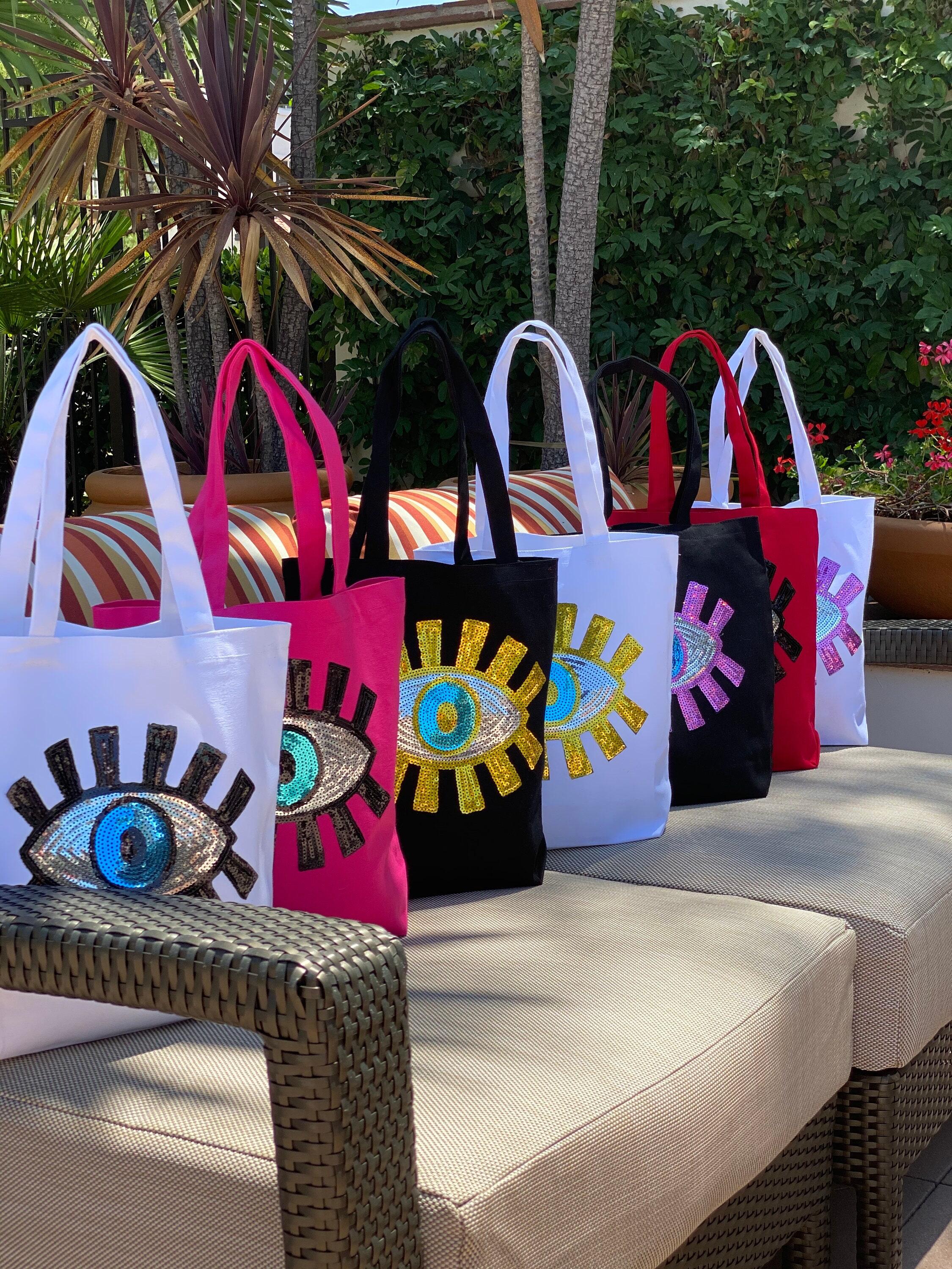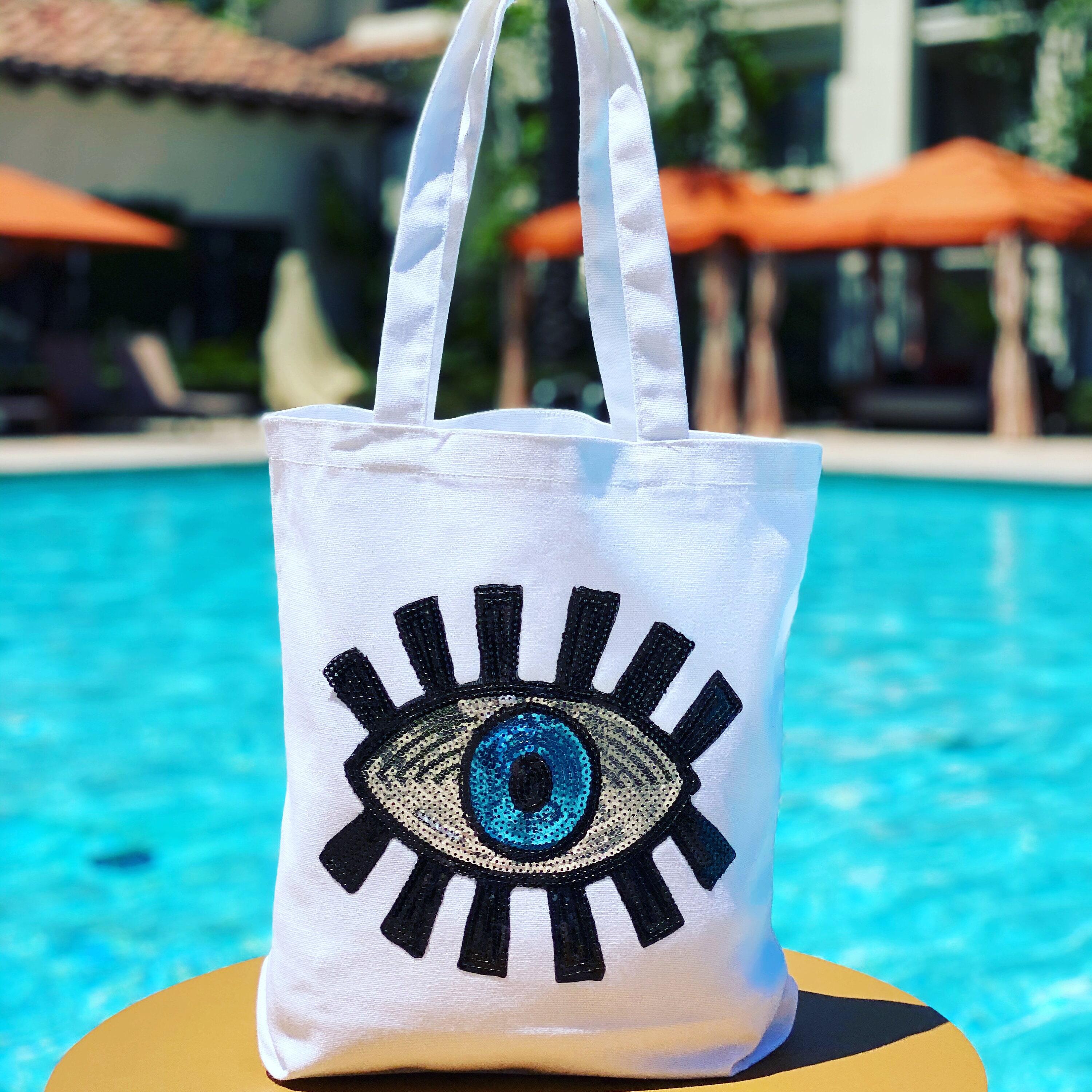 Canvas Beach Tote Bags, Eco Friendly Sustainable Cotton Bags, Sequins Evil Eye, Gusset Bags Flat Bottom, Heavy Canvas Bag, Gift For Her