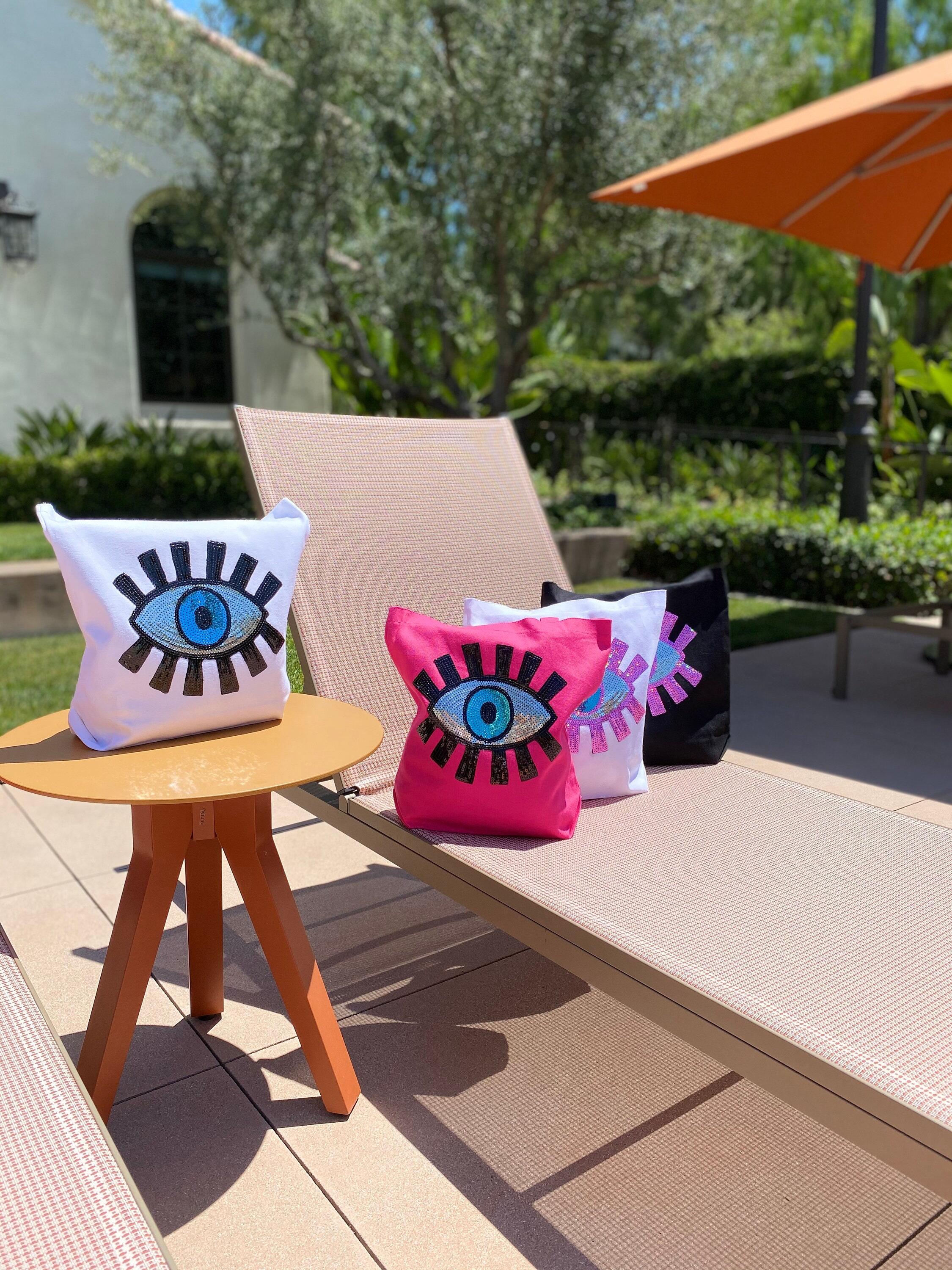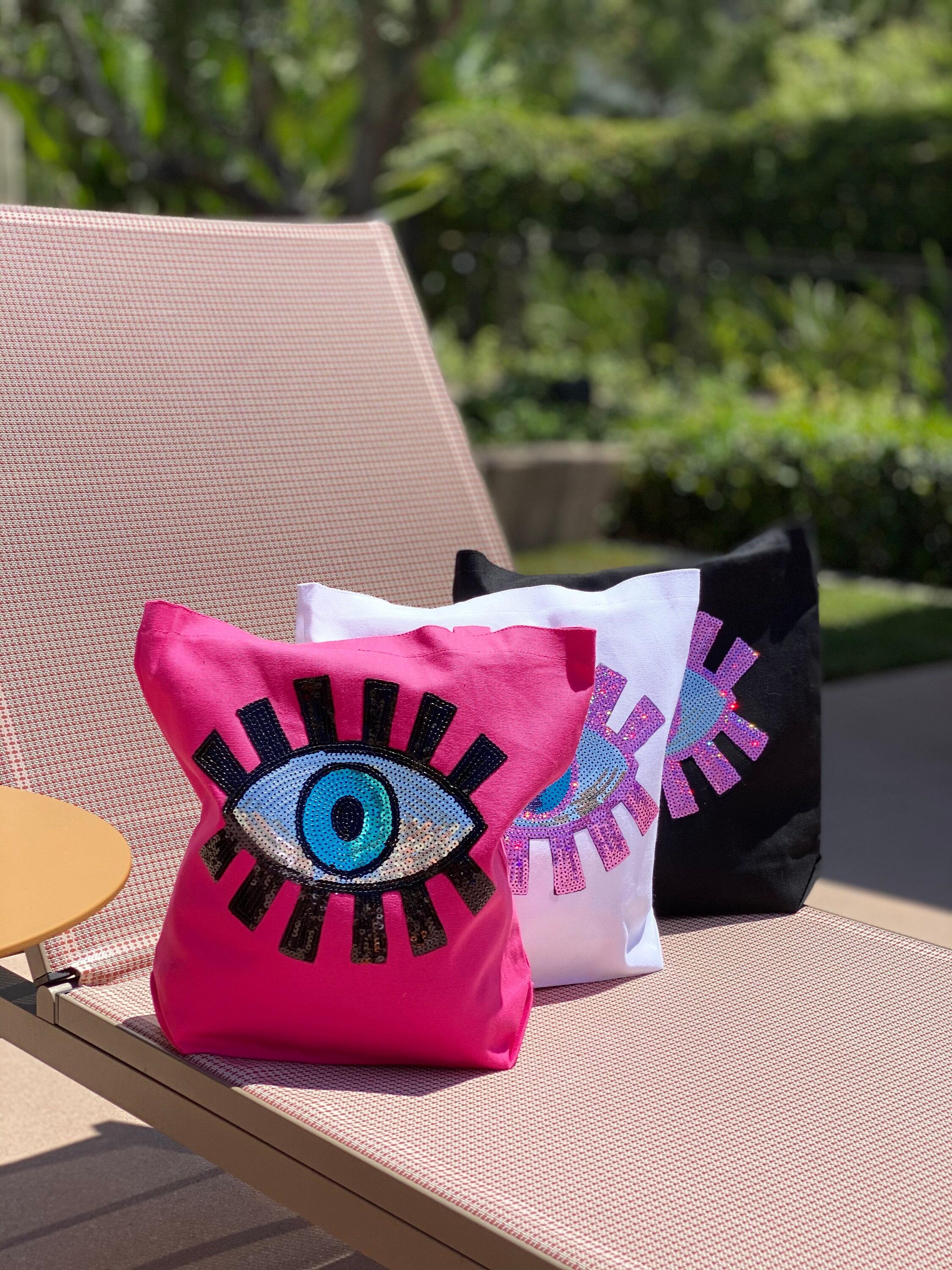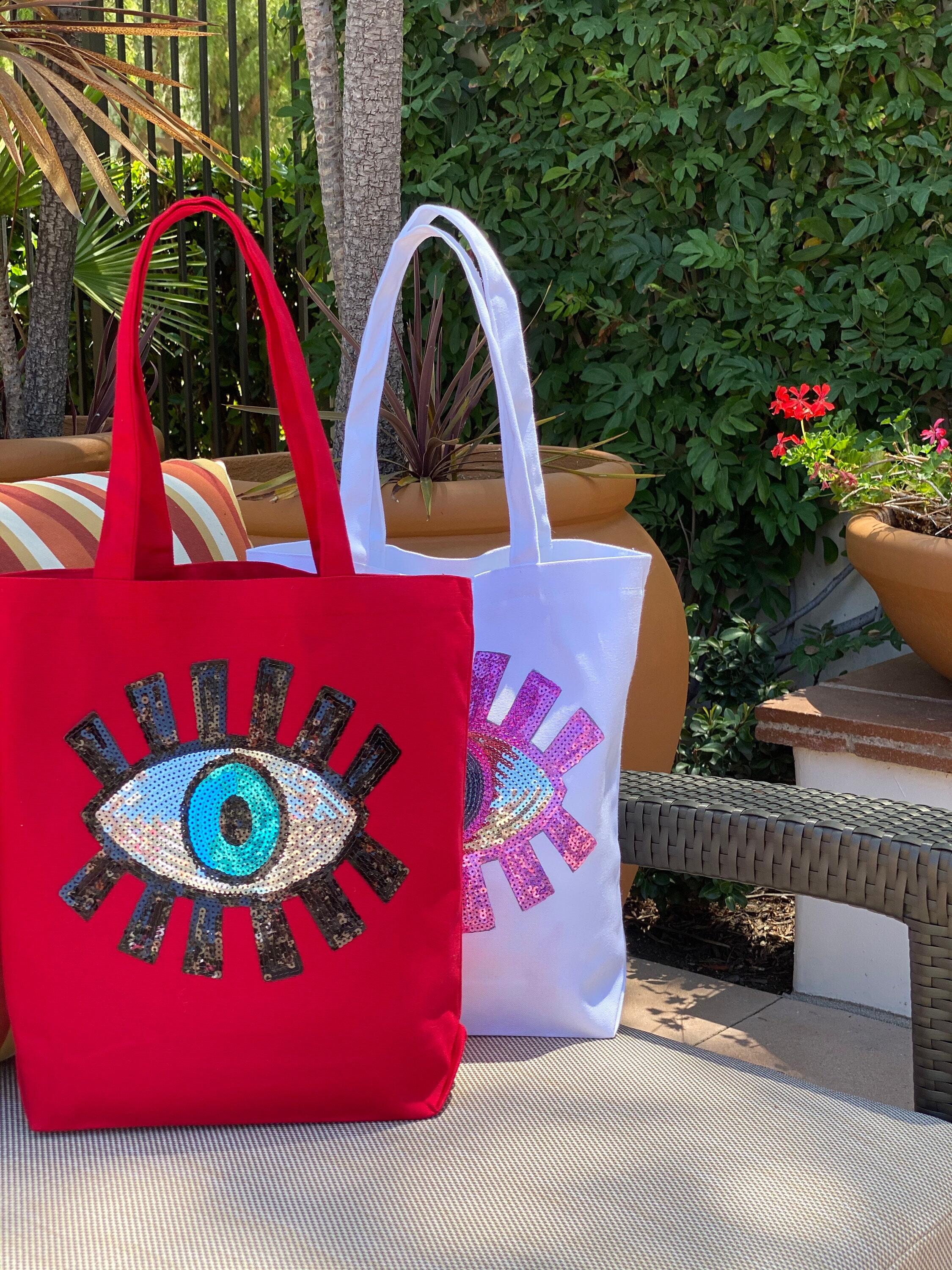 Canvas Beach Tote Bags, Eco Friendly Sustainable Cotton Bags, Sequins Evil Eye, Gusset Bags Flat Bottom, Heavy Canvas Bag, Gift For Her
