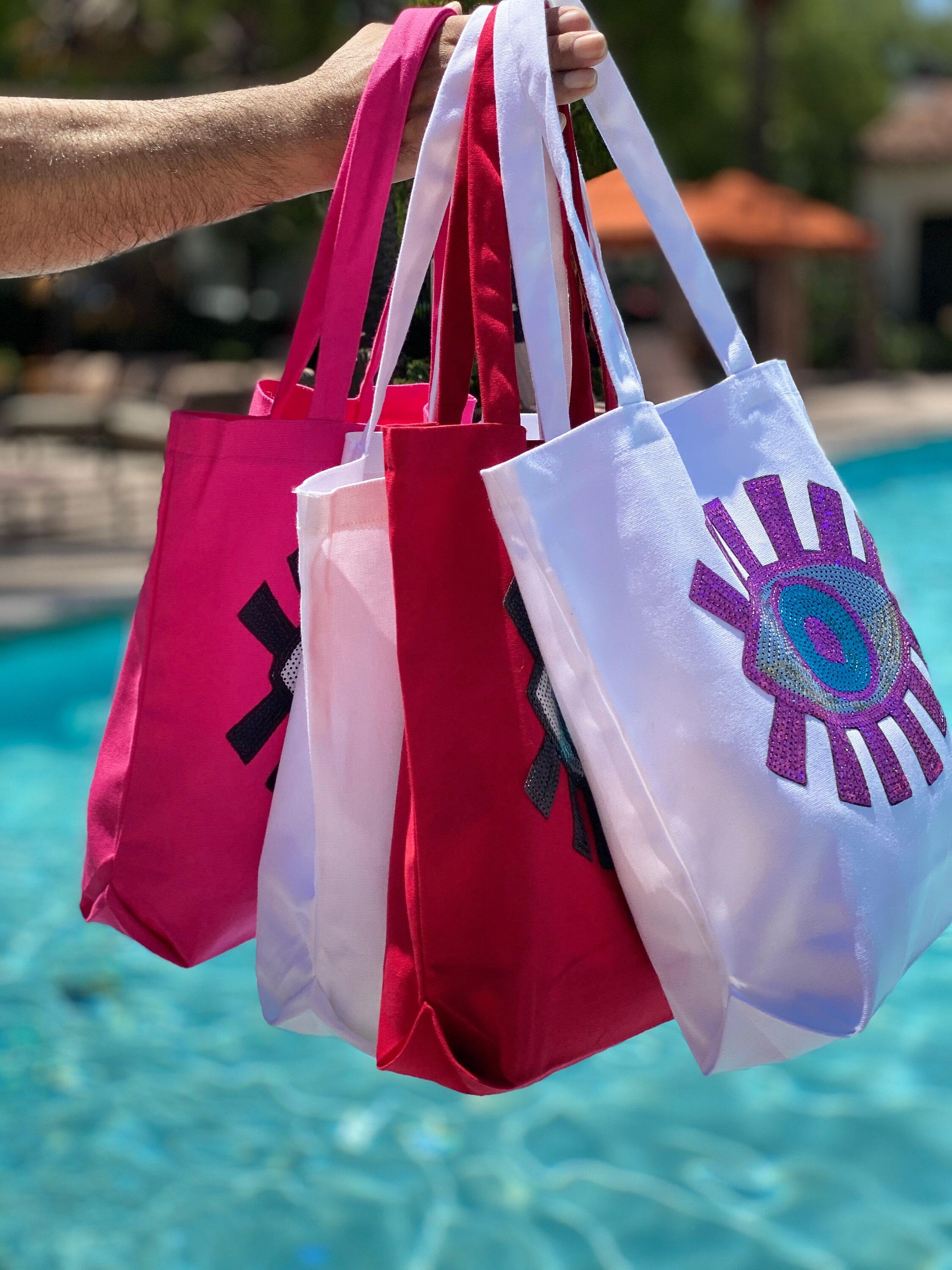 Canvas Beach Tote Bags, Eco-Friendly Sustainable Cotton Bags, Sequins Evil Eye, Gusset Bags Flat Bottom, Heavy Canvas Bag, Gift For Her Canvas beach tote bags, eco-friendly sustainable cotton bags can be used also as a beach or grocery bag. These woven bags are constructed with a premium solid canvas material ad designed with two matching handles for carrying. Decorated this durable, reusable bag with high-quality sequins evil eye patch. Use as an everyday bag to set yourself part of eco-friendly life and apart from those carrying unnatural materials bags. Details: Length: 13 1/4" Width: 13 1/4" Thickness: 3 3/4" Handle Drop Length: 9" Total Length: 20'' Fast and Free shipping from the US 100% Authentic, made by Karens Line PACKAGING -Your purchase will come beautifully packaged. If you are ordering a gift and would like each piece to be packaged separately please let us know. -If this purchase is a gift, and you would like us to include a handwritten message, please leave a note in the box at checkout.