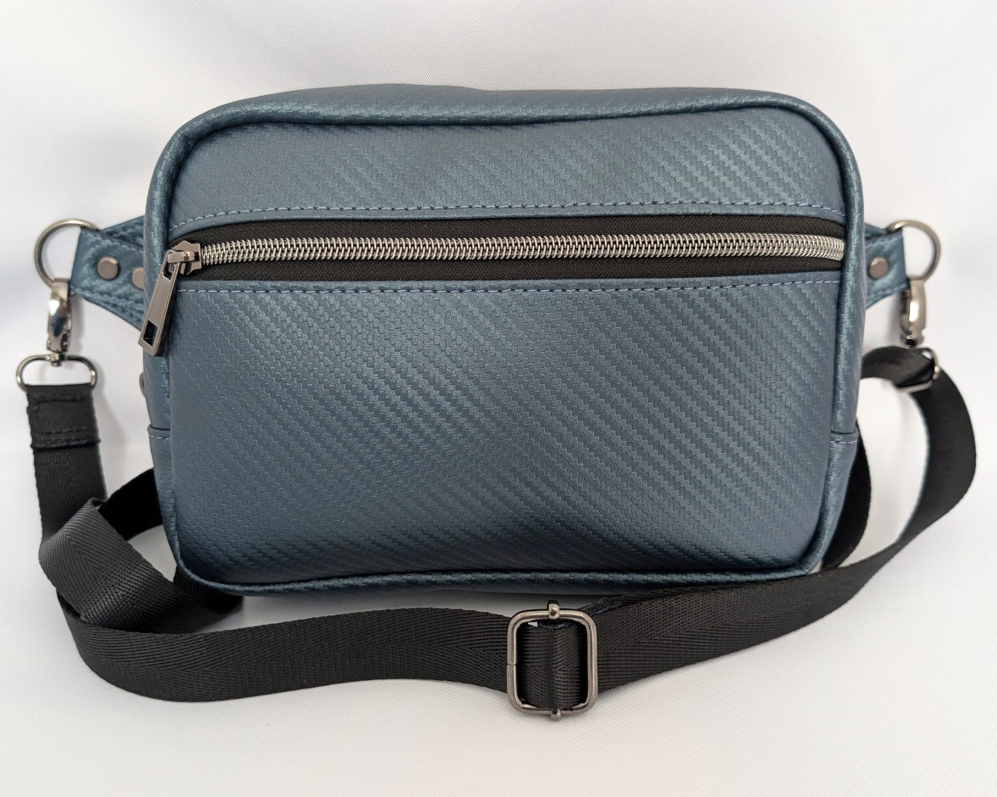The Rayna is a lightweight crossbody or waist bag perfect for carrying your essentials and leaving your hands free. I made this one from steel blue carbon fiber print vinyl with gun metal colored hardware. The front zip pocket is large enough for your phone and inside is a roomy slip pocket. The nylon strap is adjustable from 24" to 43.5". Fully lined with polyester ripstop. This style is suitable for a man or woman.