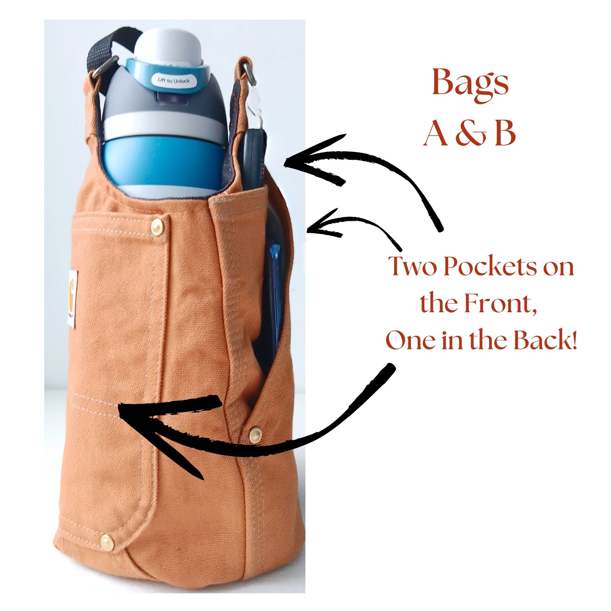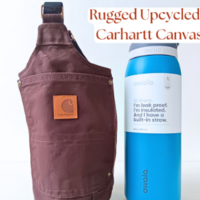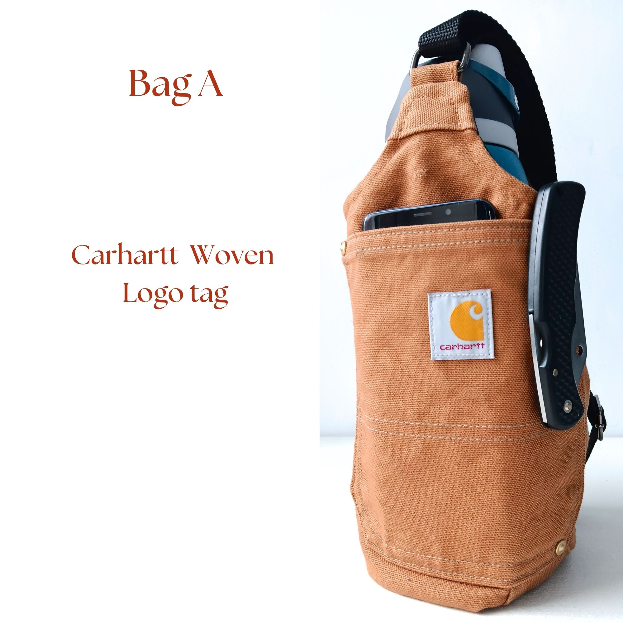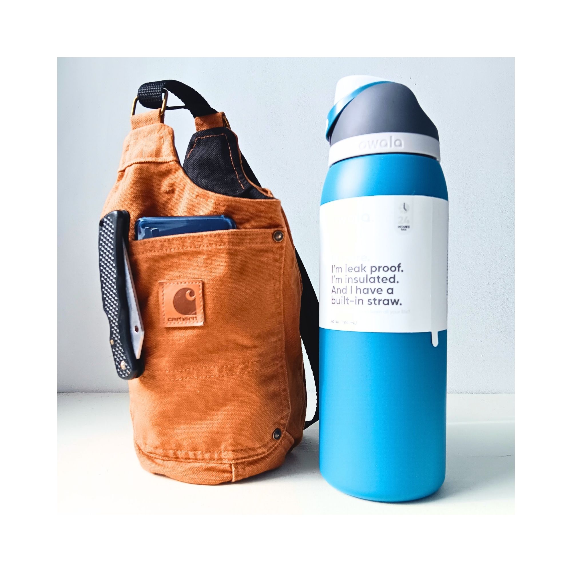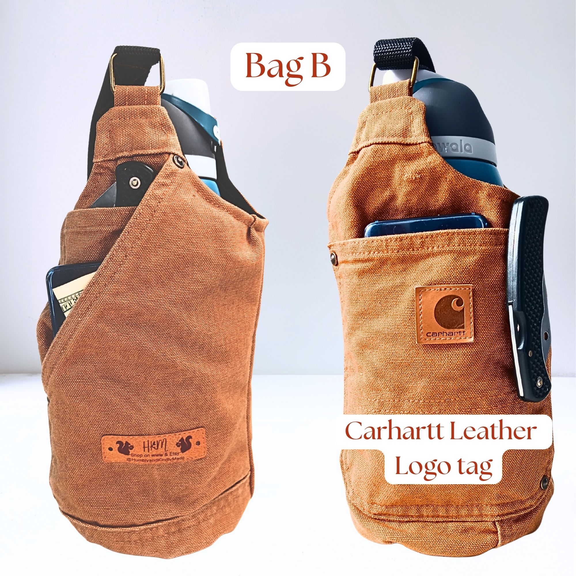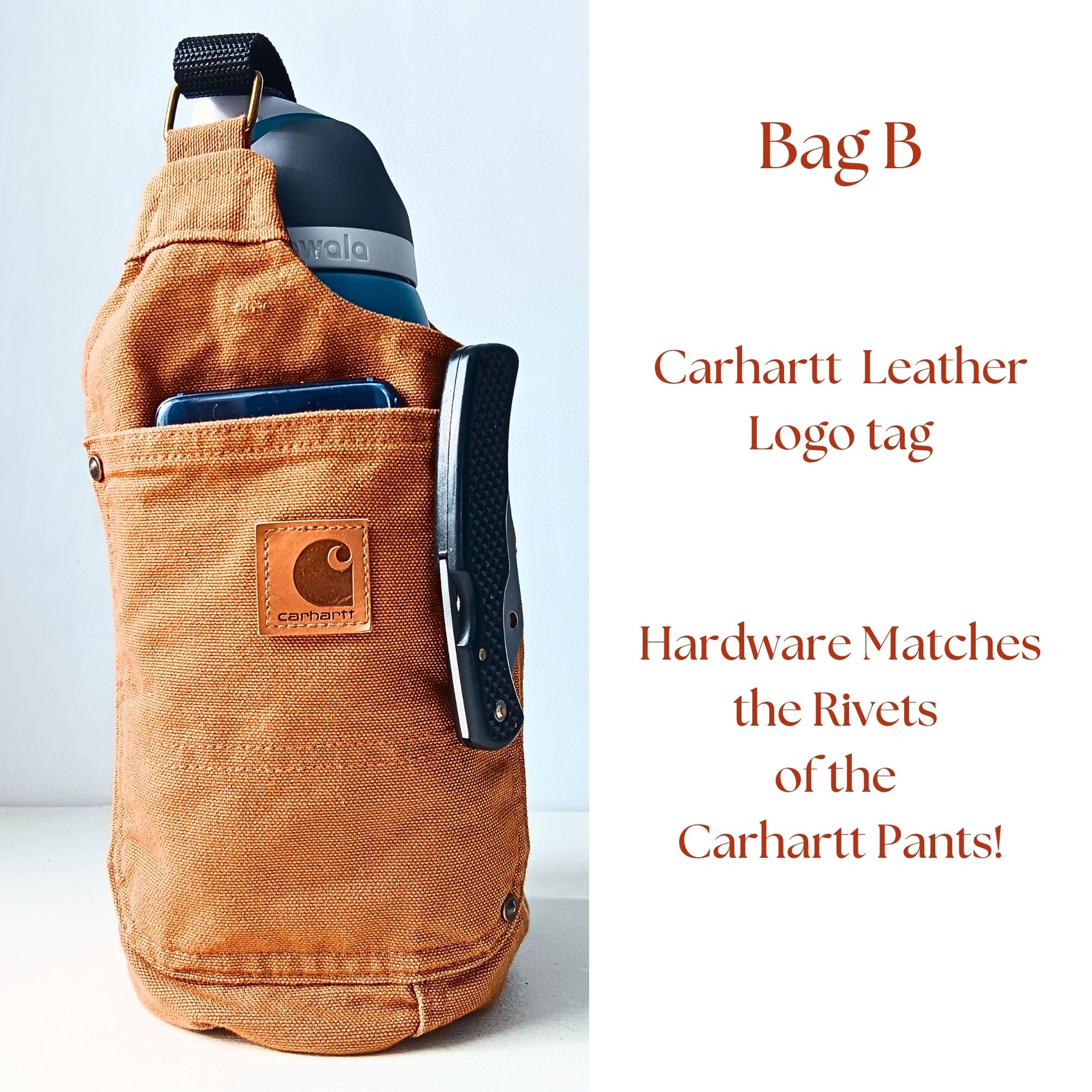 Rugged & practical bottle sling – handmade from upcycled Carhartt pants in rugged brown. Each bag is one-of-a-kind, with patched details that add character and strength.