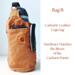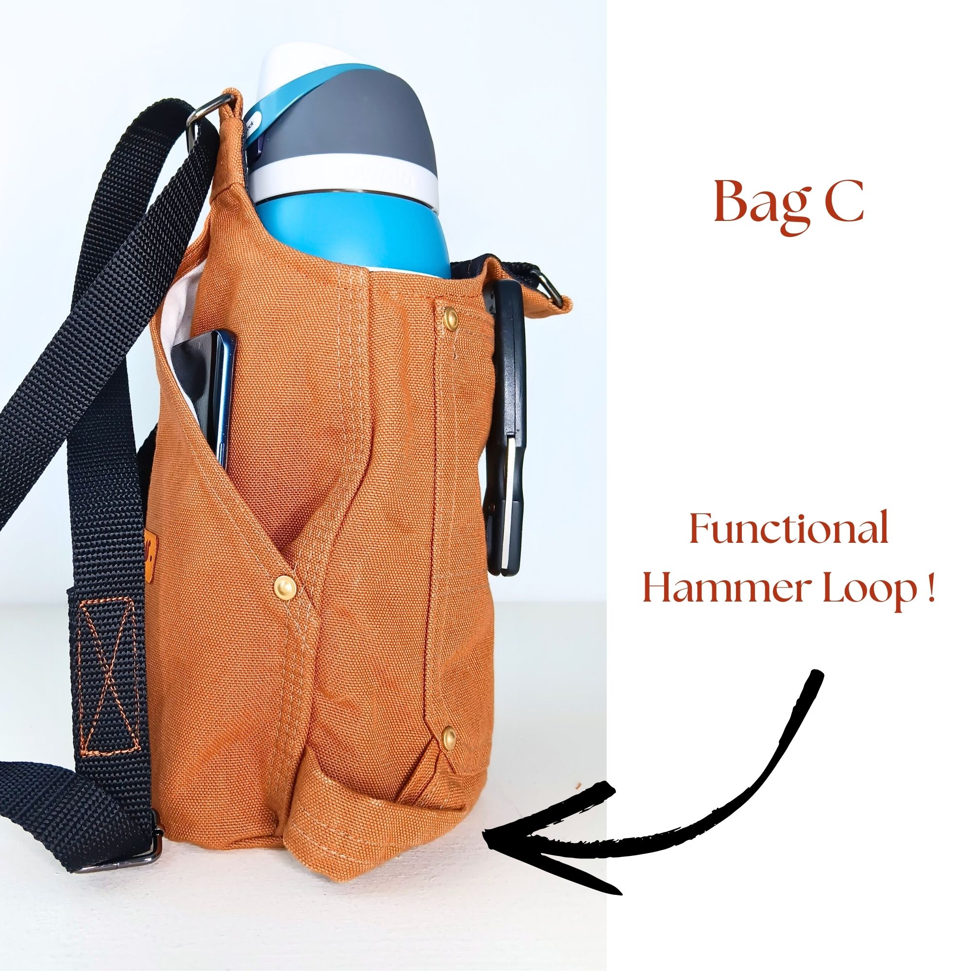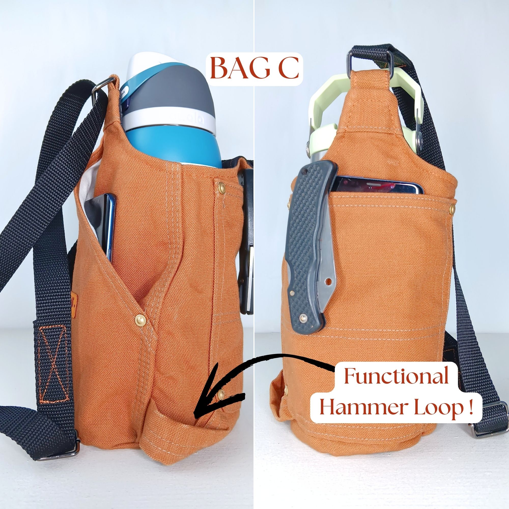 • Materials: Upcycled Carhartt pants, waterproof canvas & nylon webbing strap