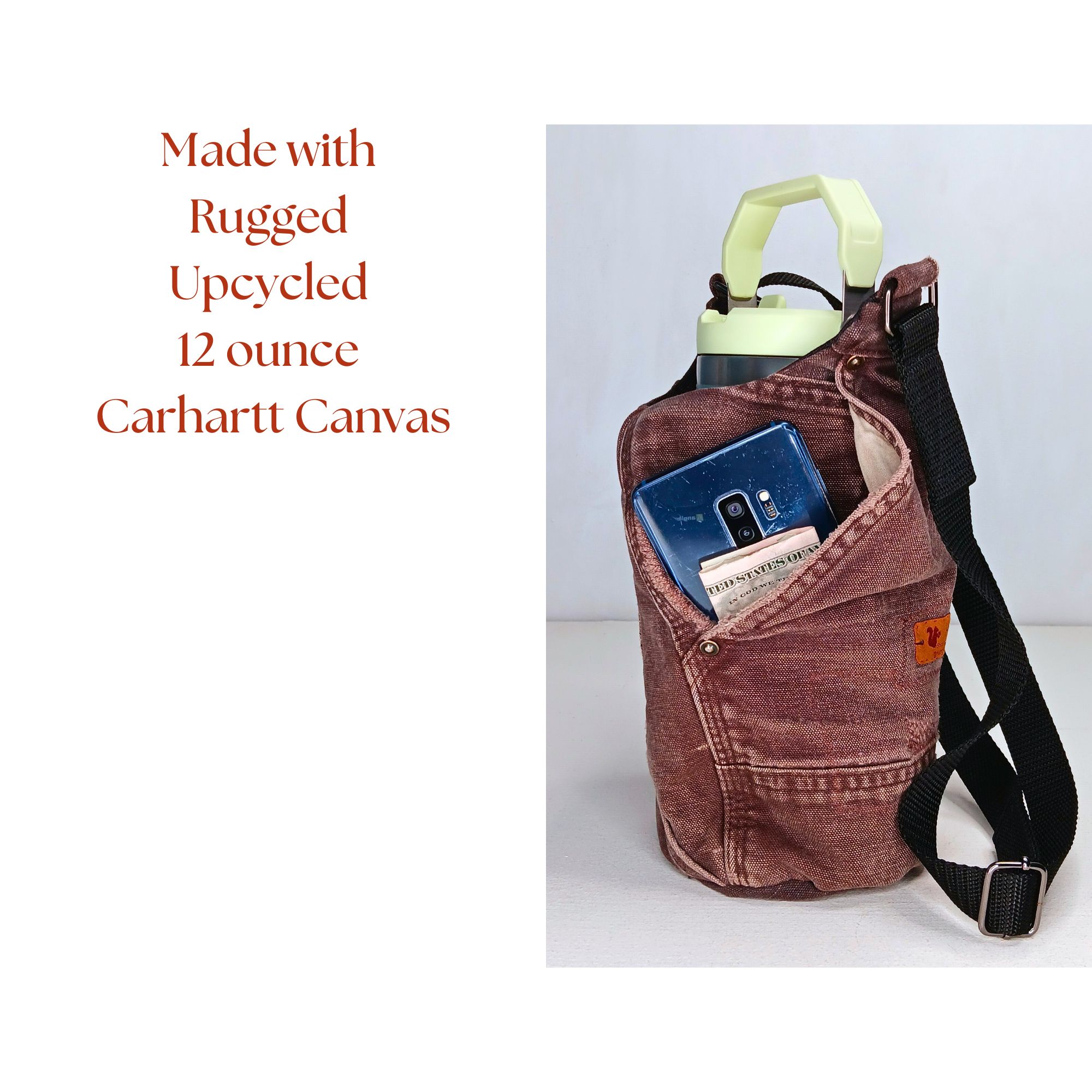 Carhartt Water Bottle Sling, Crossbody Tumbler Holder for Stanley/Owala 20–64 oz, Dark Brown Canvas Bag with Leather Logo, Waterproof Lining