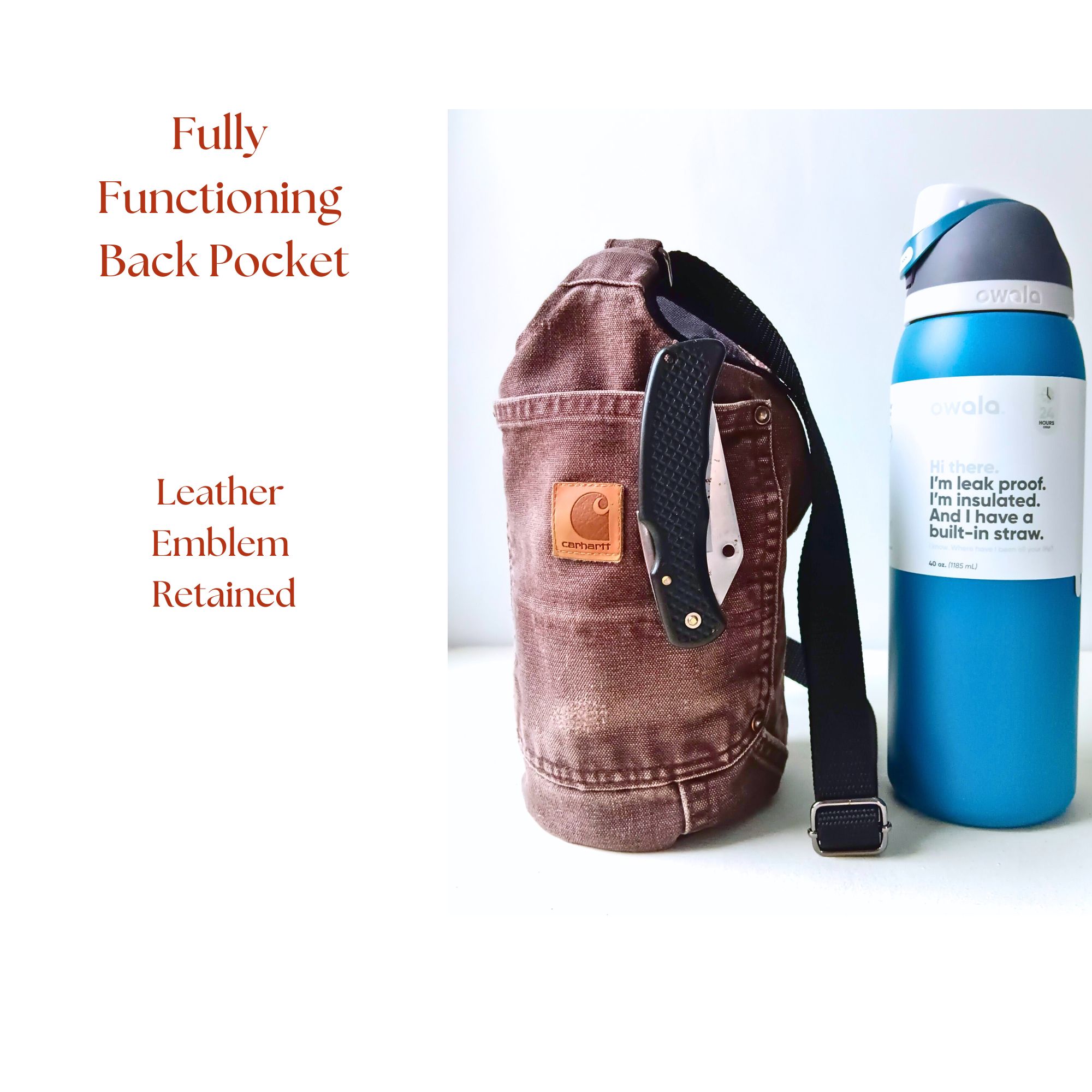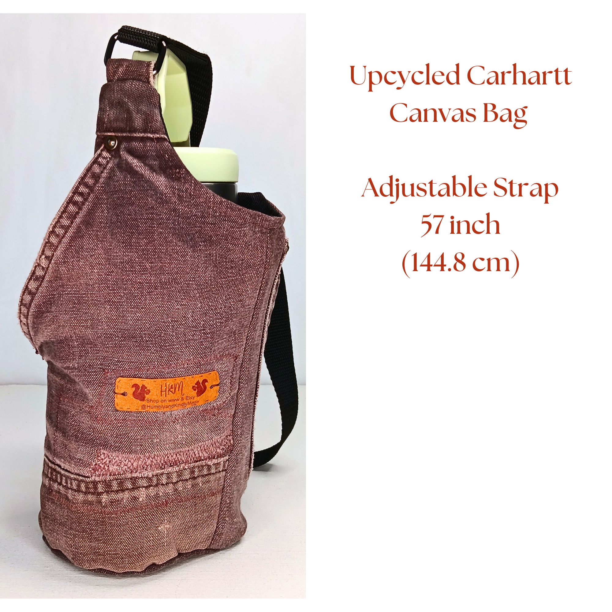 Rugged & practical bottle sling – handmade from upcycled Carhartt pants in rugged brown. Each bag is one-of-a-kind, with patched details that add character and strength.