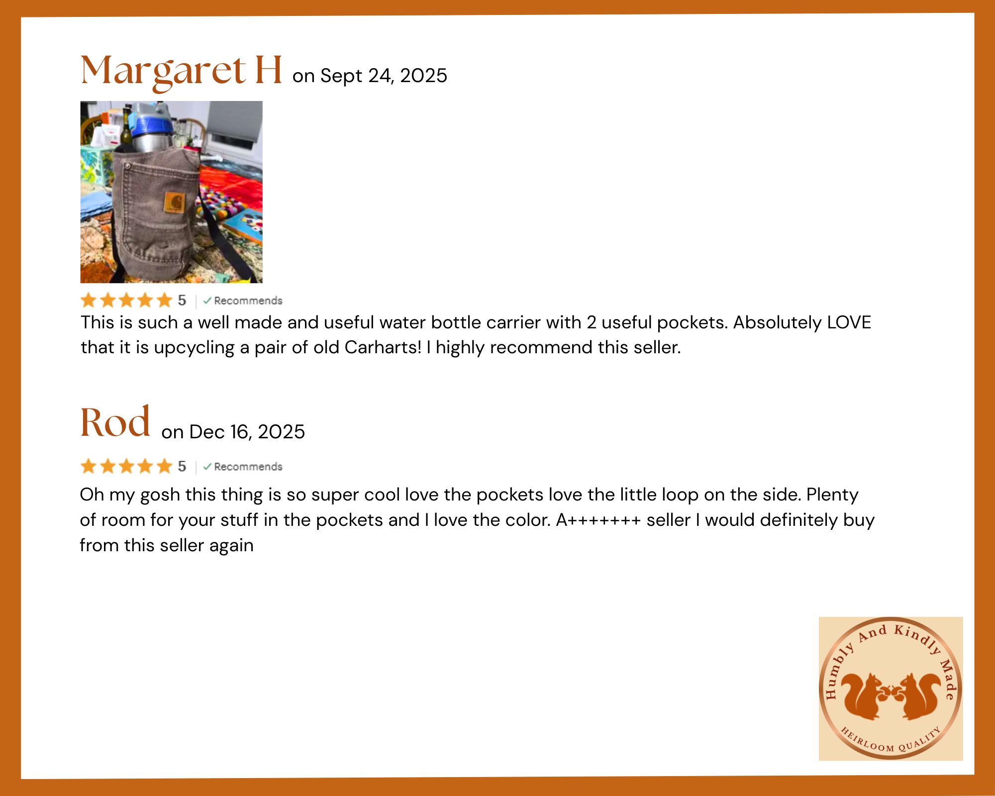 Sustainably crafted in my smoke-free home with attention to detail. Each bag is designed to be a reliable, stylish companion you’ll enjoy for years.