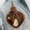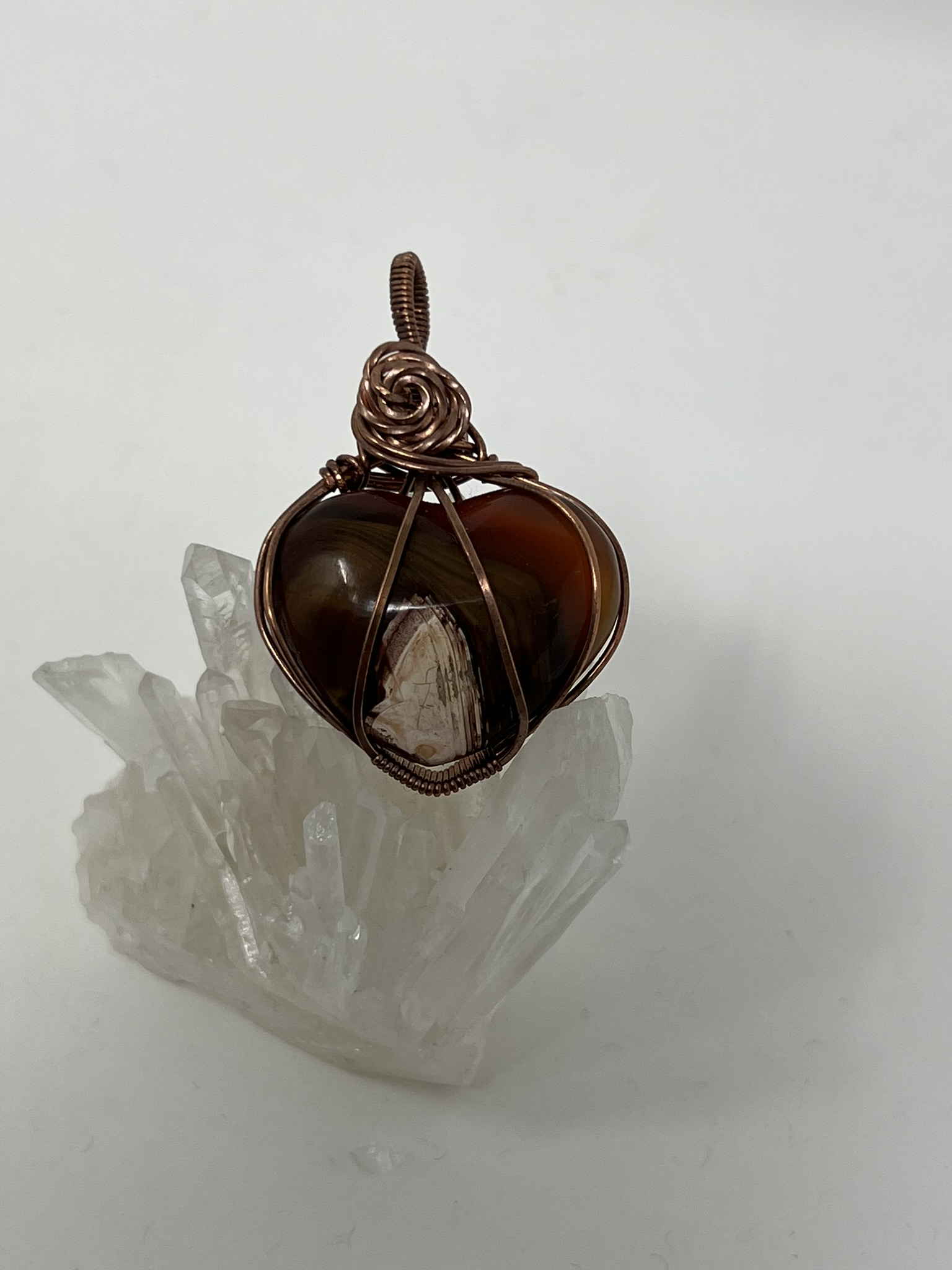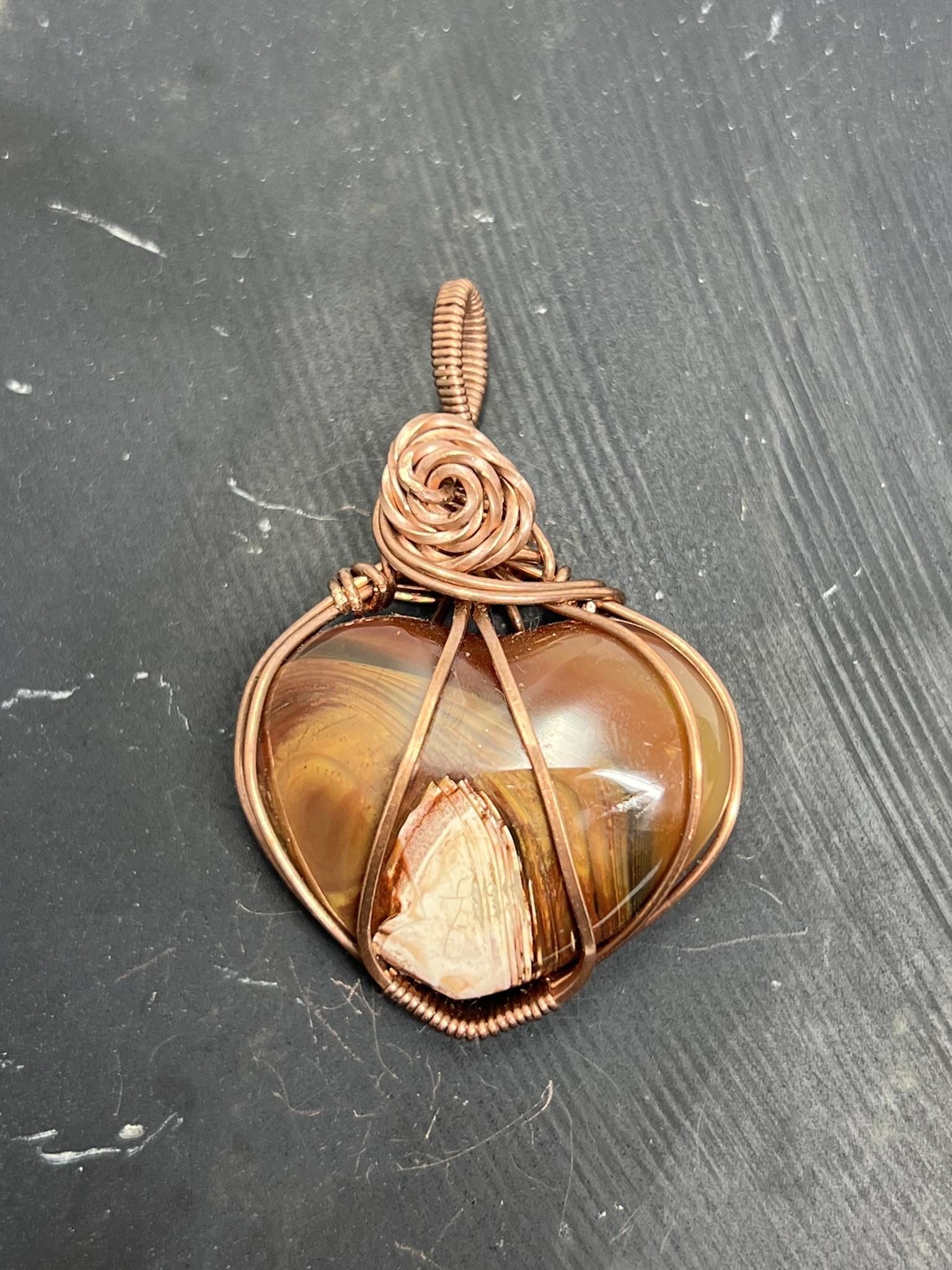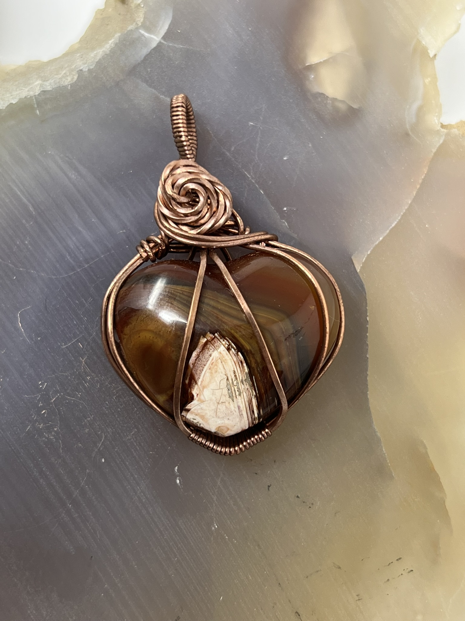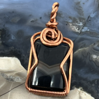 This cute pendant features an agate cabochon that has been wrapped in copper wire. It is wrapped in 4 pieces of 22 gauge round copper wire that is connected at the bottom with 28 gauge round copper wire. The bail is made by wrapping 28 gauge round wire around 2 pieces of the 22 gauge round copper wire. This piece is handmade in Minnesota.