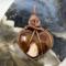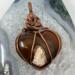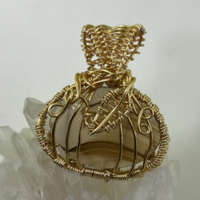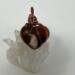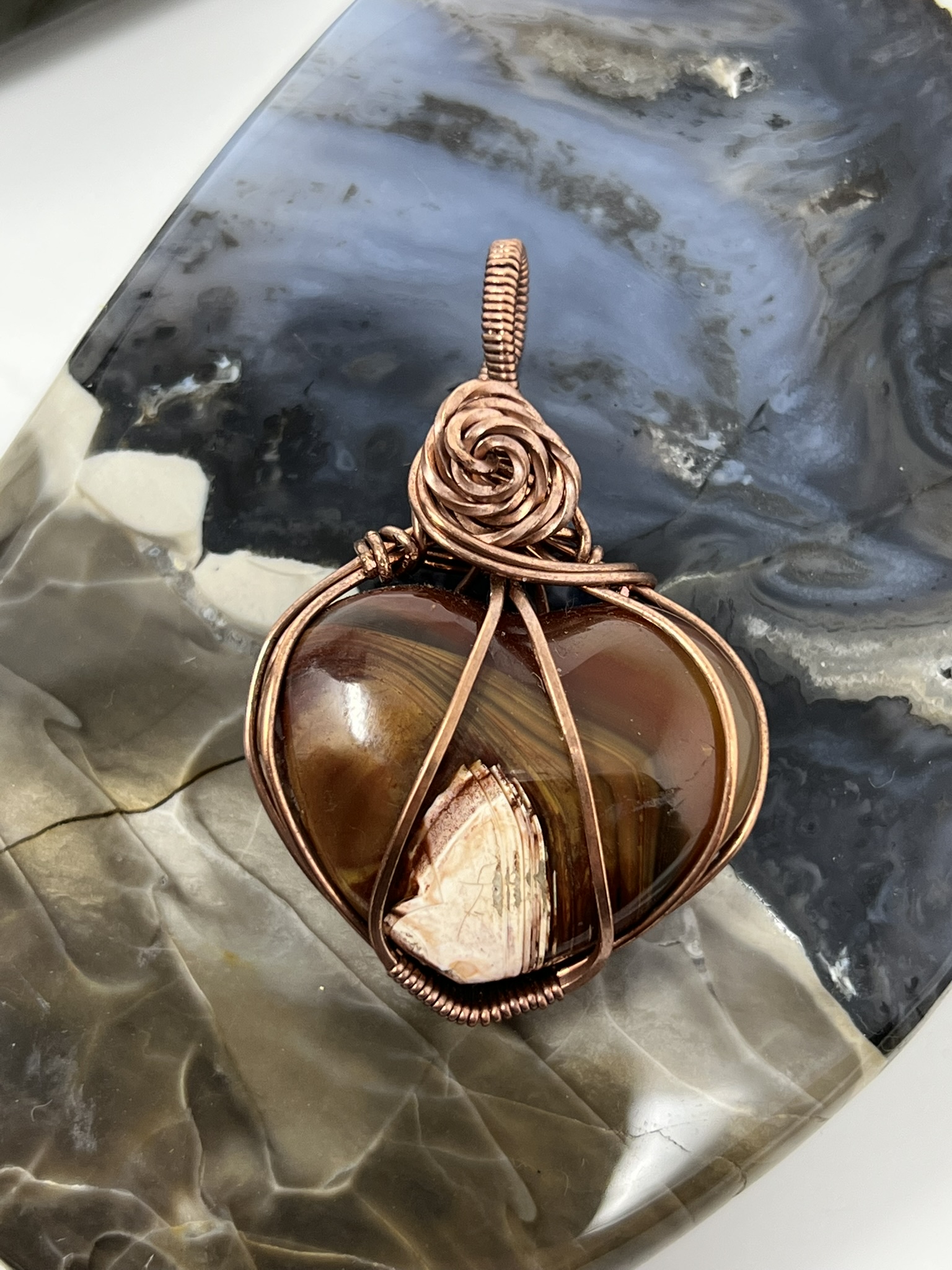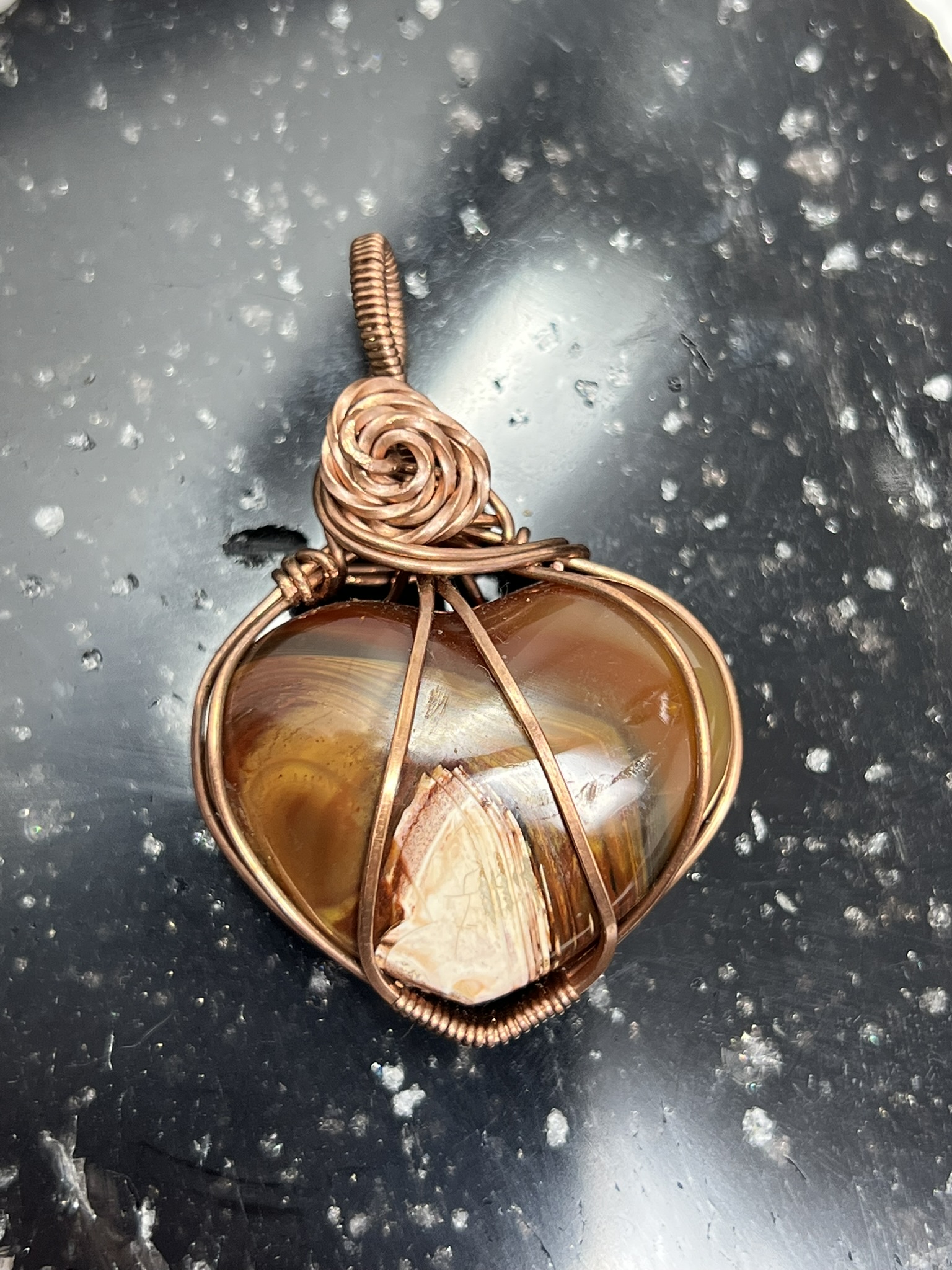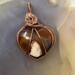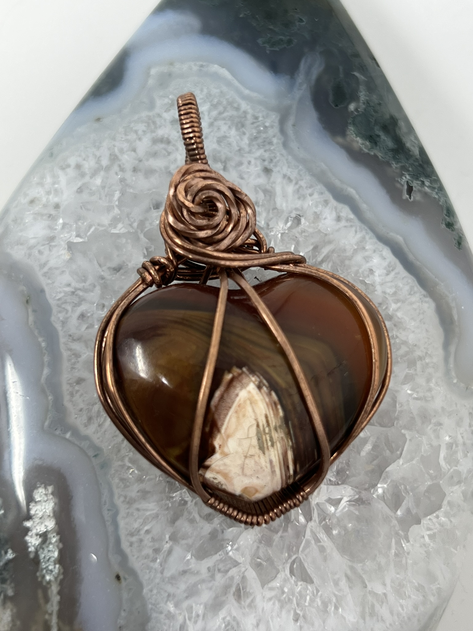 This cute pendant features an agate cabochon that has been wrapped in copper wire. It is wrapped in 4 pieces of 22 gauge round copper wire that is connected at the bottom with 28 gauge round copper wire. The bail is made by wrapping 28 gauge round wire around 2 pieces of the 22 gauge round copper wire. This piece is handmade in Minnesota.