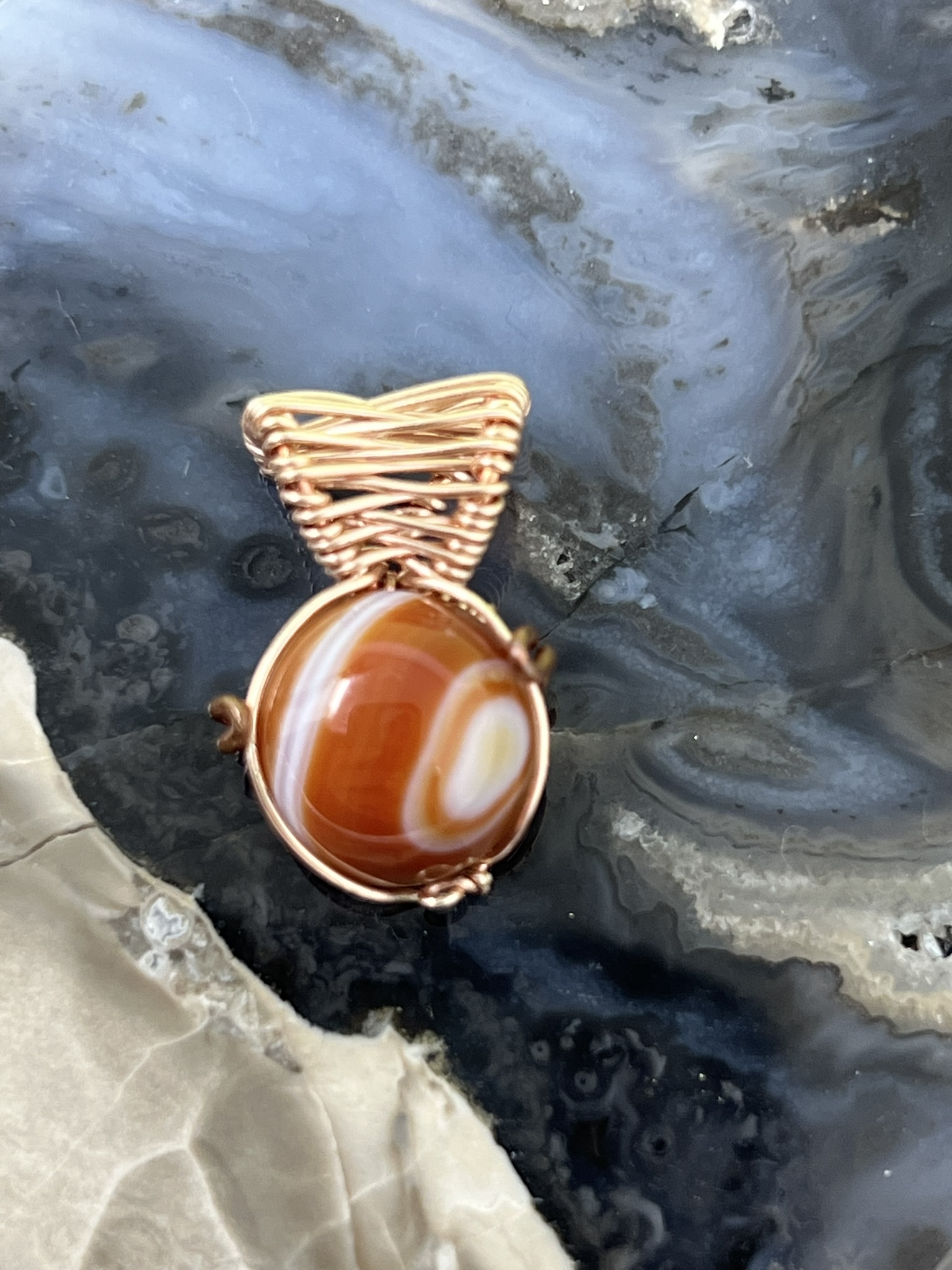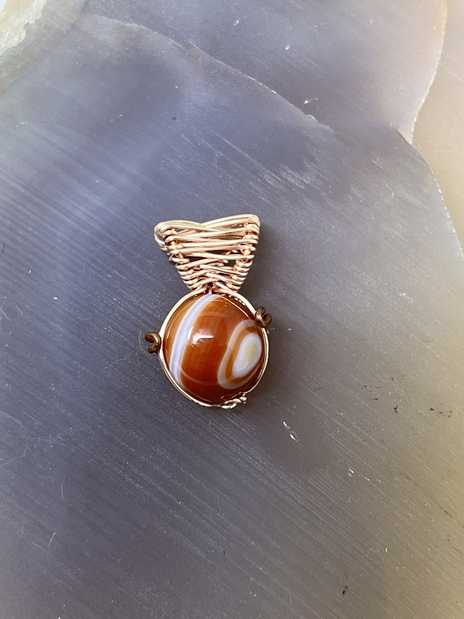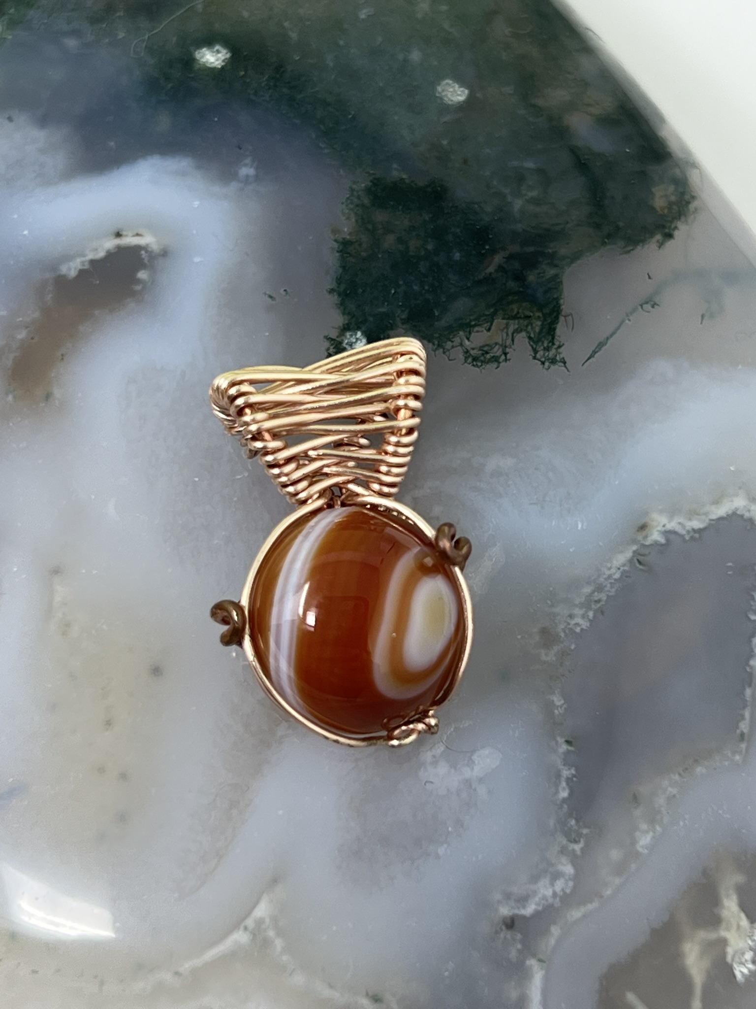 This beautiful pendant features a small carnelian agate cabochon that has been simply wrapped in rose gold colored copper wire. It is set in a prong type setting. This piece is handmade in Minnesota.