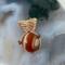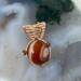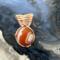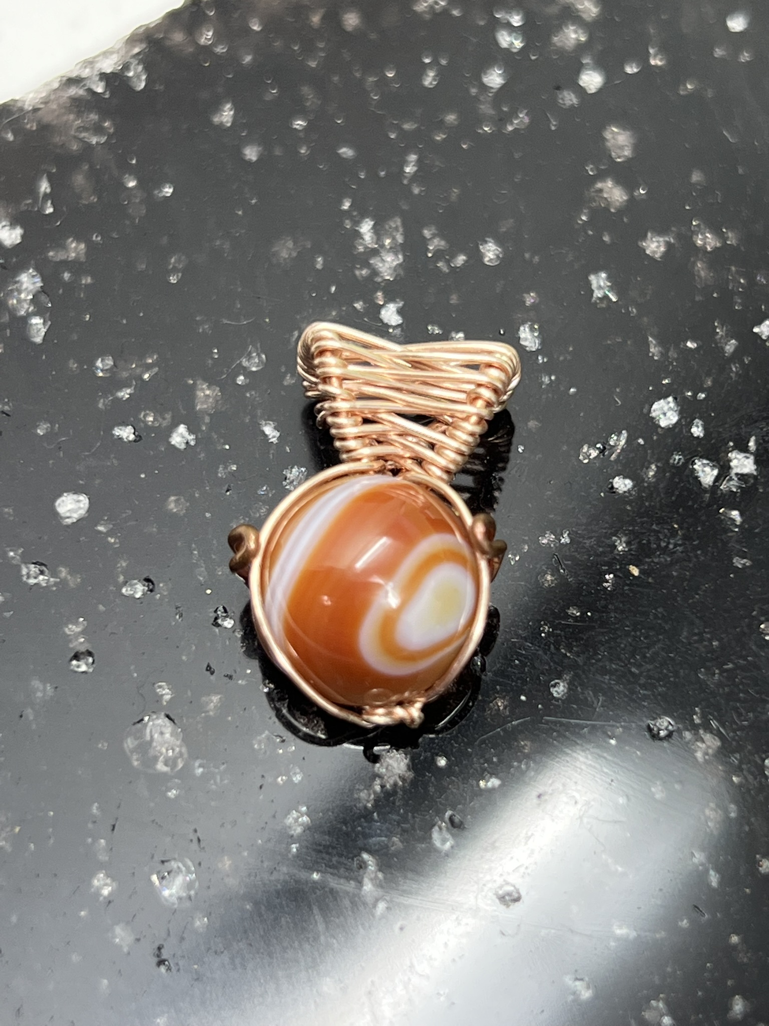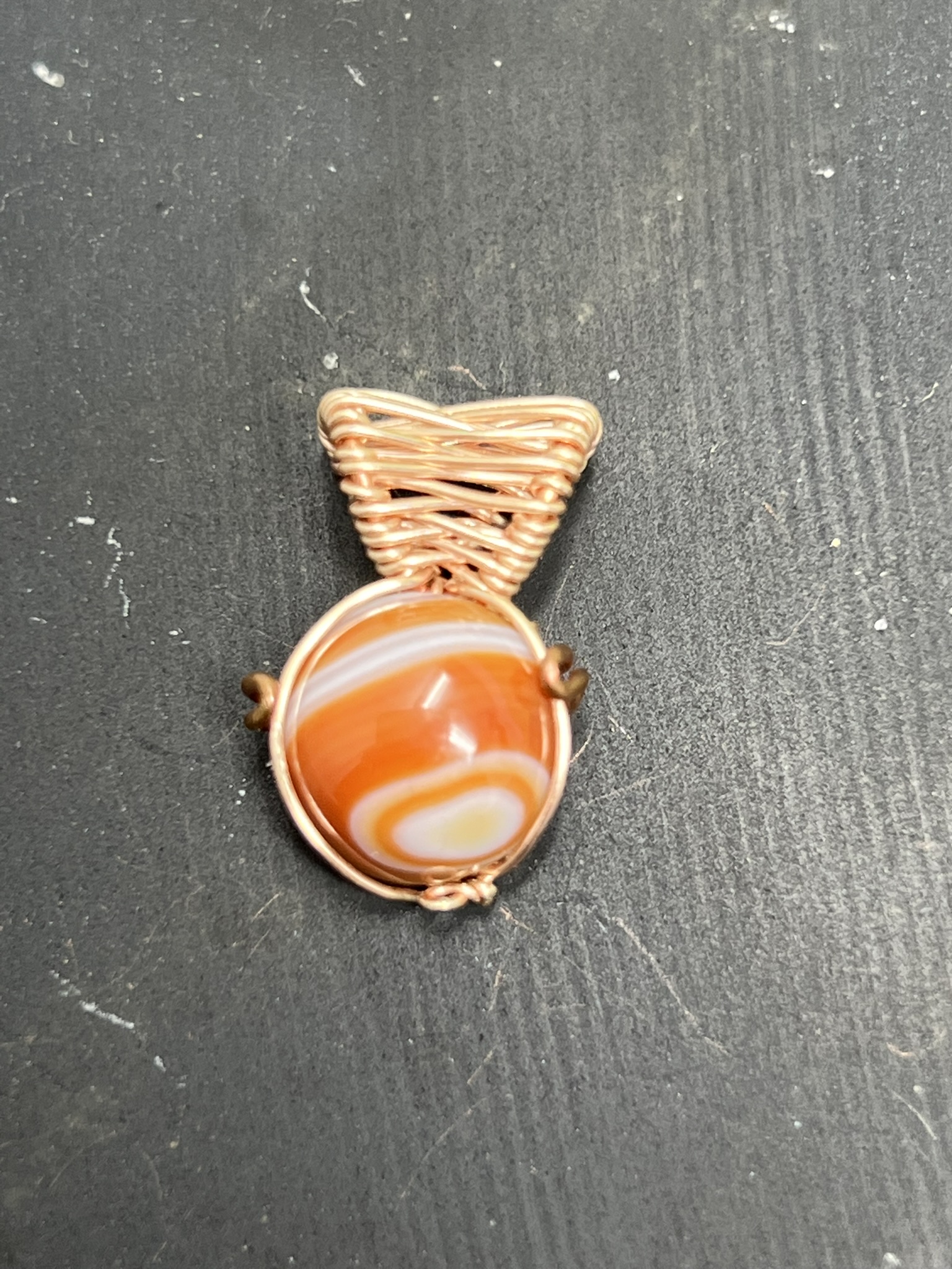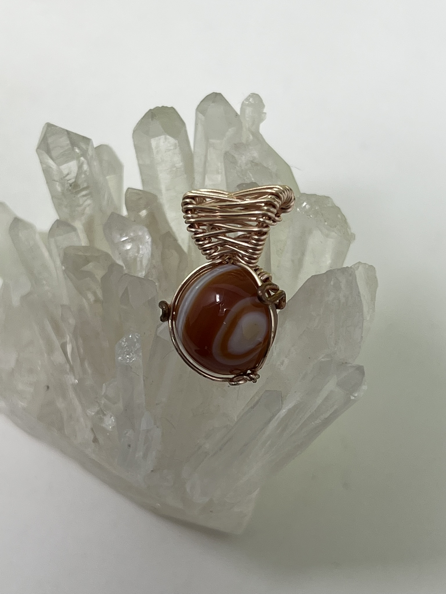 This beautiful pendant features a small carnelian agate cabochon that has been simply wrapped in rose gold colored copper wire. It is set in a prong type setting. This piece is handmade in Minnesota.