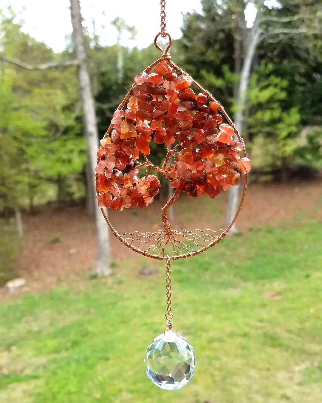 The frame of this gemstone tree sun catcher is approximately 4 inches tall with the prism adding to the length. The frame of the tree was hand formed from bare copper wire into a tear drop shape. The tree is also hand formed from thinner copper wire and strung with gorgeous Carnelian beads for the leaves.