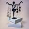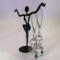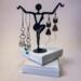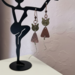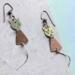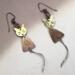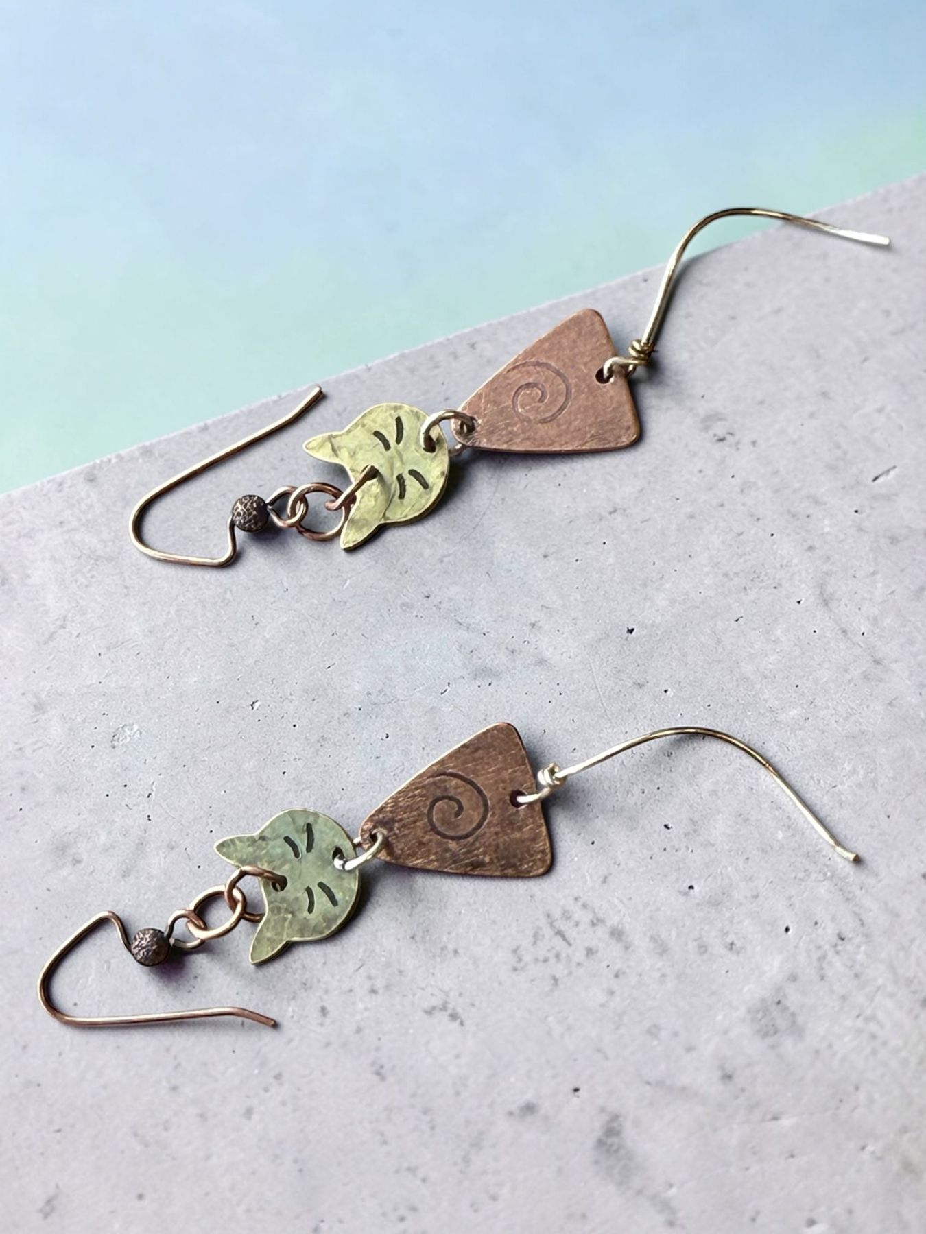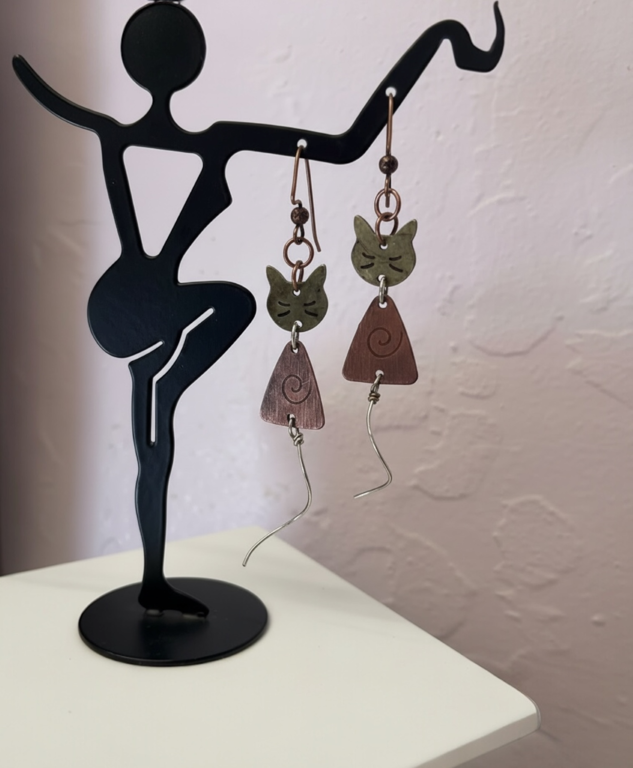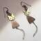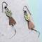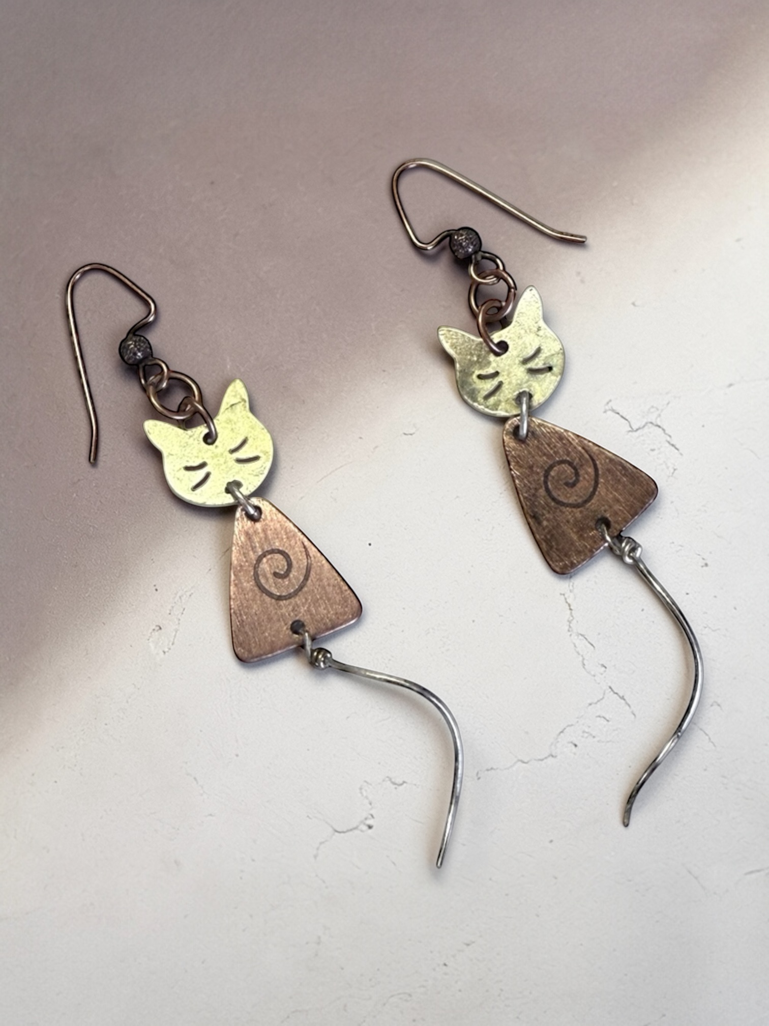 ❧ B. This handmade pair of earrings is made of metals. The colors are bronze and copper. I have added ear wire in coordinating colors. These earrings dangle nicely because of the length. The dangle is 1 1/2 inches from the base of the ear wire to the base of the body. The cat has a long spiral stainless steel tail, which is another 1 inch curl. This pair of unique earrings is sure to be the point of compliments as you wear them. $28.00