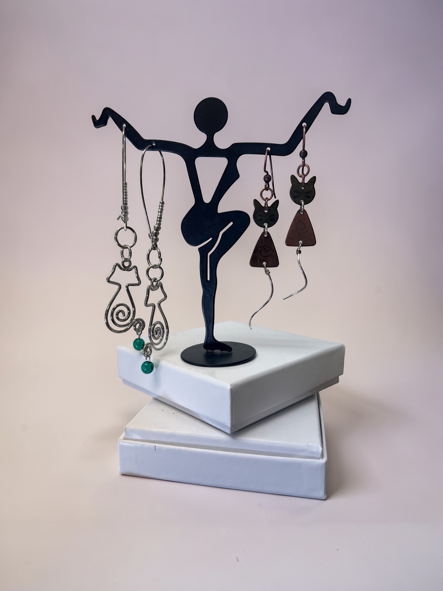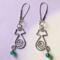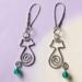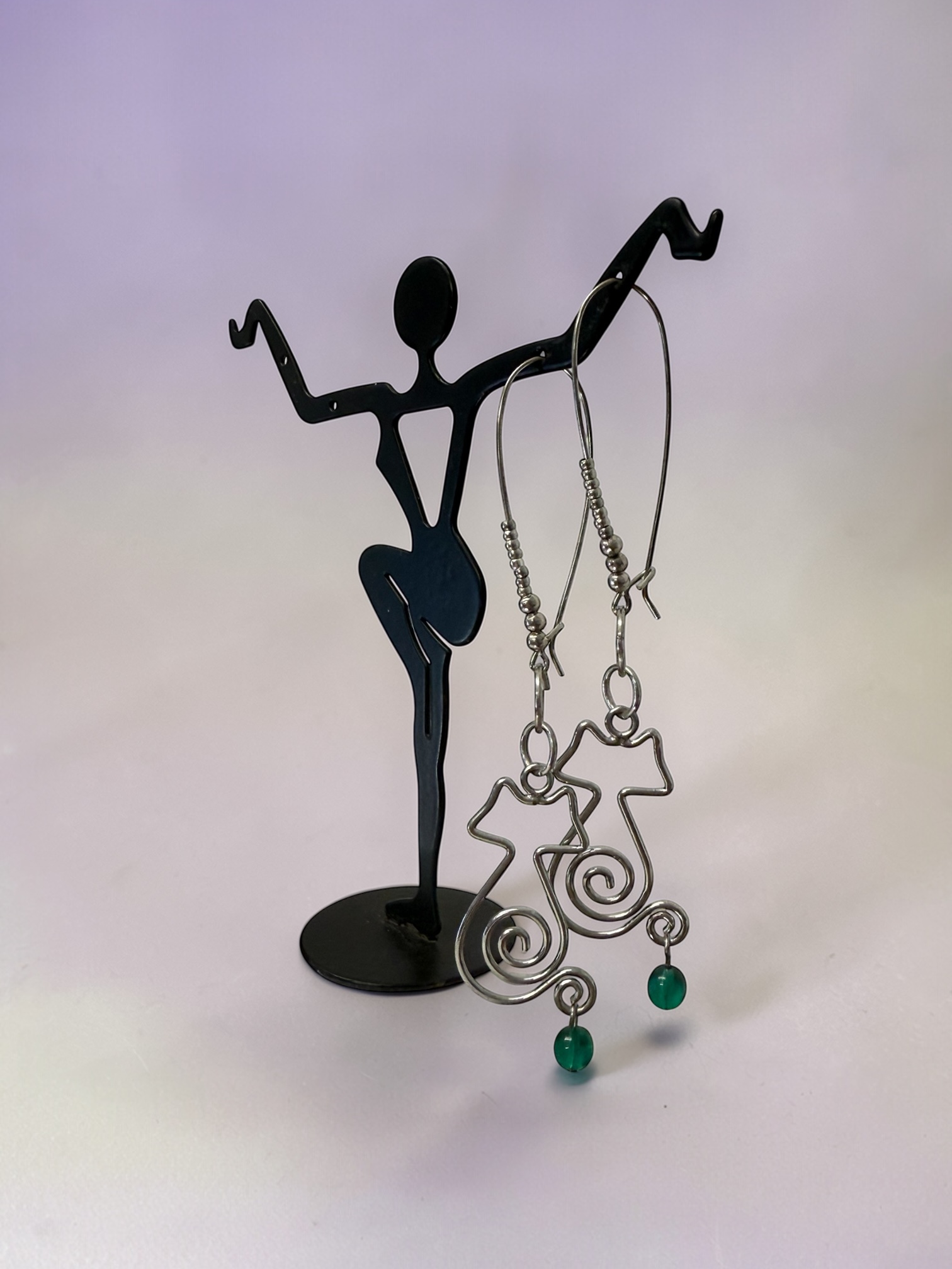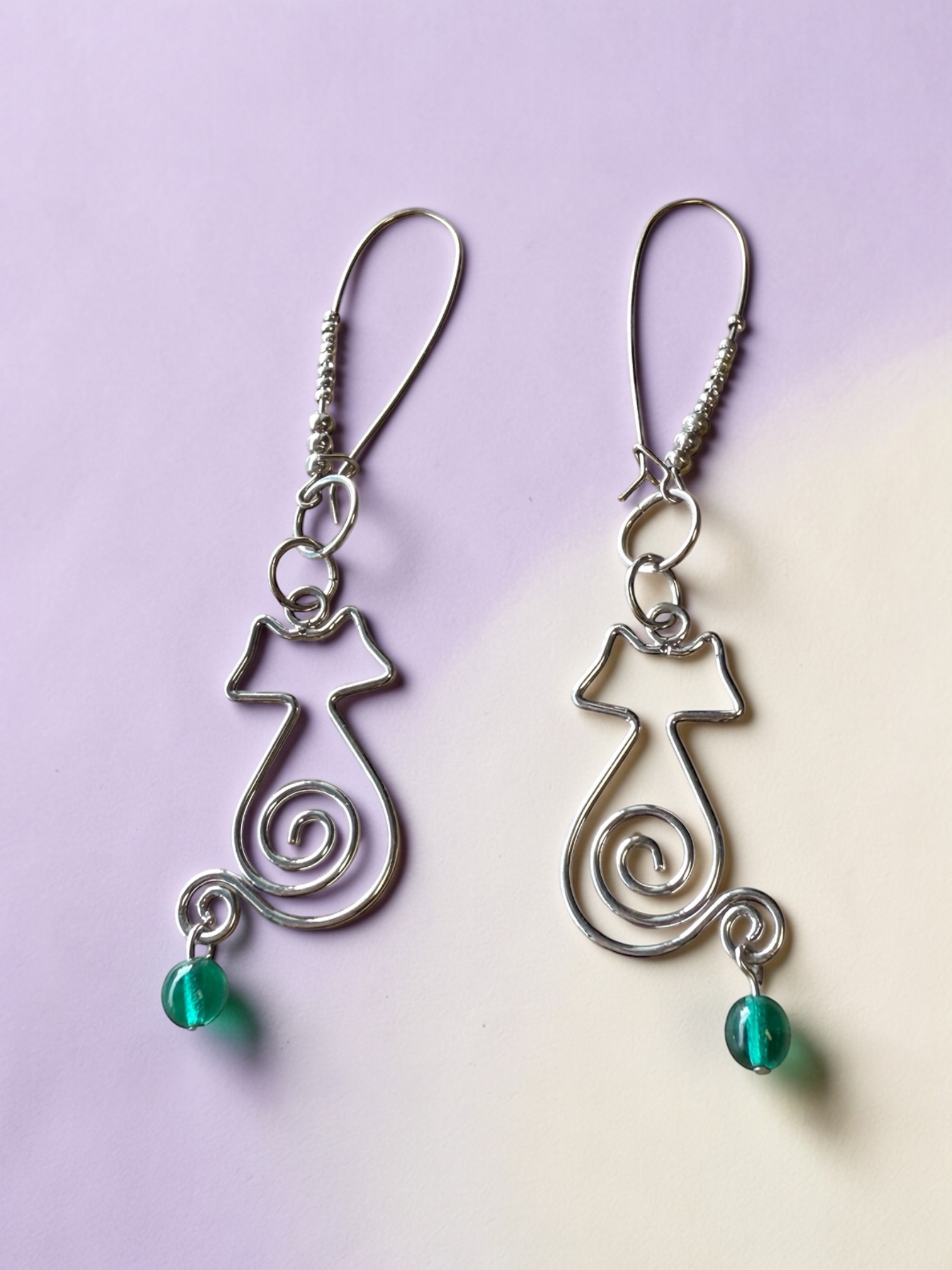 ❧ A. This pair of handmade wire dangle earrings is adorable. Featuring a spiral minimalist silhouette body of a cat. I have fashioned the cats with green glass beads attached to their tails. The cats dangle 1 3/4 inches with 2mm and 3mm silver plated beads threaded on the kidney wire.