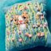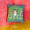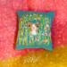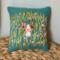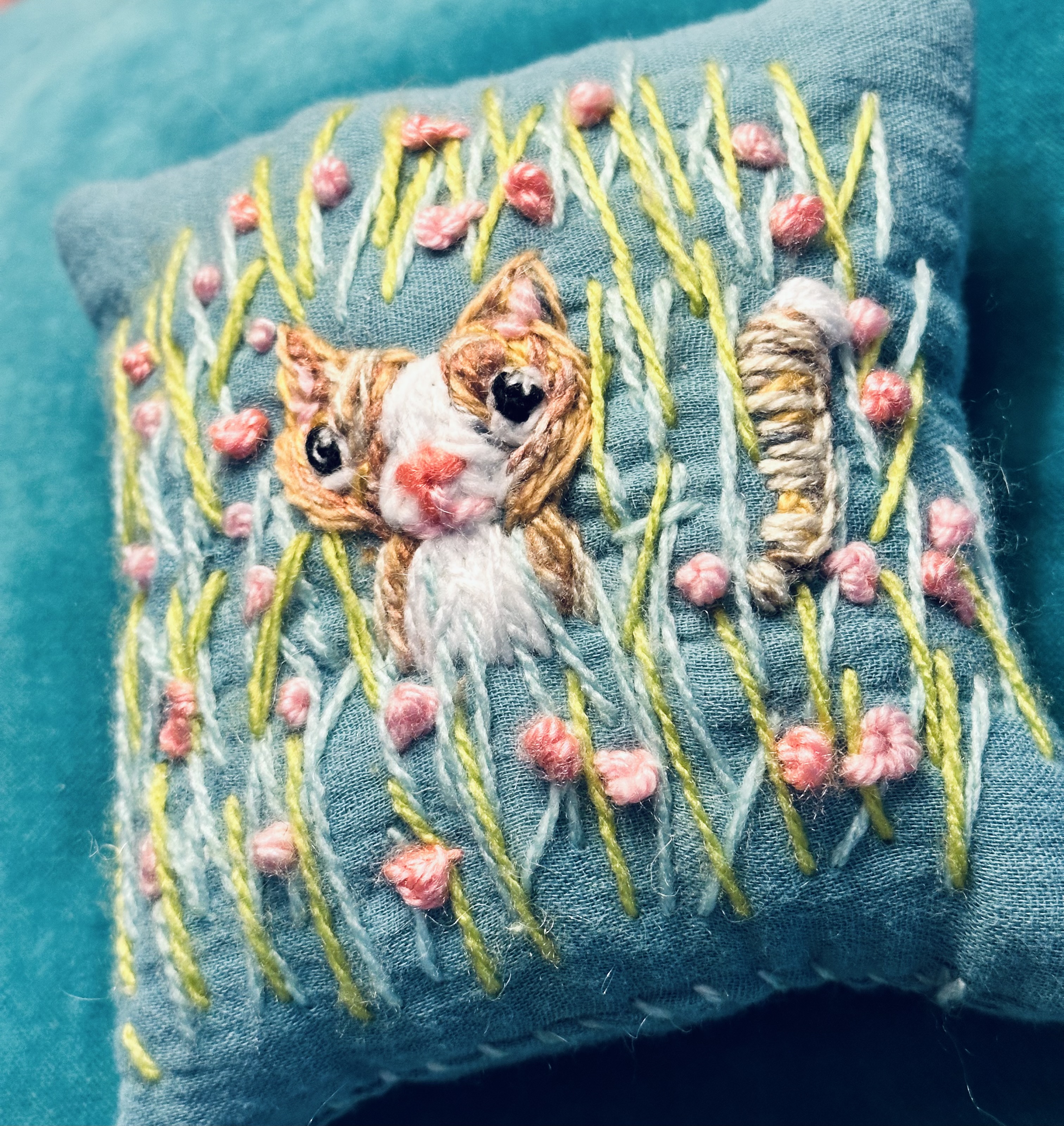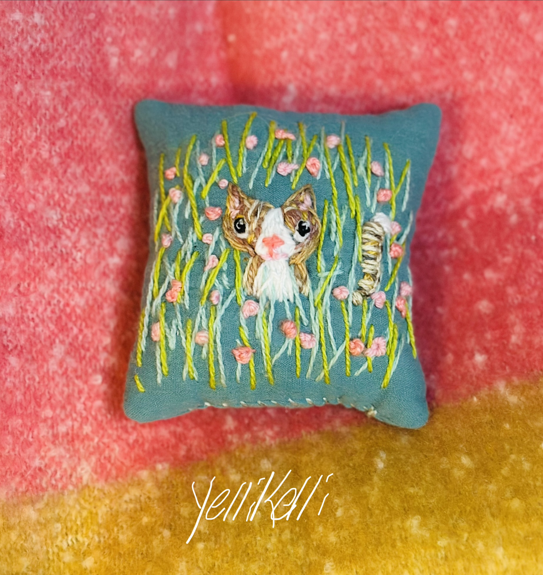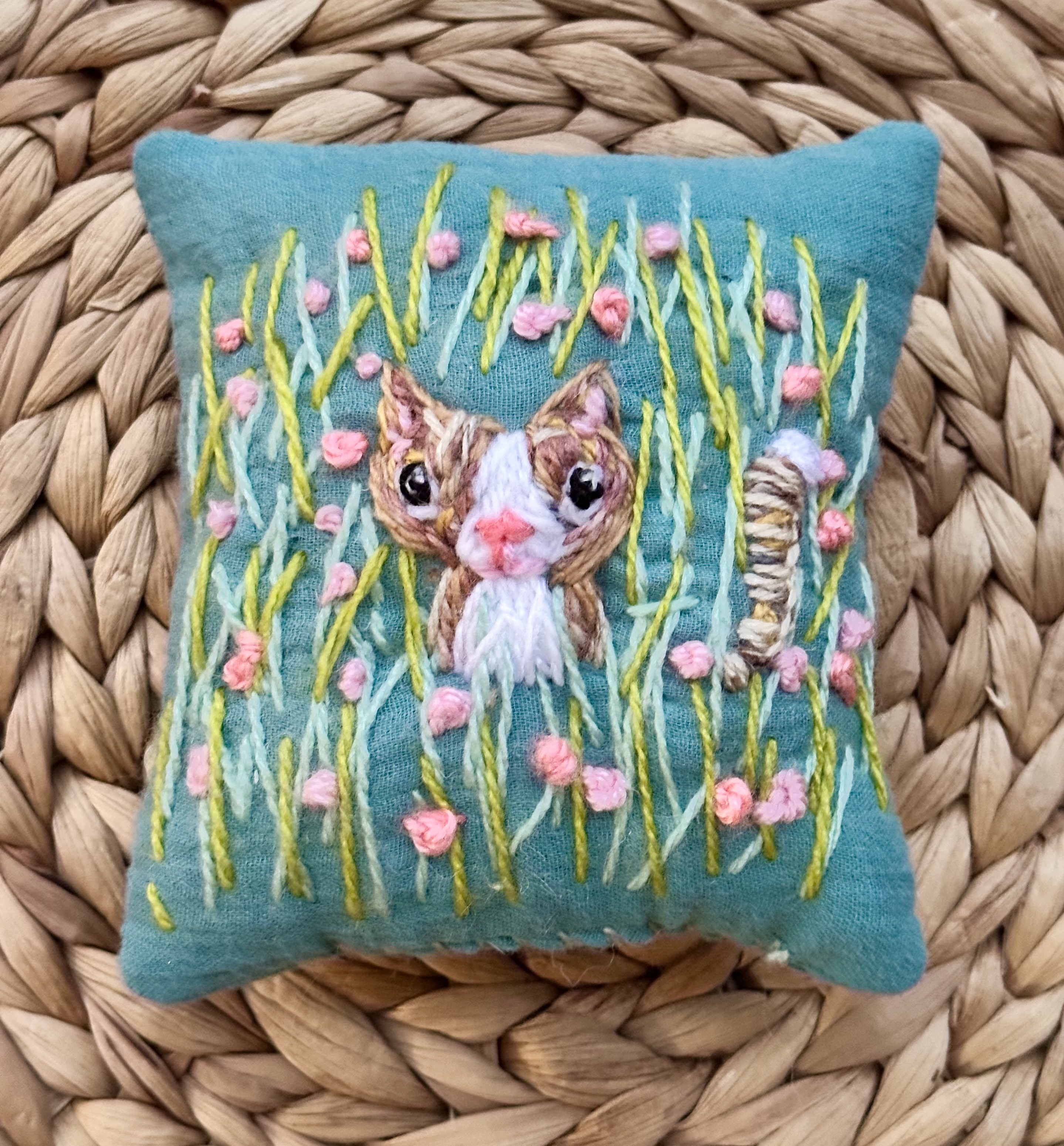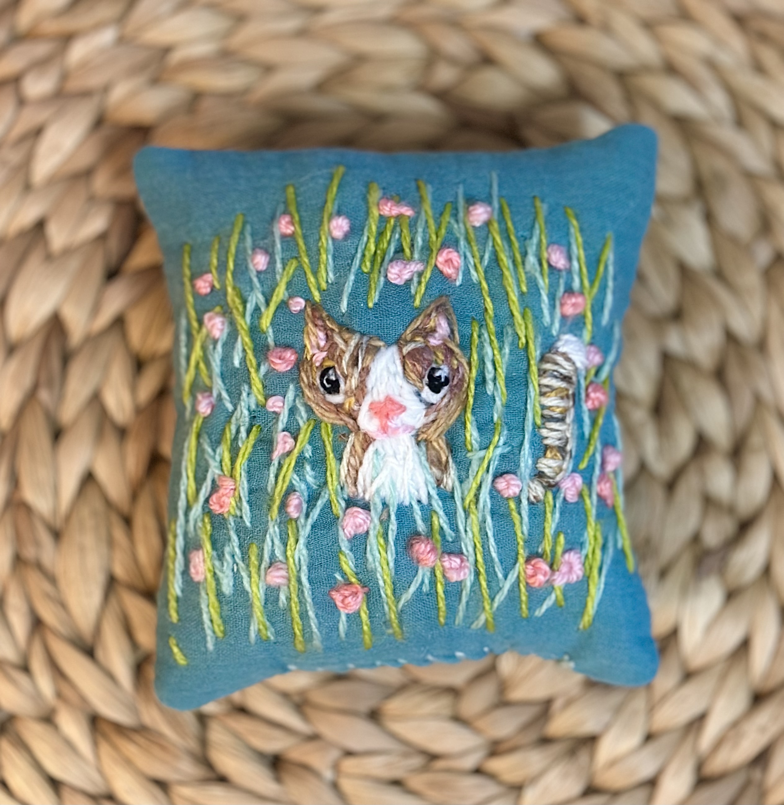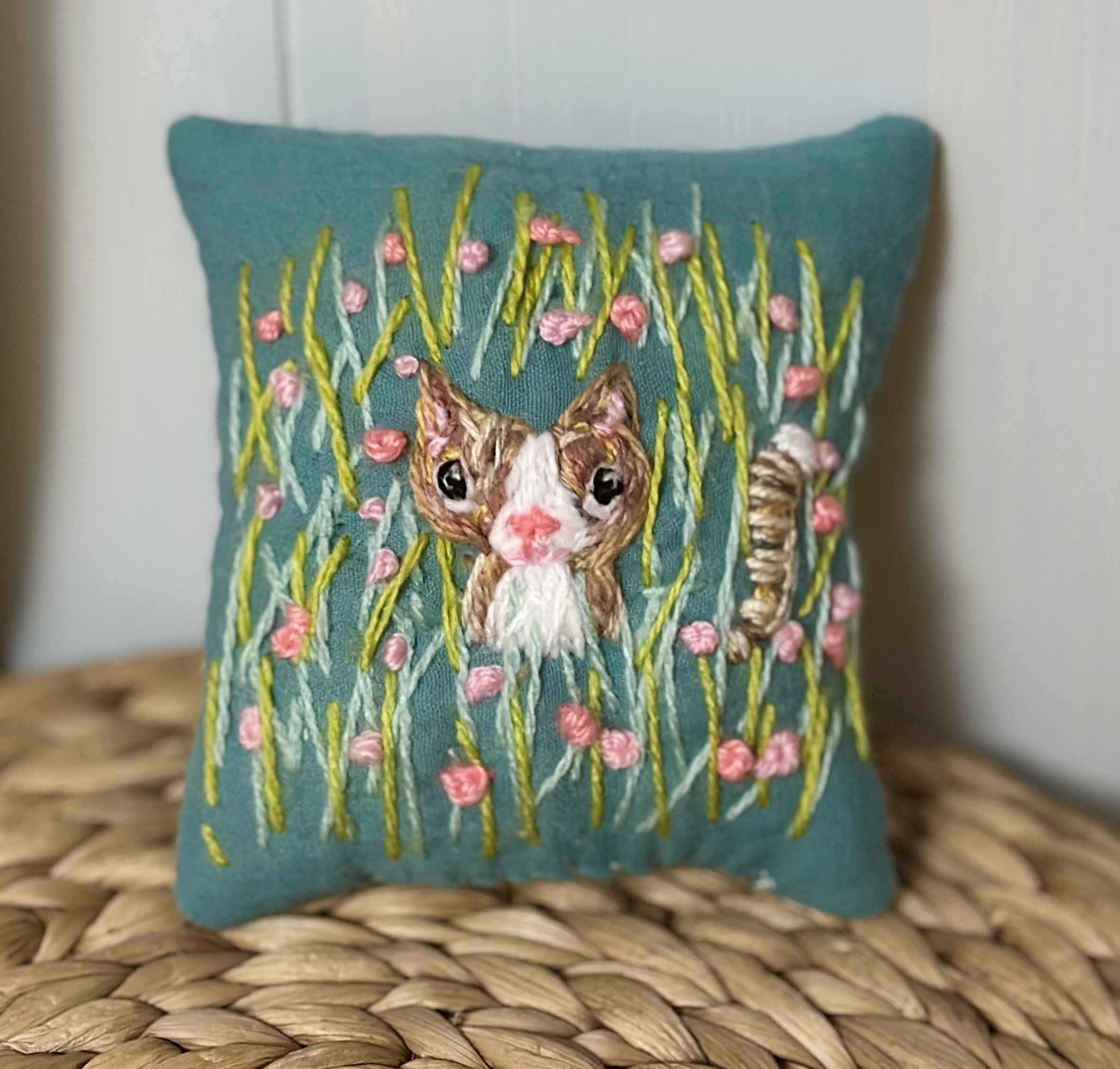 This whimsical mini pillow is freehand embroidered with a sweet cat peeking out of flowered grass.