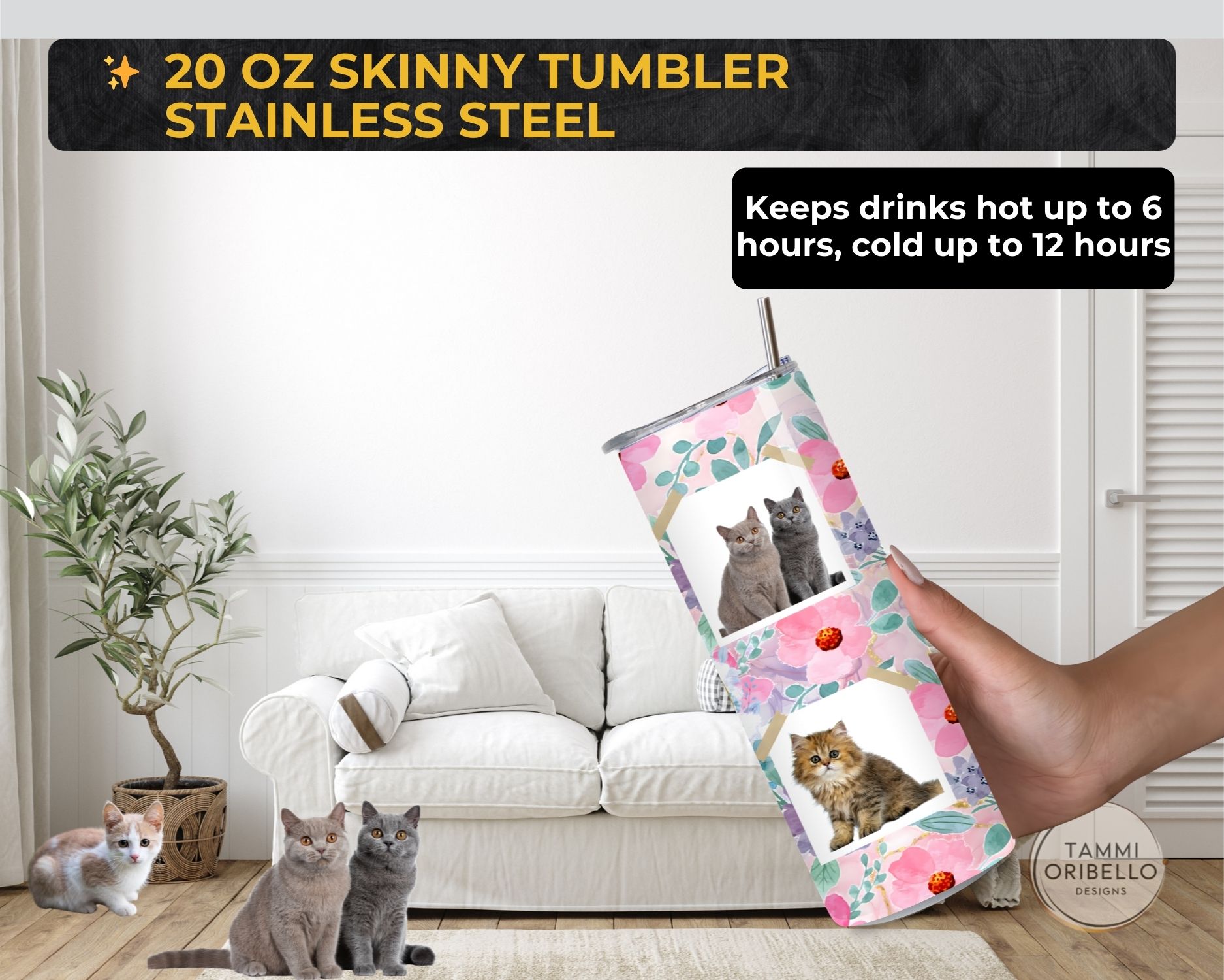 20 oz double-wall stainless steel tumbler featuring pastel floral artwork with space for 4 customer-supplied pet photos and a choice of 6 Cat Mom sayings. Personalized with your images, vacuum insulated, and including a slider lid, straw, and gift-ready box. Made to order and shipped from Lapeer, Michigan.
