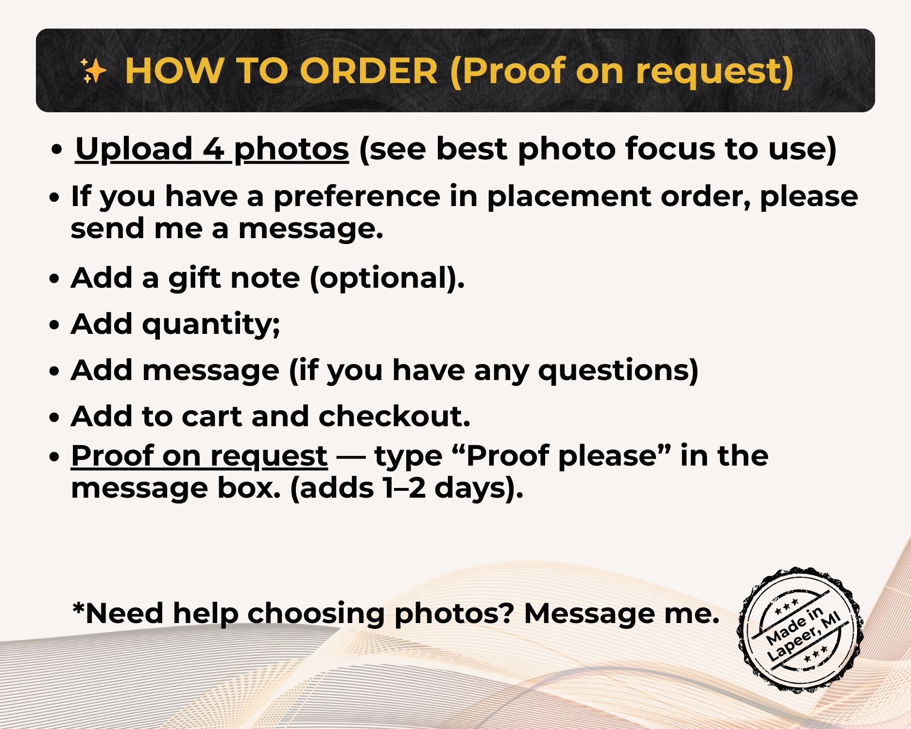 If a photo is too dark, blurry, or cropped too close, I’ll reach out so we can choose a better one together.