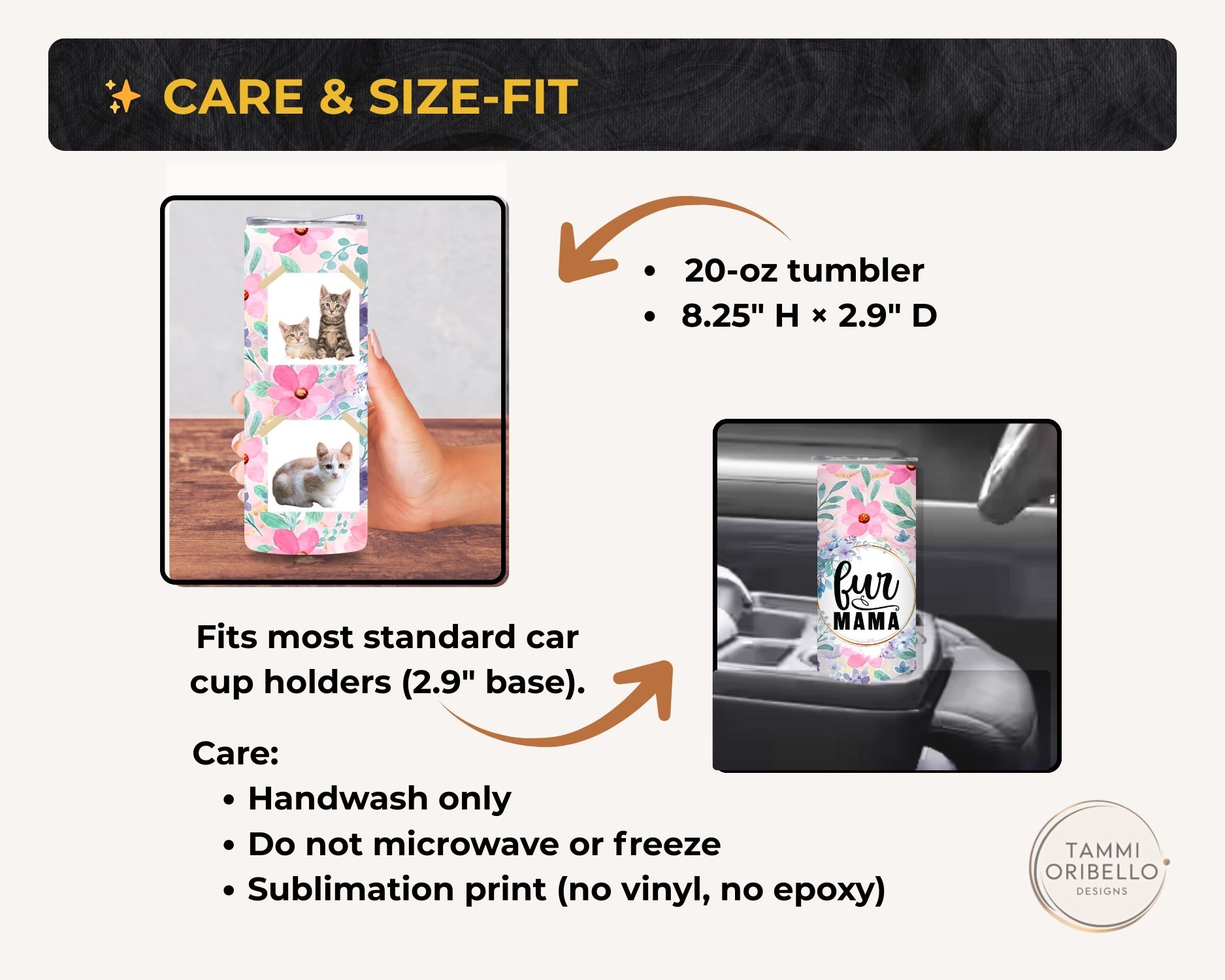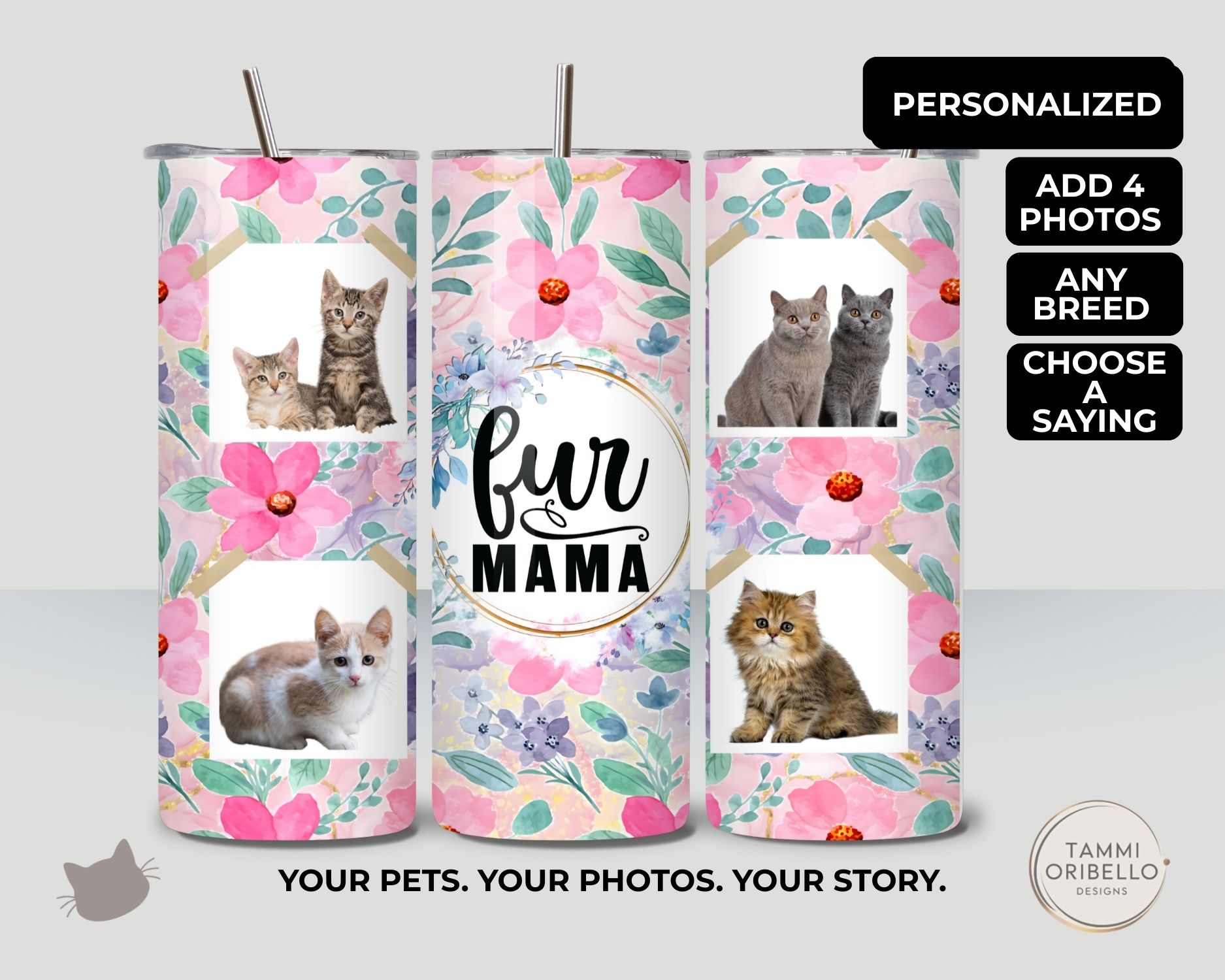 Cat Mom Fur Mama Tumbler with 4 Custom Pet Photos and Choice of Saying, 20 oz Stainless Steel