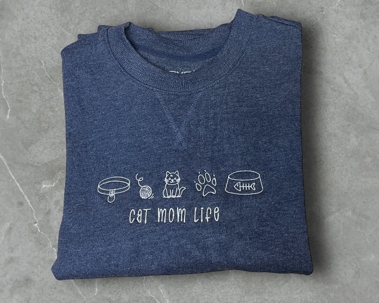 The embroidered design consist of Cat Mom Life with little “cat” icons. The design stitched is approx 8” w x 2.3” tall.