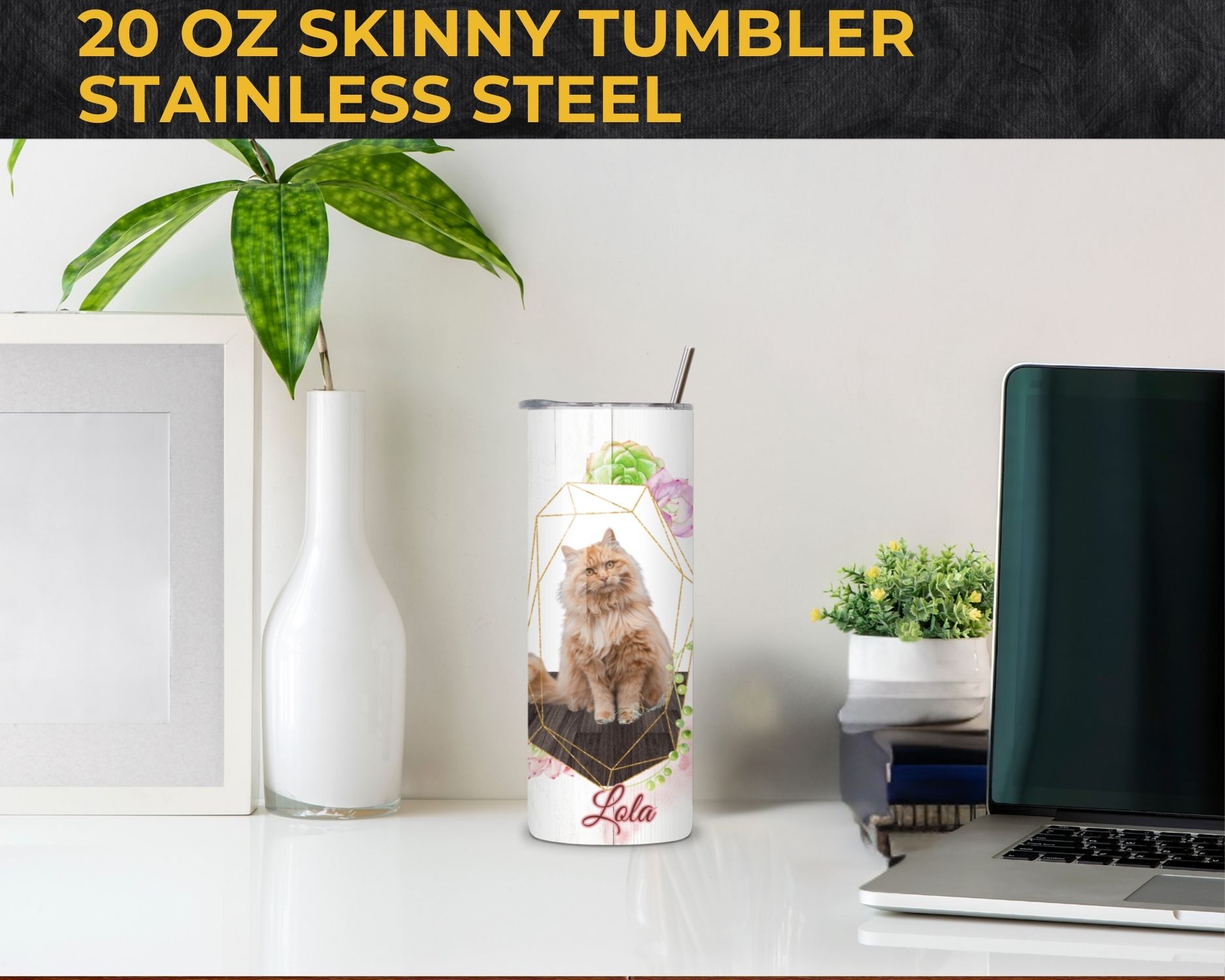 What is this? A stainless steel 20 oz personalized cat photo tumbler with your cat’s picture and name added to a pastel floral background. It keeps drinks hot or cold and includes a lid, straw, and gift-ready packaging. It’s perfect for cat owners, pet parents, and anyone looking for a meaningful pet-themed gift.