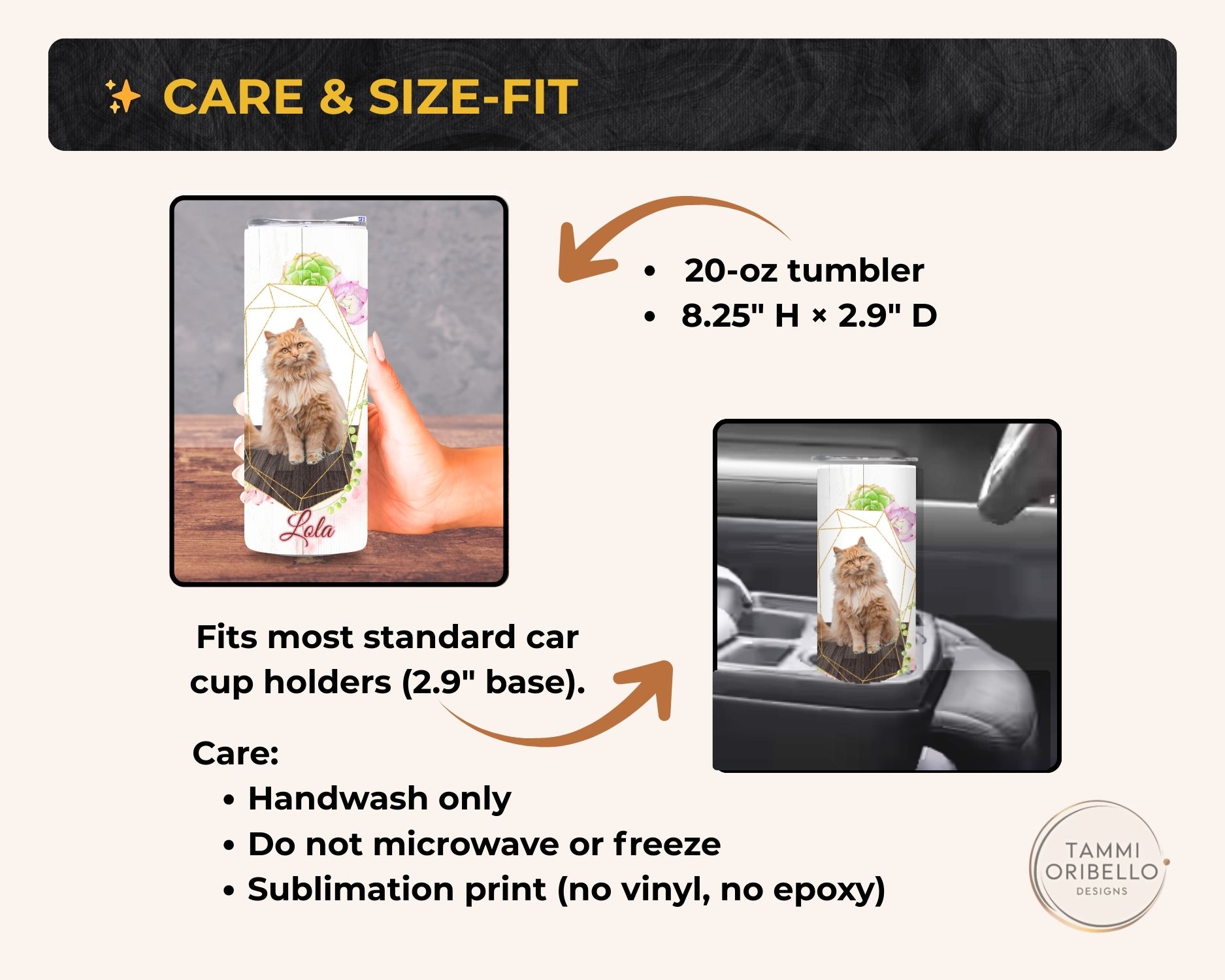 Upload your favorite cat photo, tell me the name, and I’ll turn it into a functional keepsake that’s made to last. It’s more than a tumbler—it’s a memory you can carry. Imagine the smile when someone sees their cat beautifully wrapped in pastel florals. That’s the moment this little cup becomes a big deal.