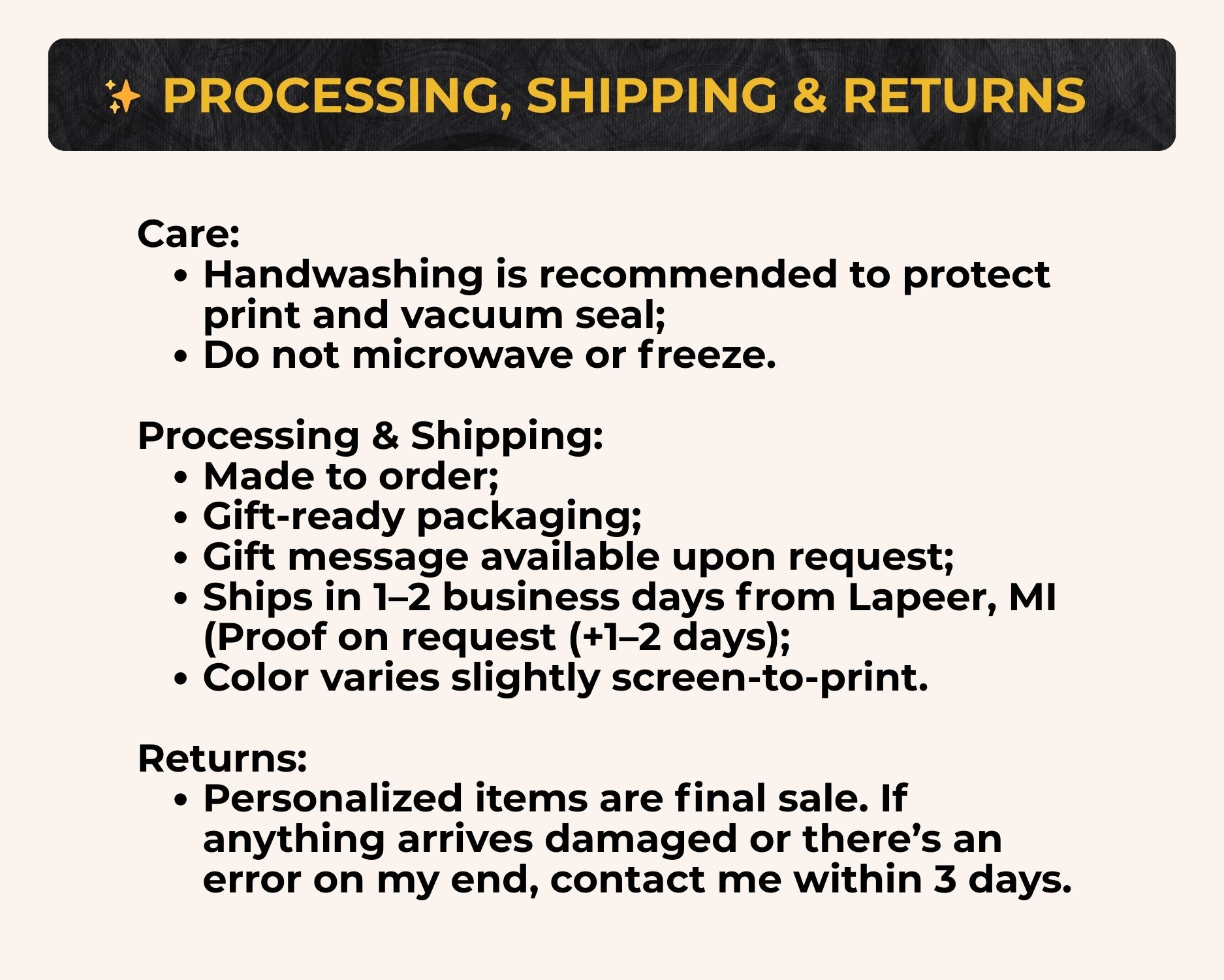 CUSTOM ORDERS / APPROVE YOUR DESIGN: I will send you a preview in 1-3 days for your reference. Feel free to make changes at that time! If you do not reply within the next 48 hours, we will consider the design approved and proceed with production. When you approve the preview, we will continue with the design process.