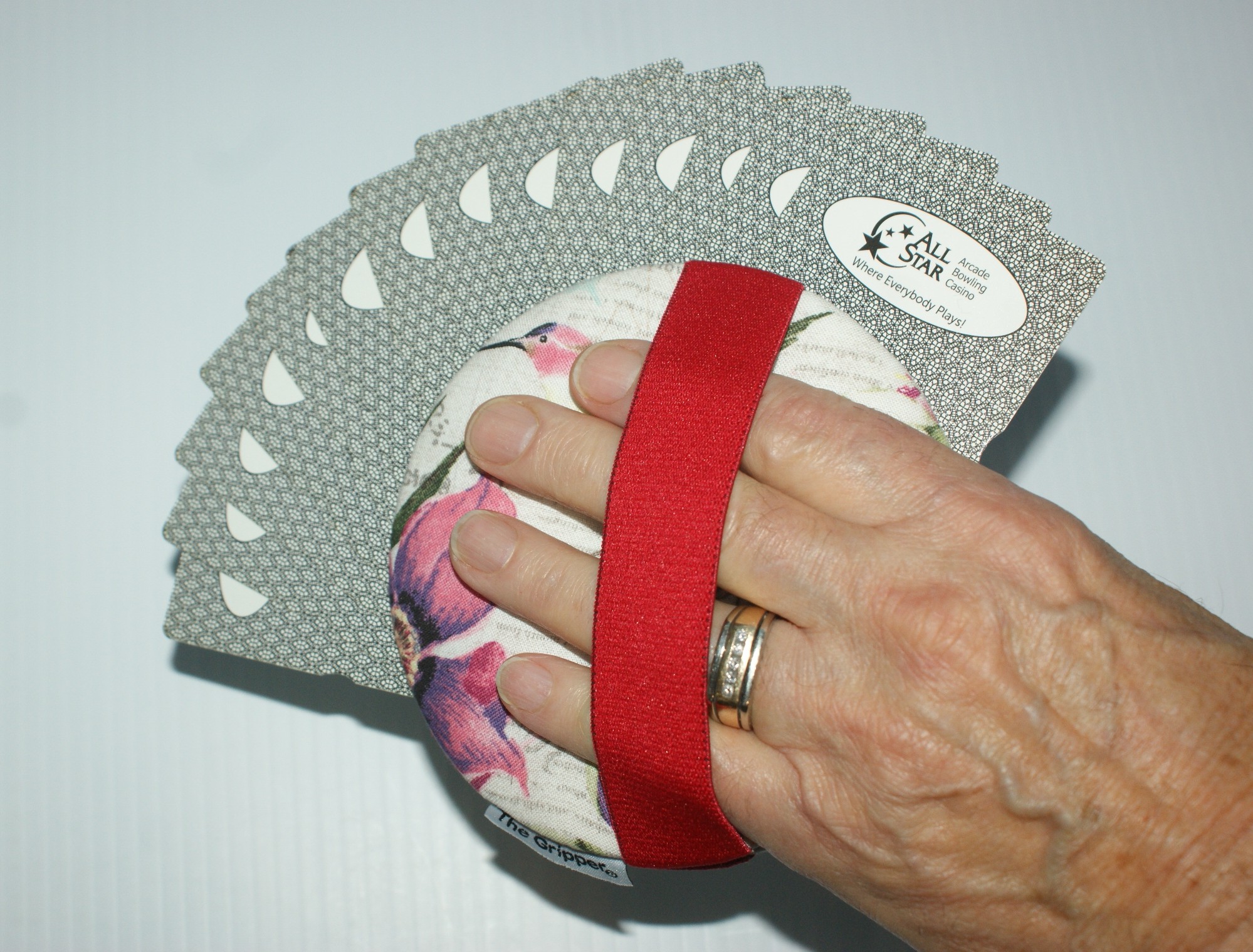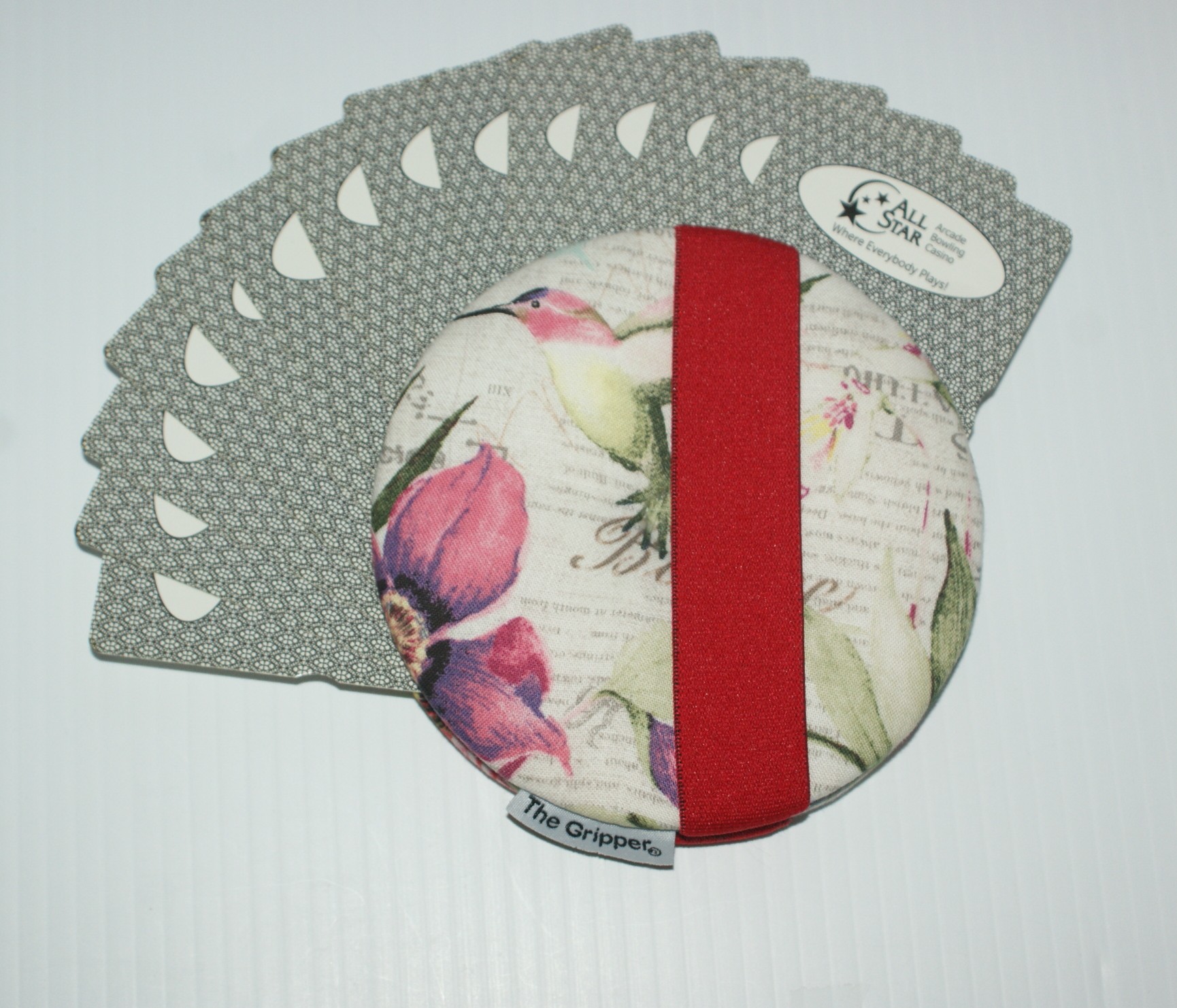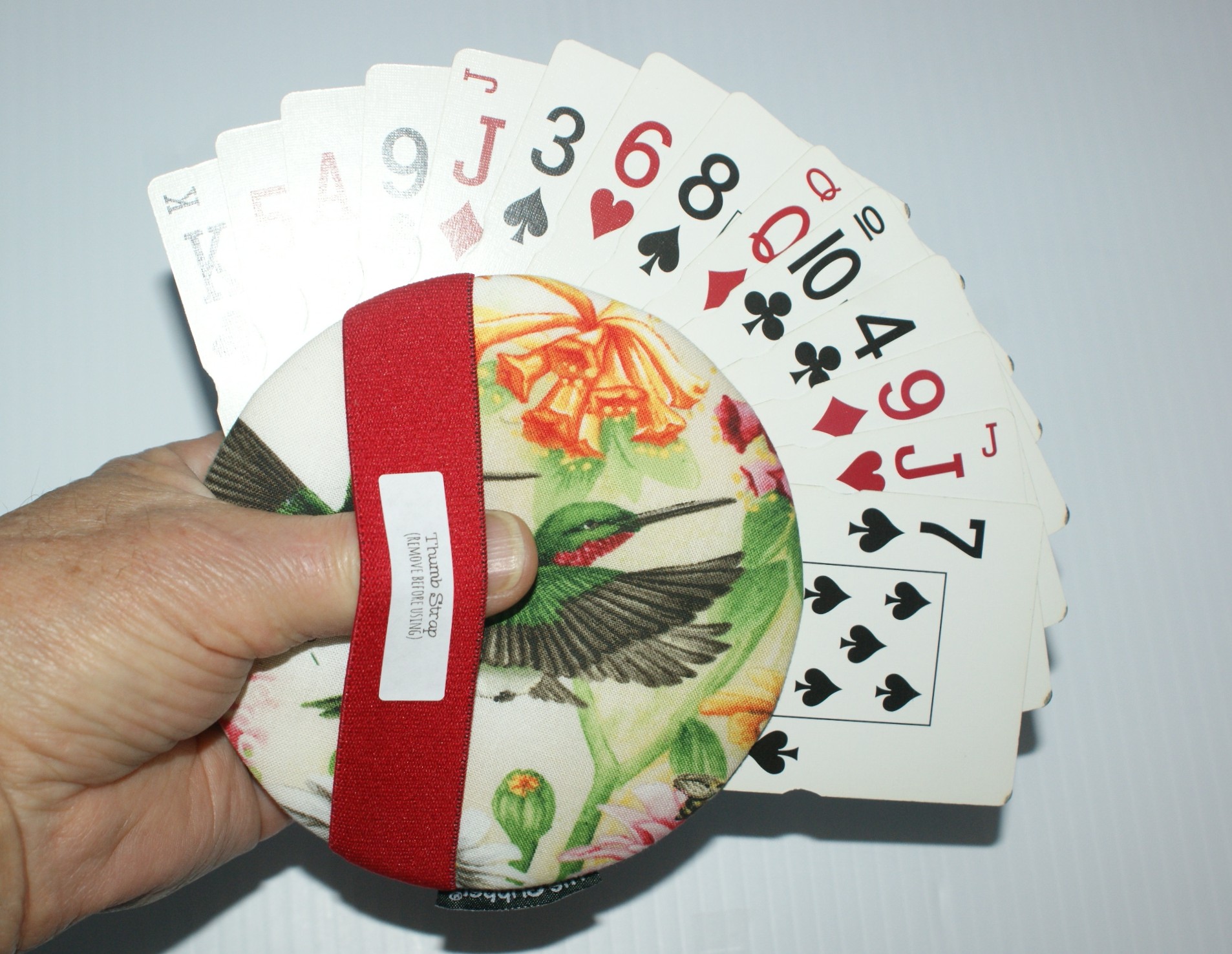 Cathy's Custom Gripper Playing Cardholder came about by coordinating ideas from a customer using one of my existing styles and applying modifications. I use soft elastic for both the hand and thumb straps making it as comfortable as possible for the card player.