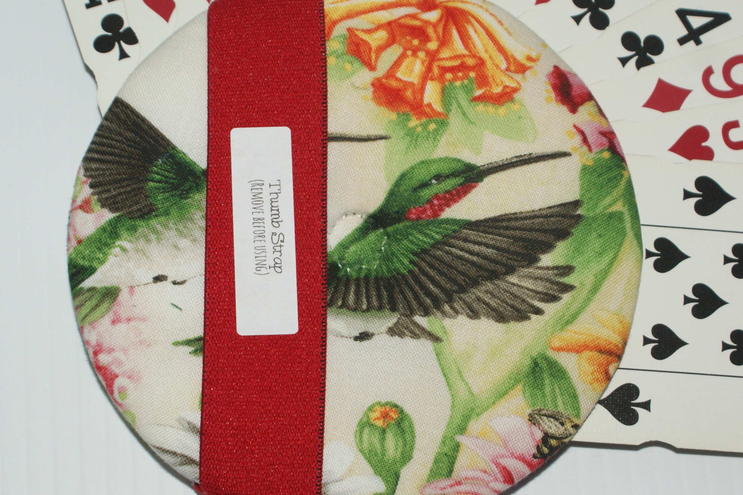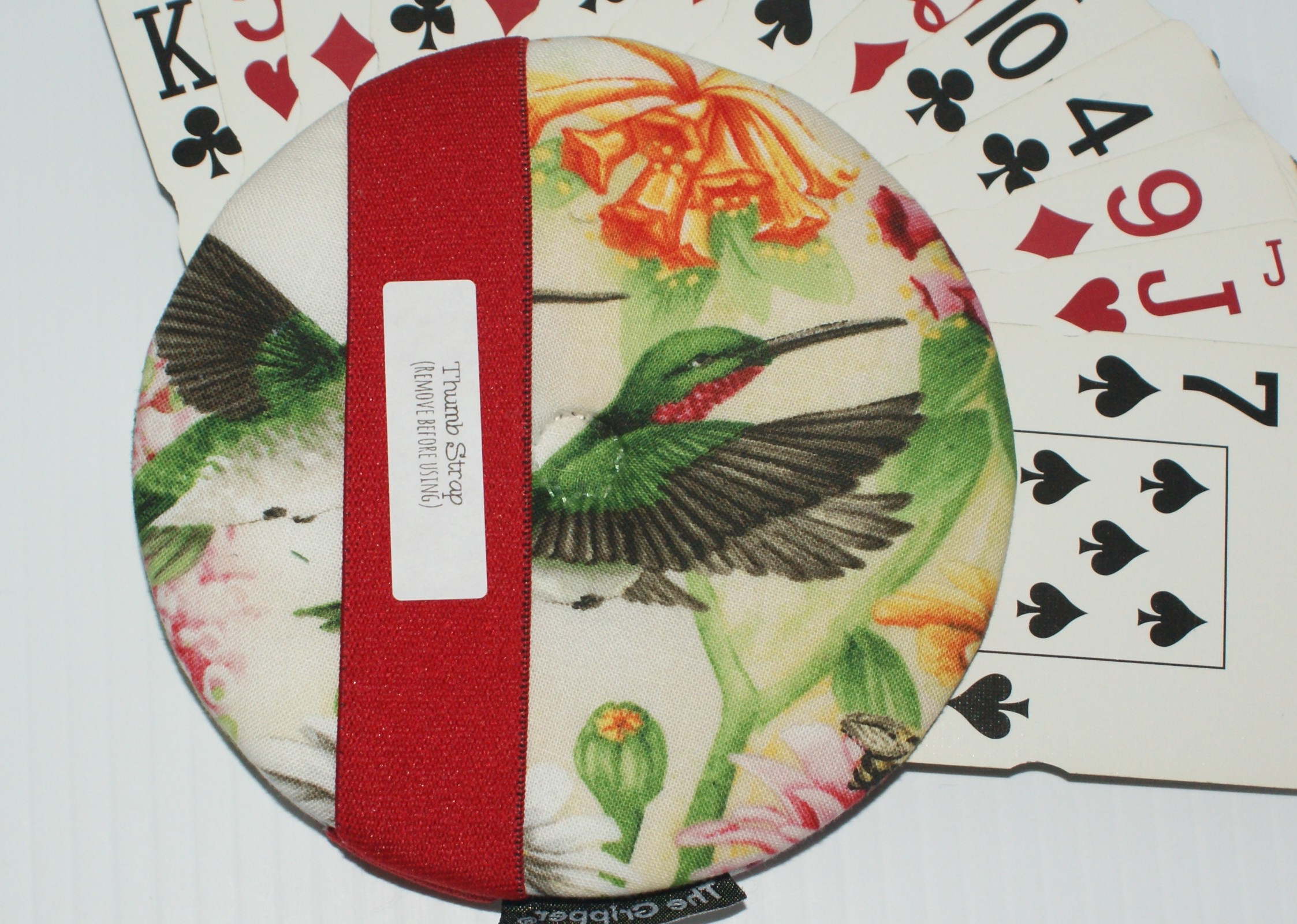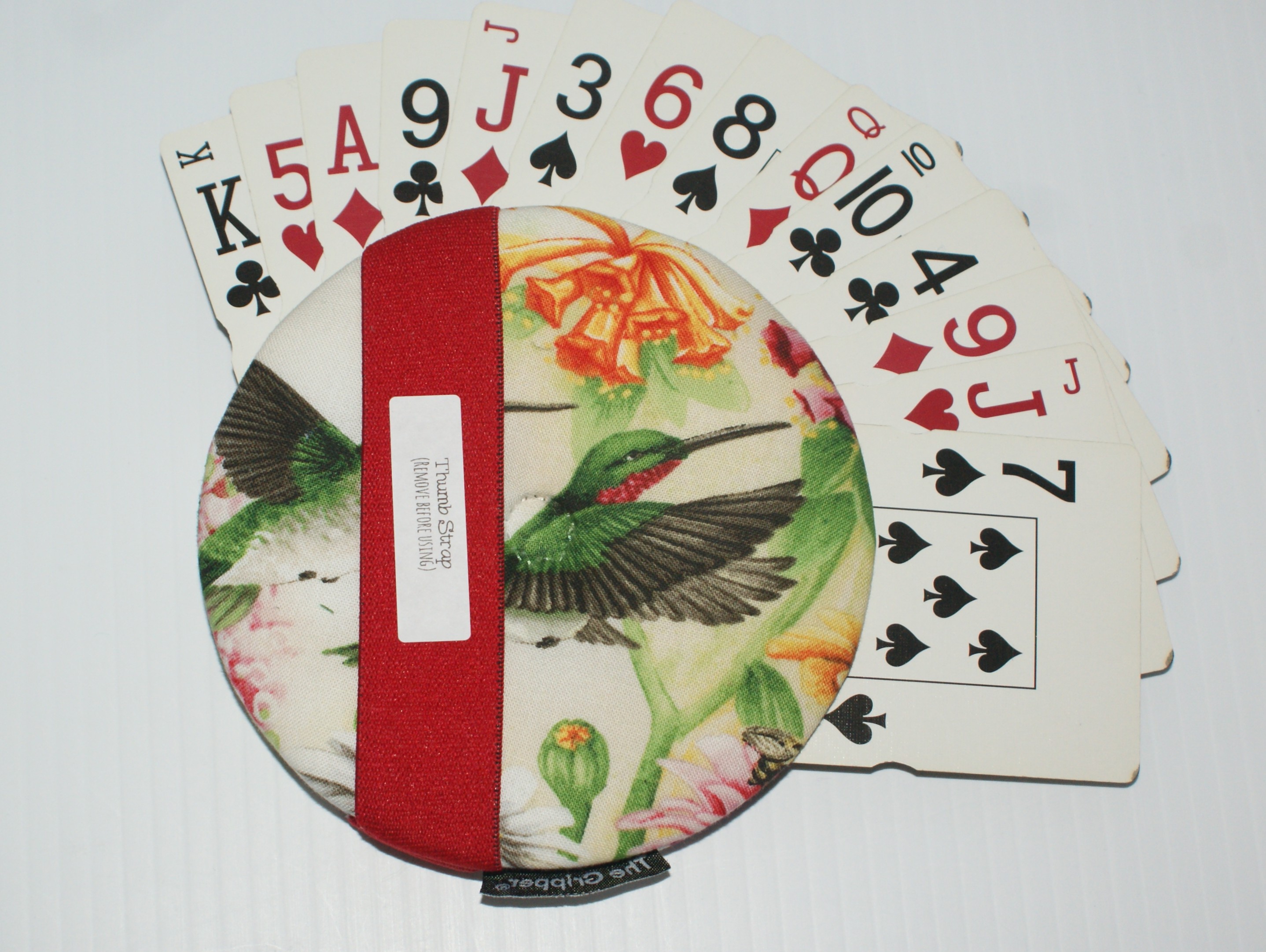 Cathy's Custom Gripper Playing Cardholder came about by coordinating ideas from a customer using one of my existing styles and applying modifications. I use soft elastic for both the hand and thumb straps making it as comfortable as possible for the card player.
