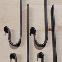 Each hook begins as a 3/4" round piece of steel. The stem of the hook is isolated from the parent bar using a tool called a "butcher", and forged into a square taper. The base is forged in an "upsettting die" (which is basically a heavy steel plate with a hole drilled through it). The base is refined by hand, then the hook is forged. After the piece has cooled, the mounting holes are drilled. The piece is then reheated, wire brushed, and a hot application of boiled linseed oil is applied.
