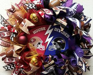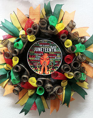 This VERY FULL size amazing Celebrate Black History/Juneteenth/Kwanza swag is based on a UITC board with foiled black, green, and yellow deco mesh. embellished with four types of wired ribbon including black and white glittered harlequin, and two custom wired African print ribbons.