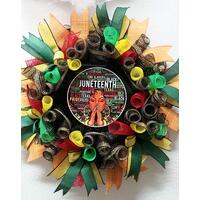 This VERY FULL size amazing Celebrate Black History/Juneteenth/Kwanza swag is based on a UITC board with foiled black, green, and yellow deco mesh. embellished with four types of wired ribbon including black and white glittered harlequin, and two custom wired African print ribbons.