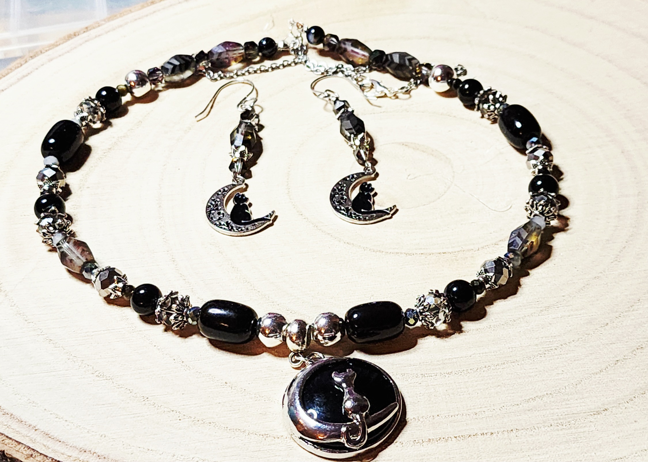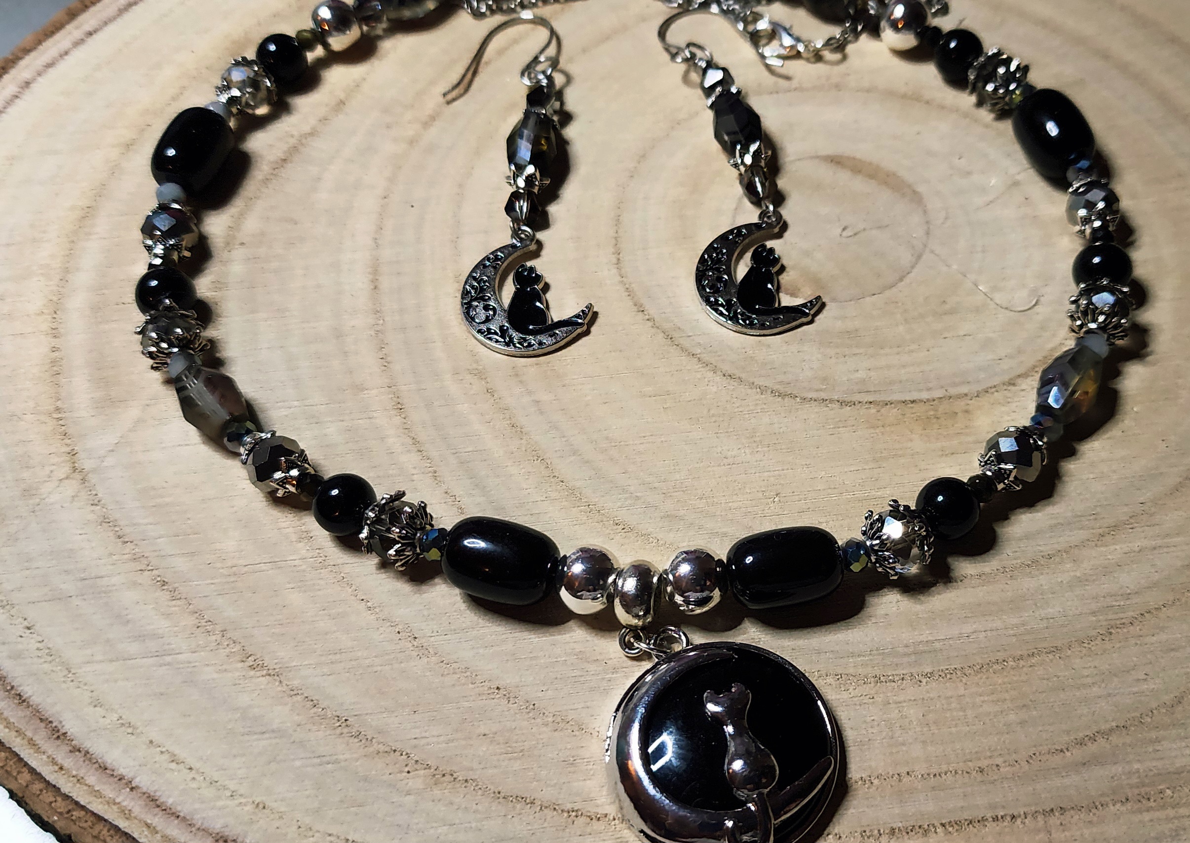 Step into a world of moonlight and mystery with this handcrafted jewelry set featuring a silver-toned cat nestled on a crescent moon. The necklace showcases black and silver beads with decorative spacers, leading to a striking round pendant. Matching earrings echo the celestial theme with crescent moons, star cutouts, and dangling black beads.