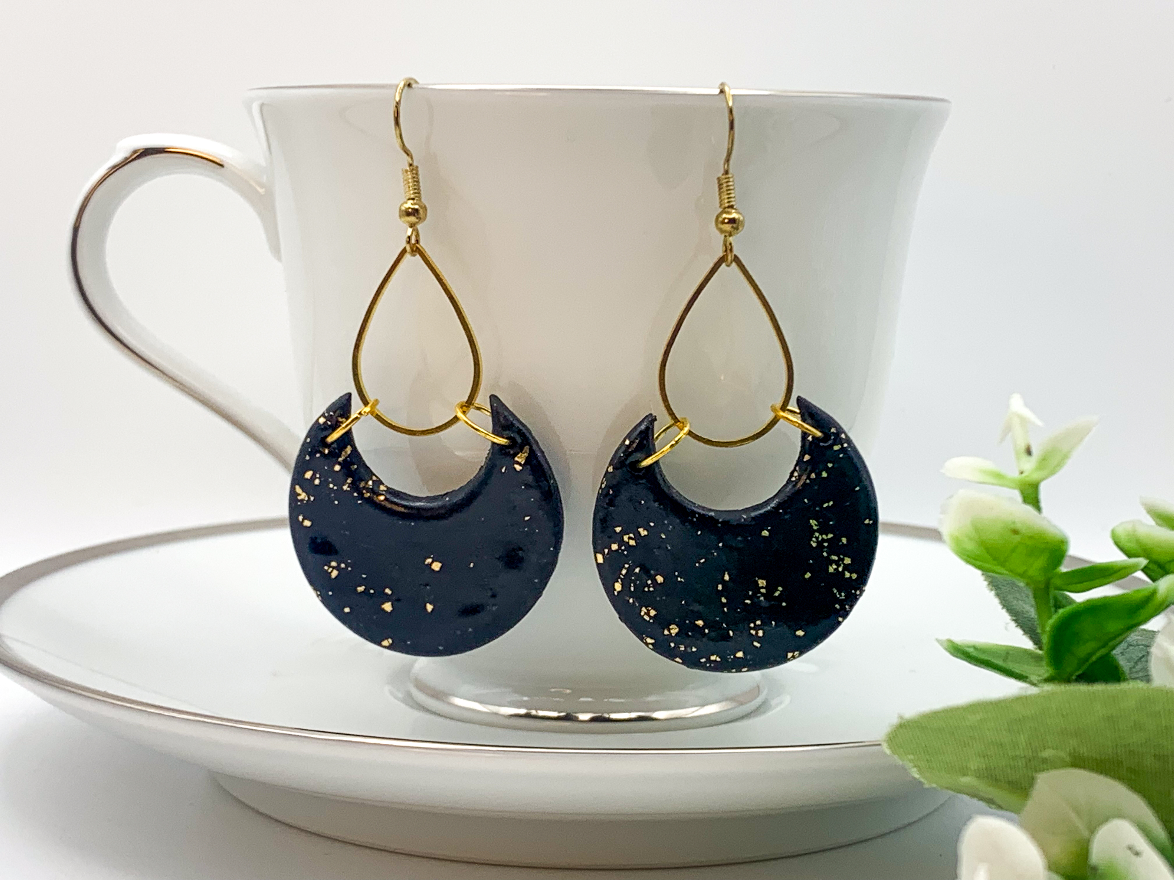 These black crescent moons sparkle with golden flecks, suspended from elegant gold teardrop hoops. A dreamy accessory for stargazers and night owls!