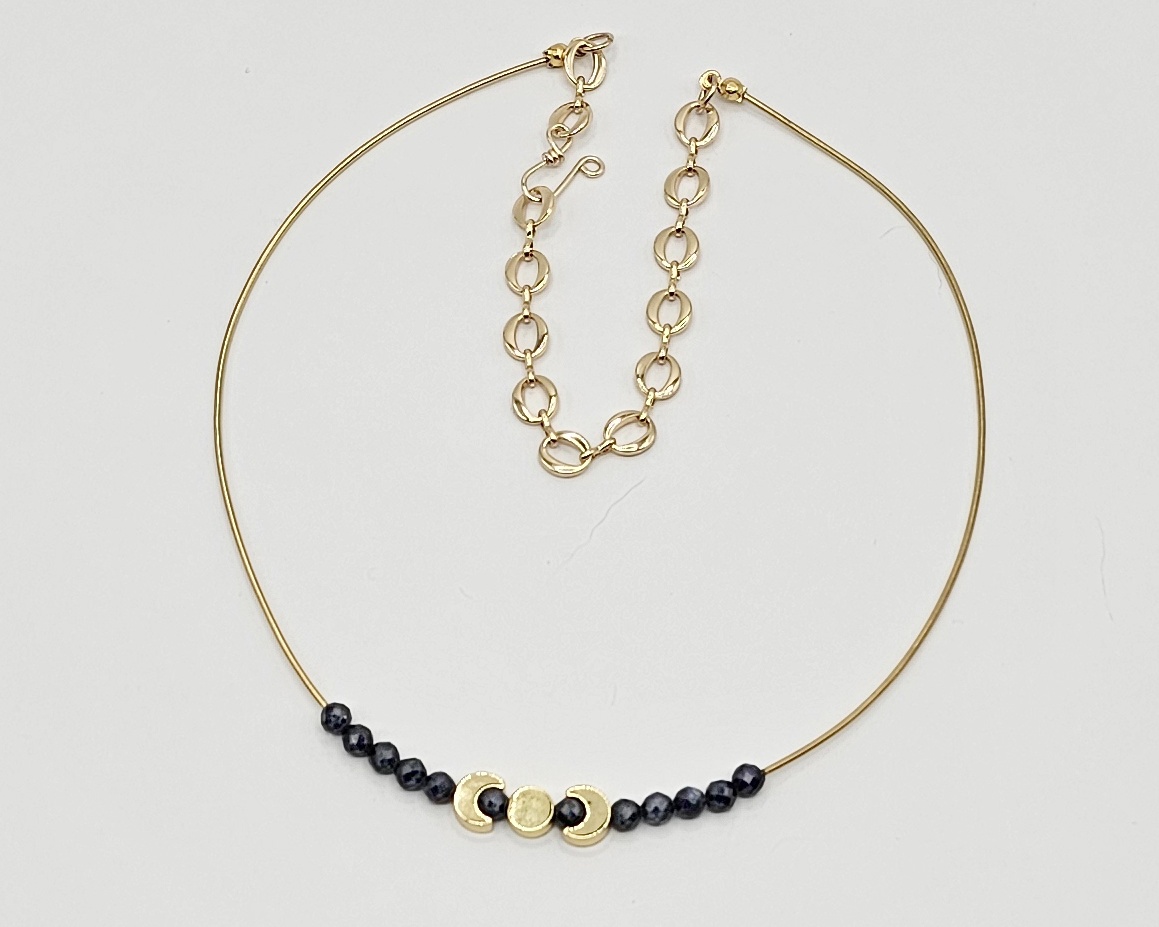 Step into the cosmos wearing this handmade celestial necklace, designed to honor the mysteries of the starlit skies. Handcrafted, this necklace features gold-plated brass moon phase beads and faceted sapphire gemstones, strung with gold-toned stainless bullion wire for a delicate yet durable finish.