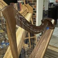 I make these harps from a pattern of my own design. Locally sourced hardwood and Sitka spruce are used for building each harp. I utilize my garage-turned shop to make each harp, in small, 1-3 harp batches. I 3d print the sharping levers myself, and source the hardware, strings, and tuning pins from a US manufacturer in IL(Argent Fox). Depending on my teaching schedule, I can complete a small harp in about 6 weeks start to finish; large harps take closer to 6 months.