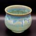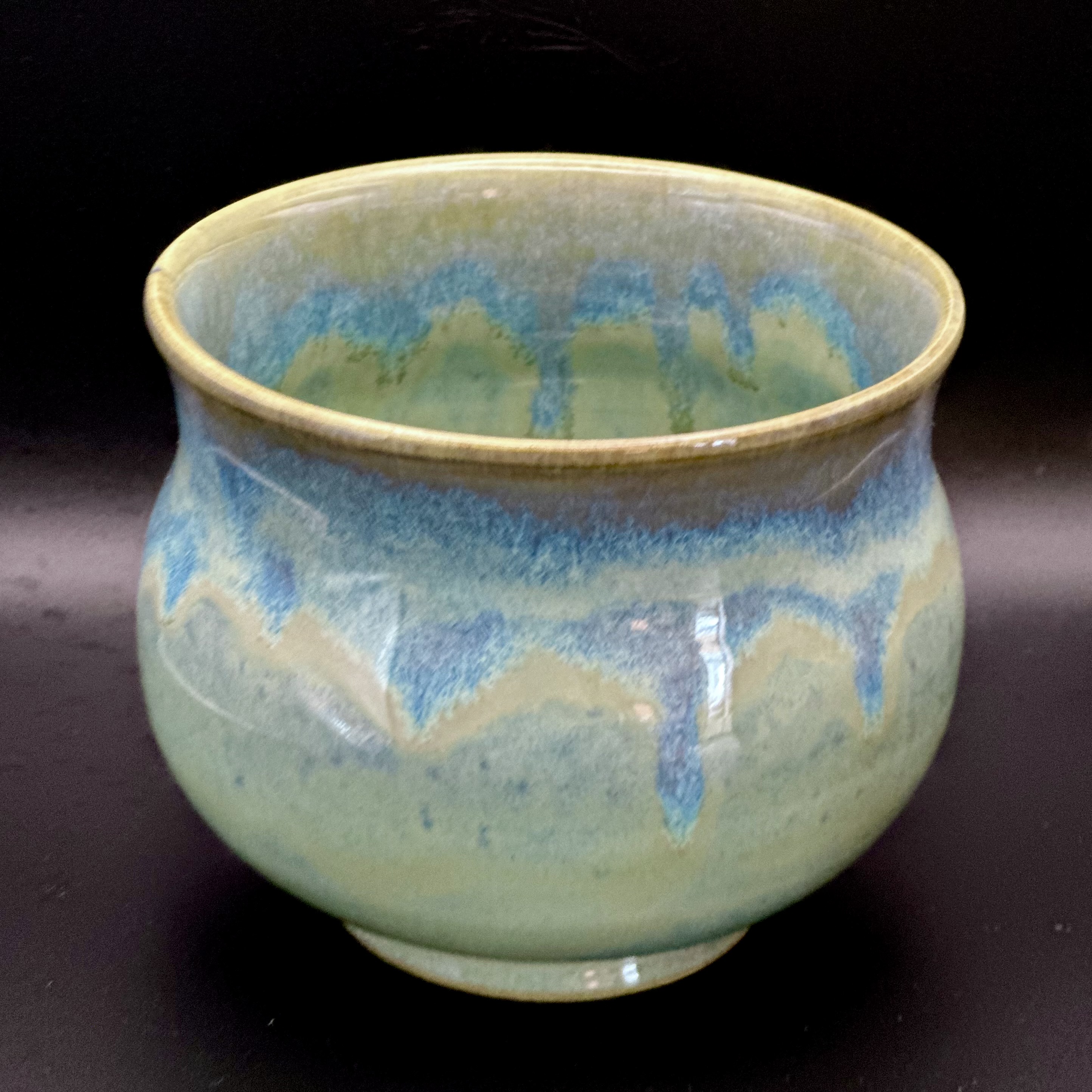 Wheel-Thrown Ceramic candy bowl with colorful glazes dripping and flowing down the inside and outside in soft greens and blues. Food safe.