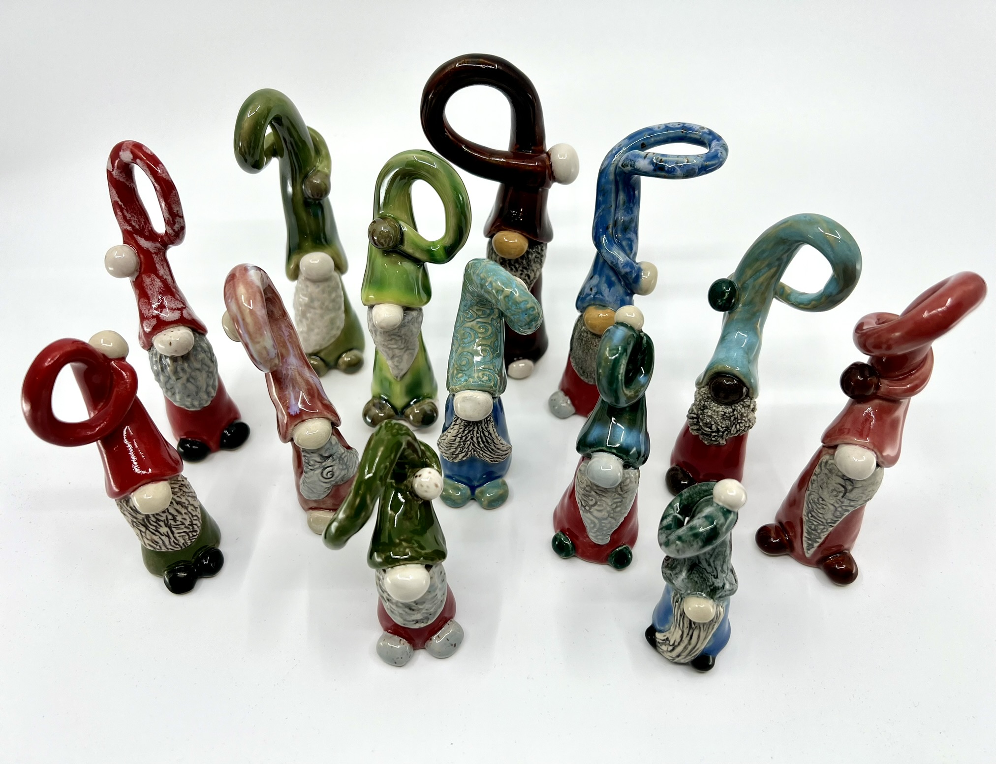 These gnomes are individually hand-sculpted, so each one is unique. I use random-sized blobs of clay to start so they vary in size, their hats are crafted with twists and curves, then I add little details like texture, funny beards, and feet to give each gnome its own character. They are glazed in a variety of fun and funky colors to cap off their personality. They come pre-strung and are ready to hang on your tree or add a touch of charm to any spot in your home including peeking out of plants! Making these little gnomes is my way to unwind after the busy holiday season and offers a playful return to the joy of creating just for the sake of it.