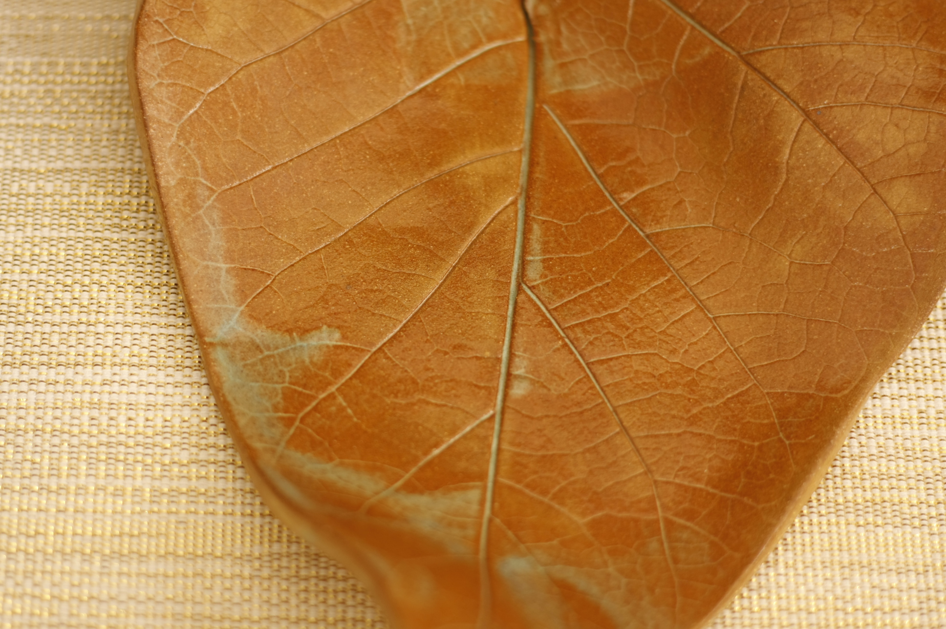 This piece was made by rolling clay into a slab. I then use real leaves to get the texture and shape. I then form them to add the a 3d quality. These trays were inspired by a beautiful Catalpa tree that I came across one day while walking my dog. I am often inspired by God's Creation and think what can I make out of that?