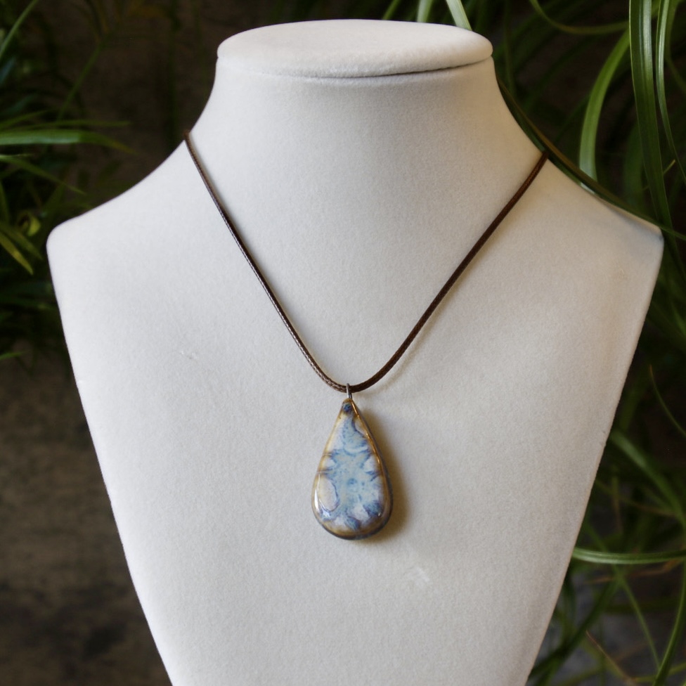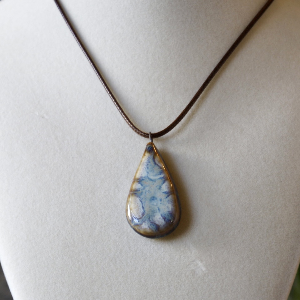 This beautiful pebble style pendant is definitely a conversation starter. It is delicate, with a beautifully mottled glaze appearance reminds me of the Petosky Stones and fossilized coral on the beaches in Northern Michigan. The 18 inch brown waxed cord, with gold clasp, is adjustable to 20 inches. Suitable for both men and women. The back of the pendant is unglazed, so feel free to add a few drops of your favorite essential oils for an uplifting or relaxing aromatherapy experience.