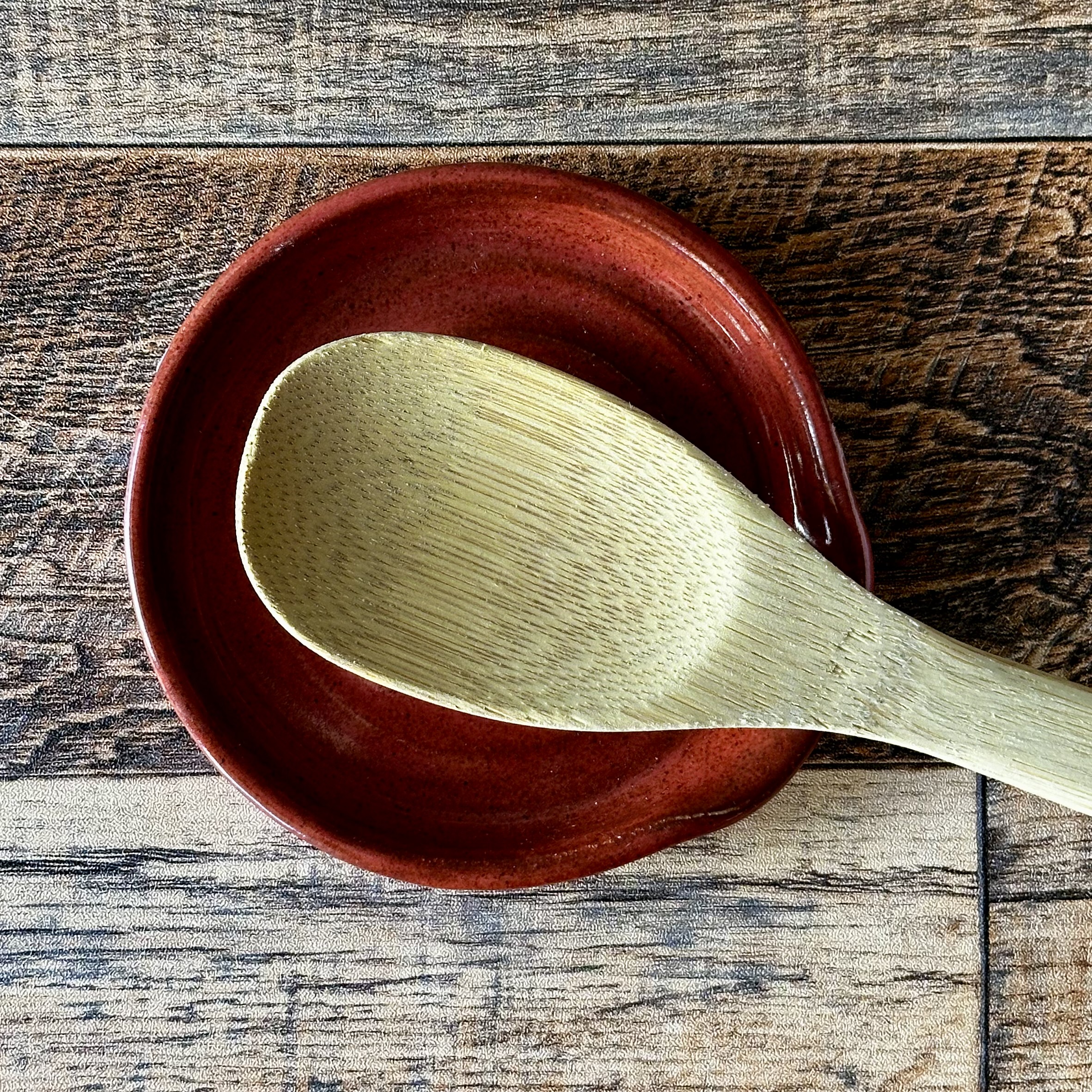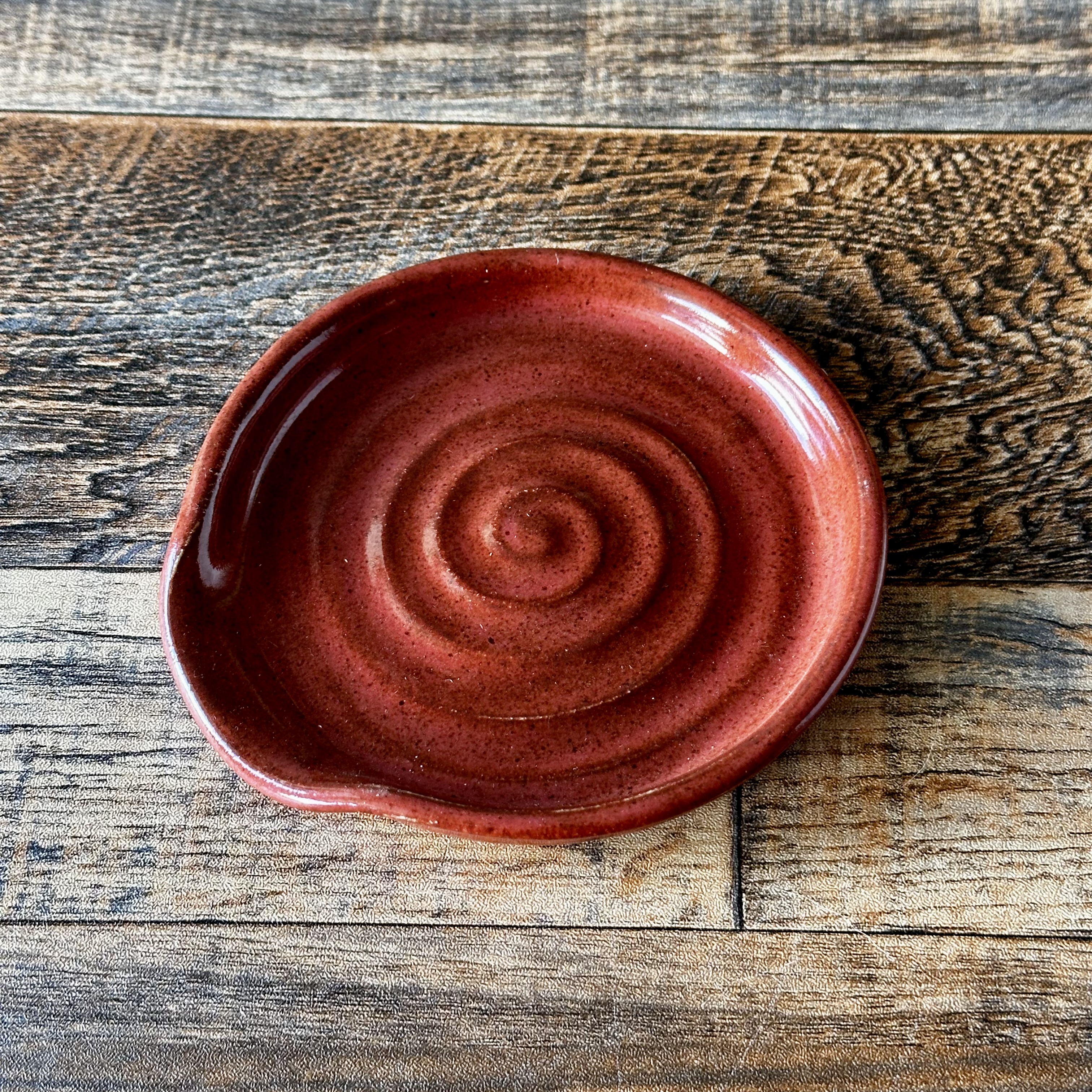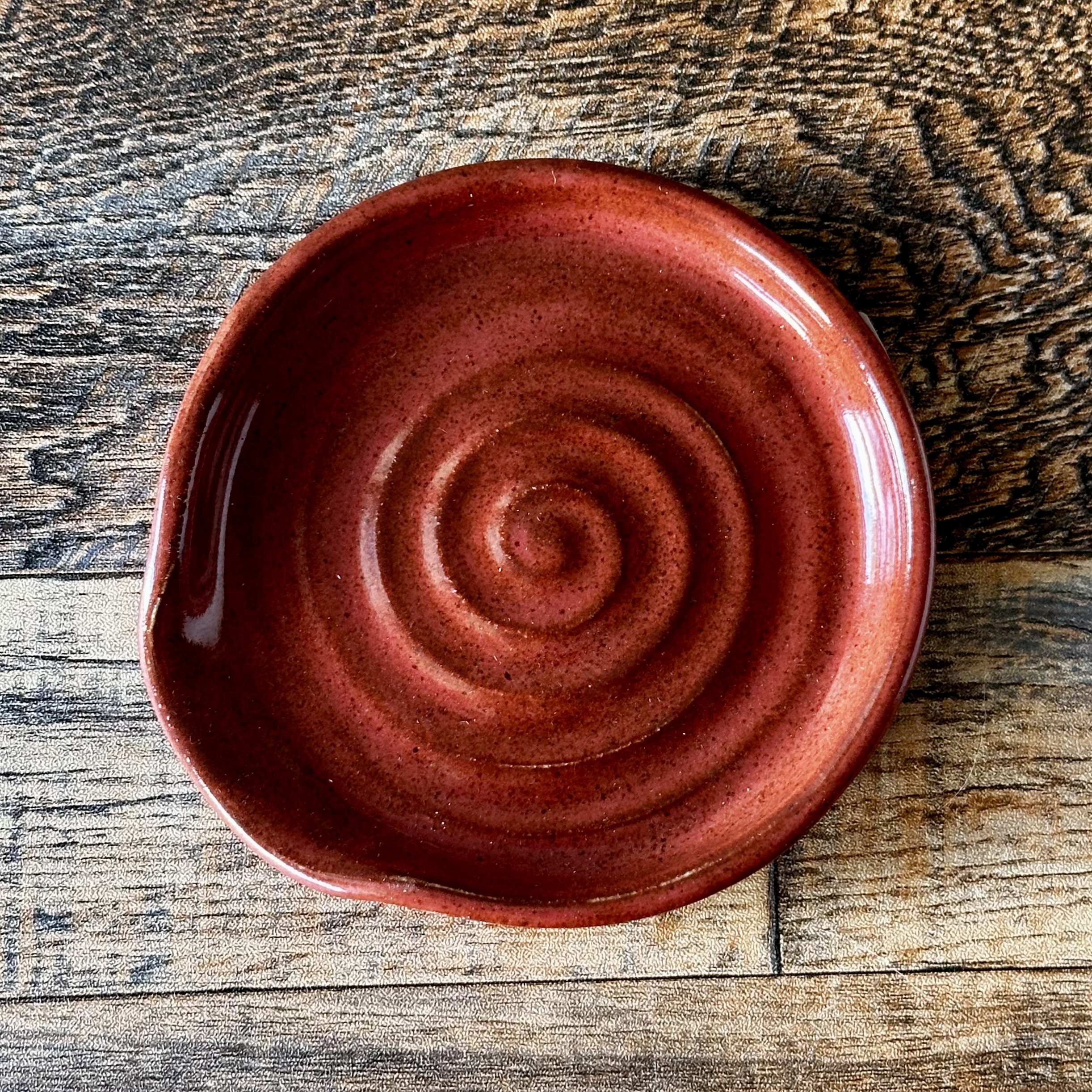 This beautiful, red spoon rest is about 5 inches across. Perfect to add a pop of color next to your stove, and holds any size utensil you may want to use. The beautiful swirl adds just the right amount of texture to elevate the piece into art. It is dishwasher and microwave safe, though I always recommend handwashing your favorite ceramic pieces.
