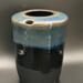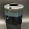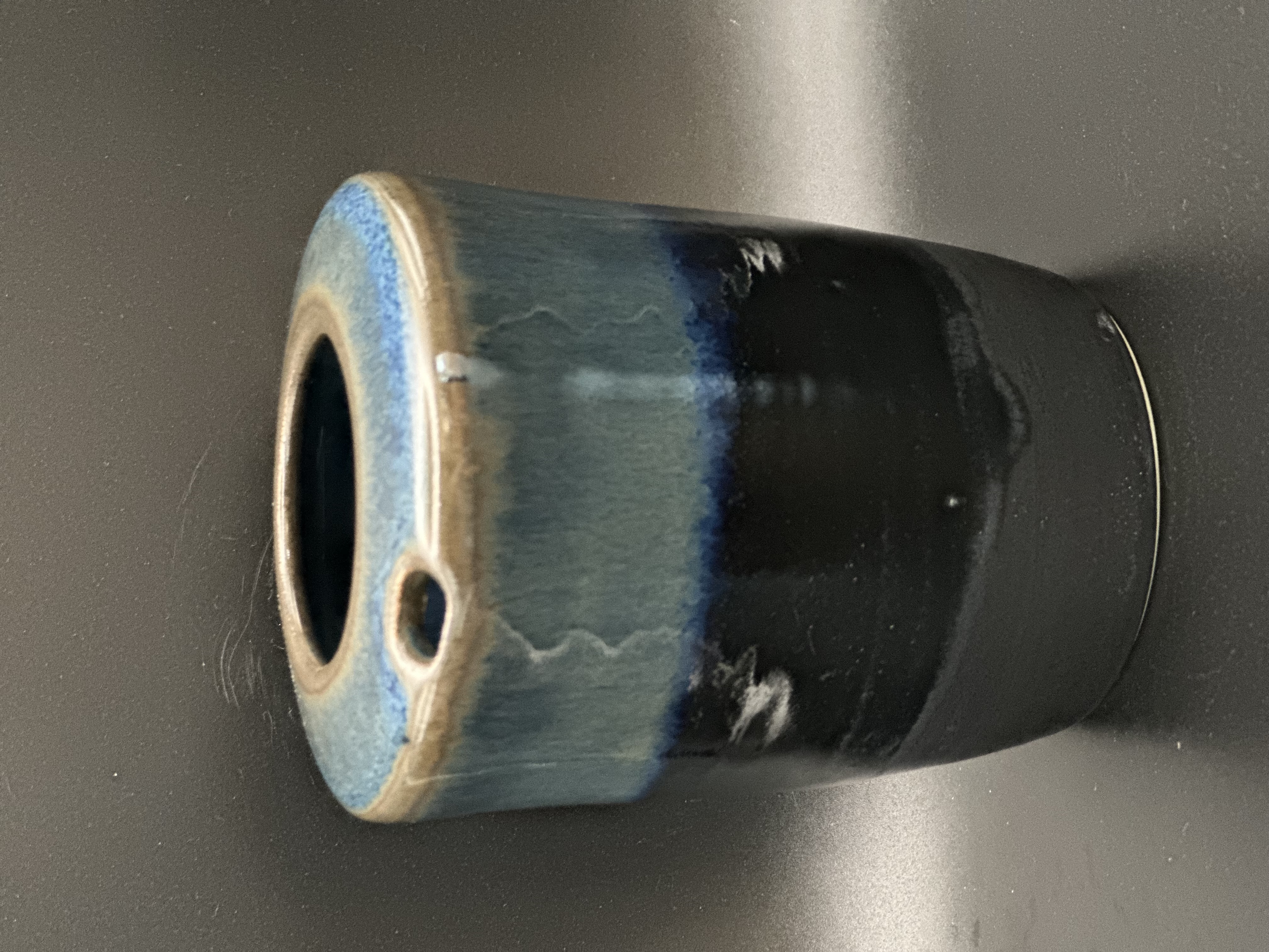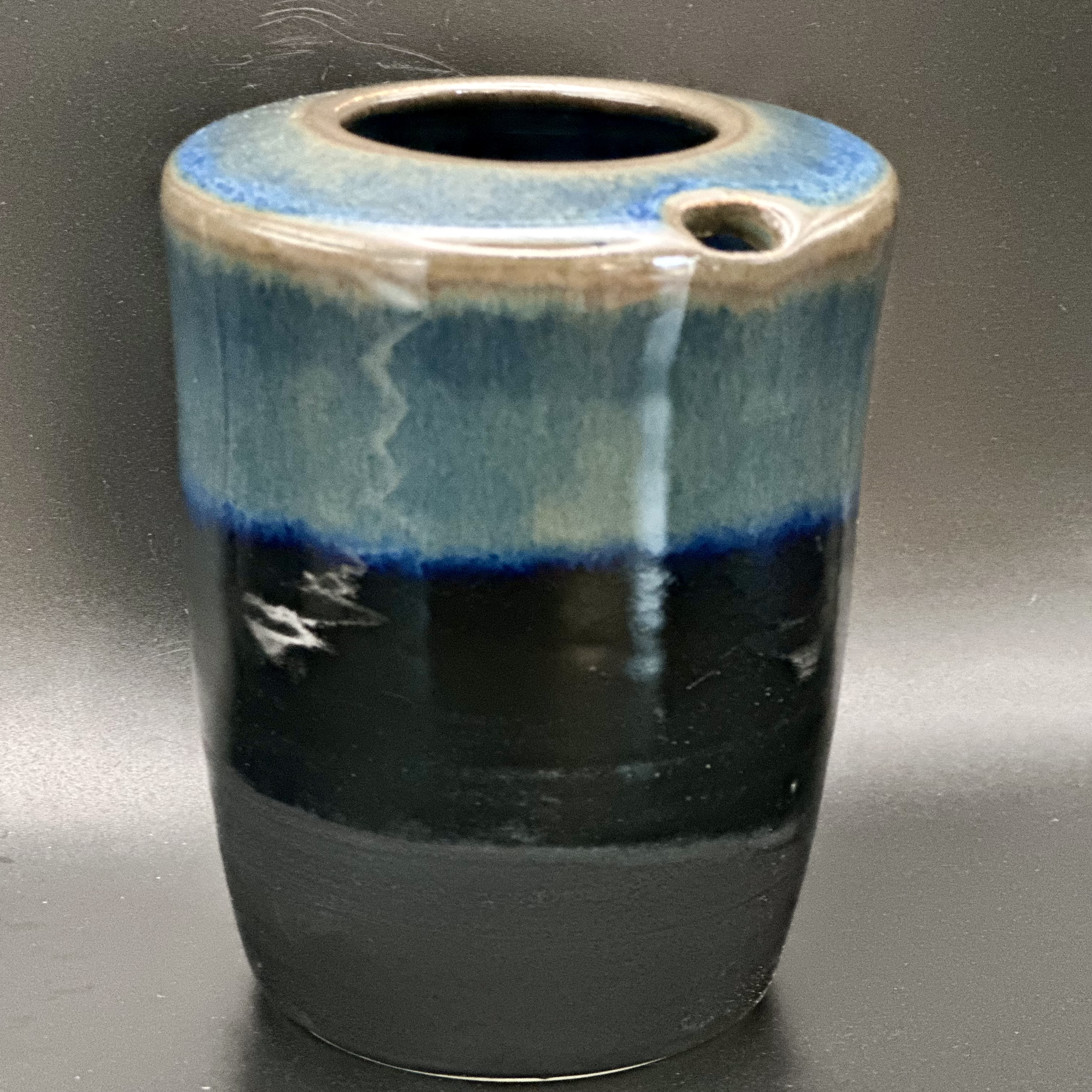 Wheel thrown travel mug with black underglaze and blue jasper glaze.