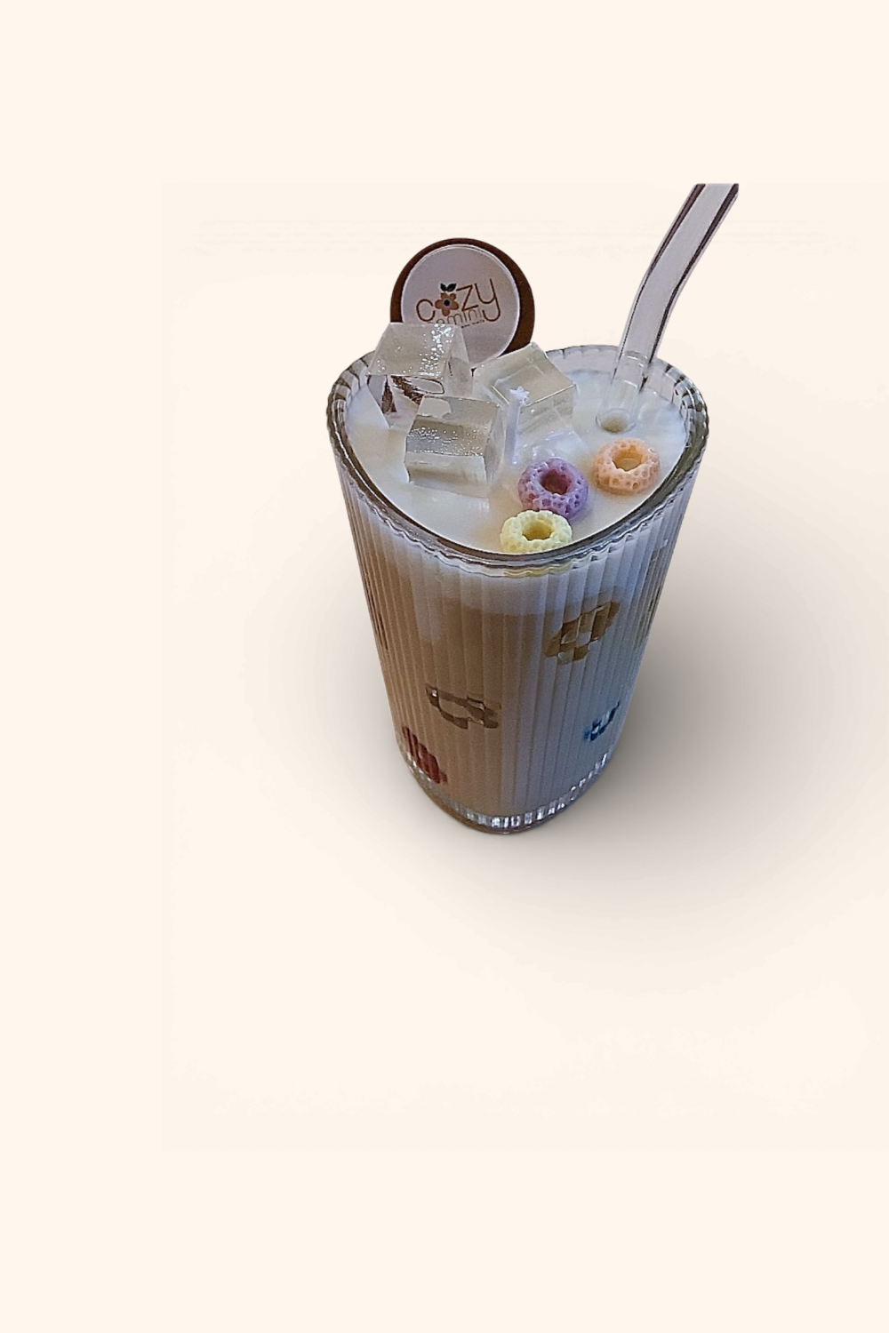 Heat safe glass straw and reusable glass topped with realistic fruity cereal pieces and gel wax “ice” cubes