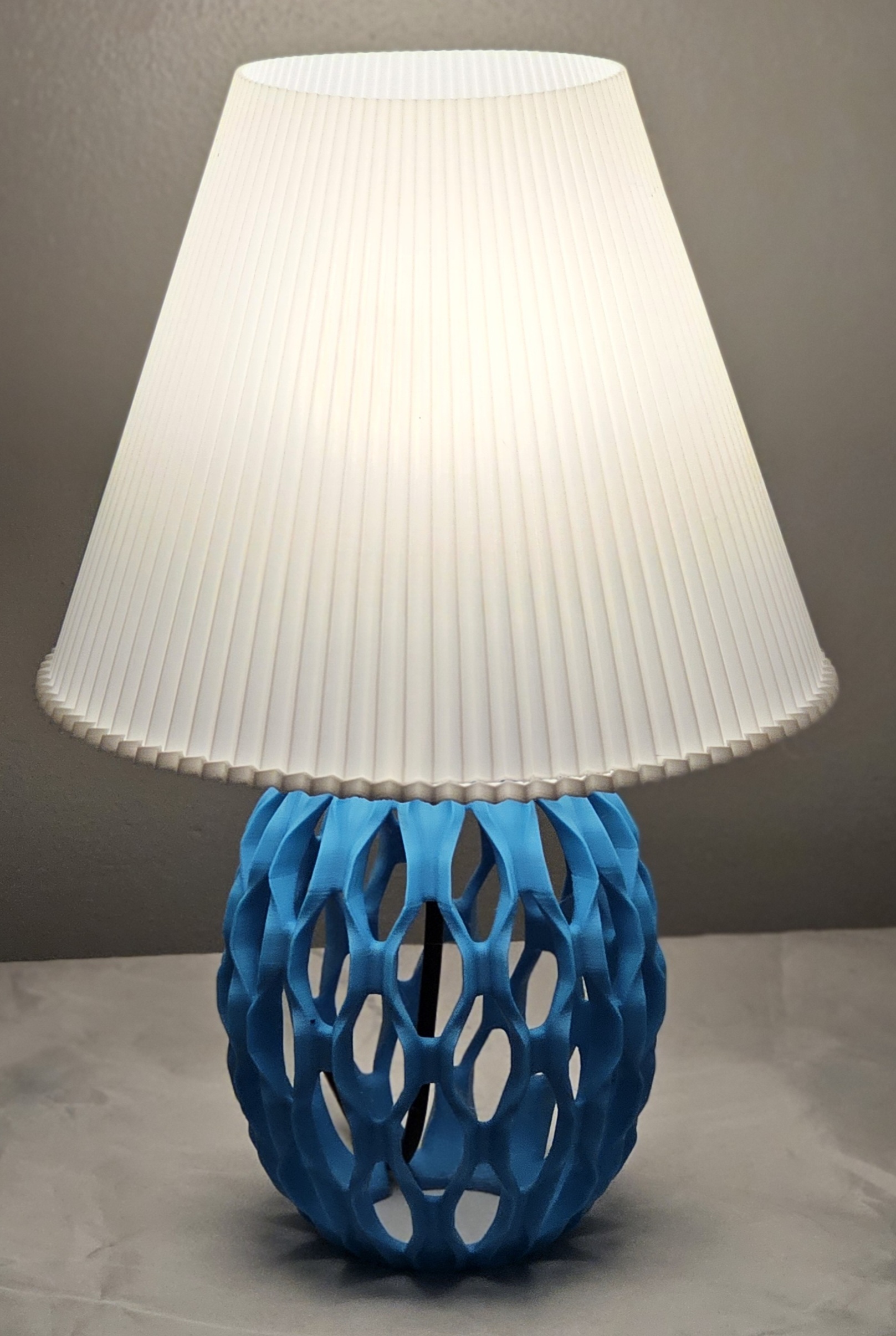 This table lamp is 3D printed and ready for your LED bulb. It is designed by Modern Machine. Lamp stands approximately 14 inches high. The lampshade is approximately 8 inches at its widest point. Lamp base is 3D printed in a bright blue color.